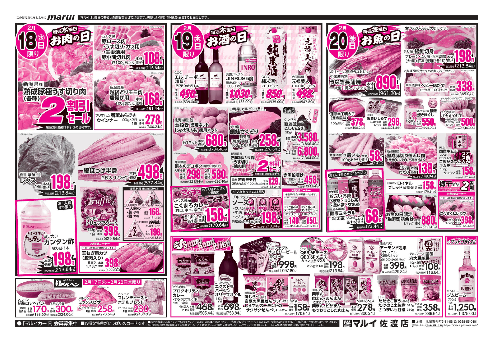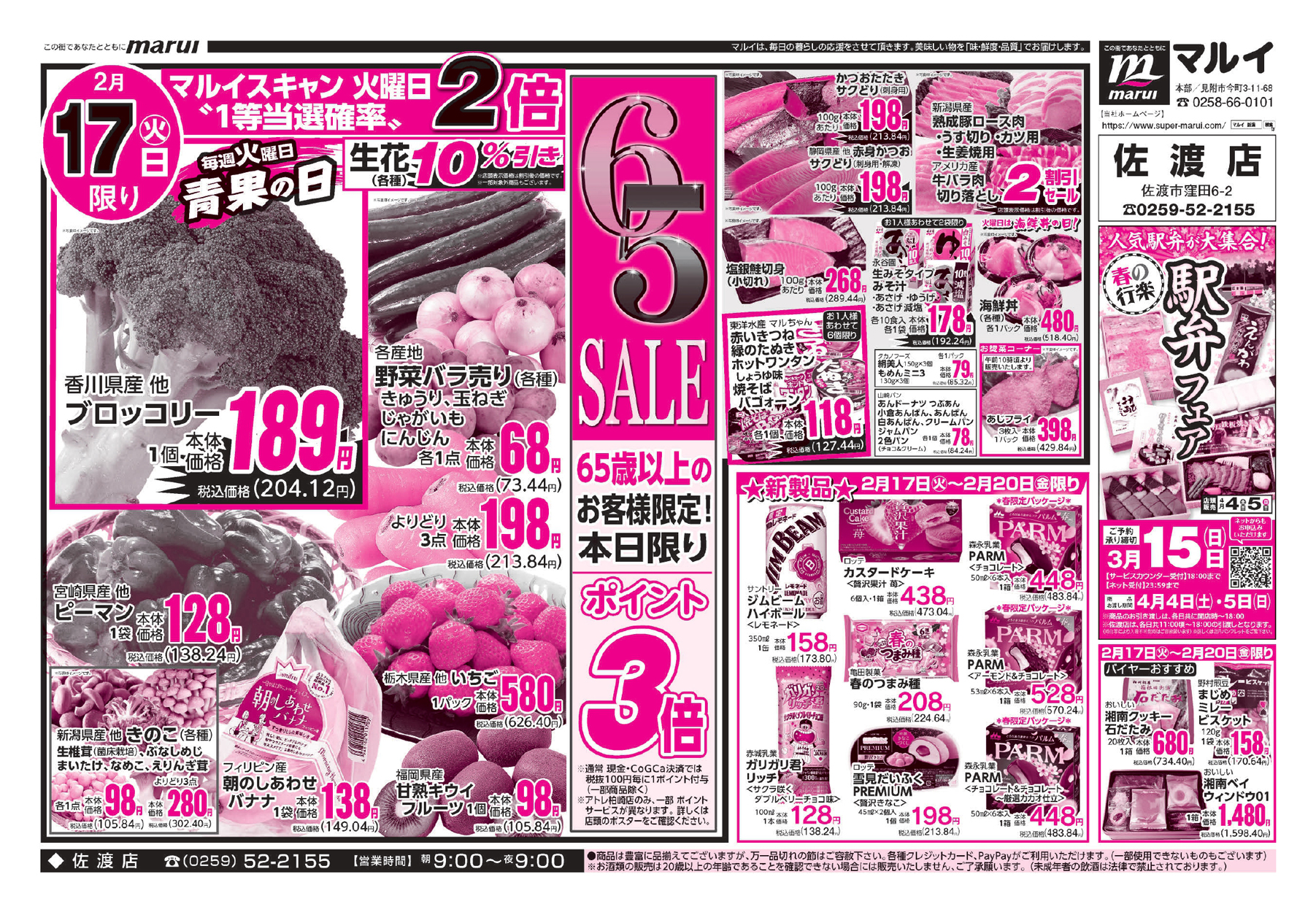 株式会社マルイ 【マルイ佐渡店チラシ】65SALE 掲載期間:2026年2月16日〜2026年2月20日 佐渡 スーパーマルイ 画像をクリックして拡大 prev next セール・新店情報を見逃さない! ガタチラをホーム画面に追加して、 最新情報をすぐチェック▶追加方法はかんたん♪ 関連 65歳以上はポイント3倍よ!