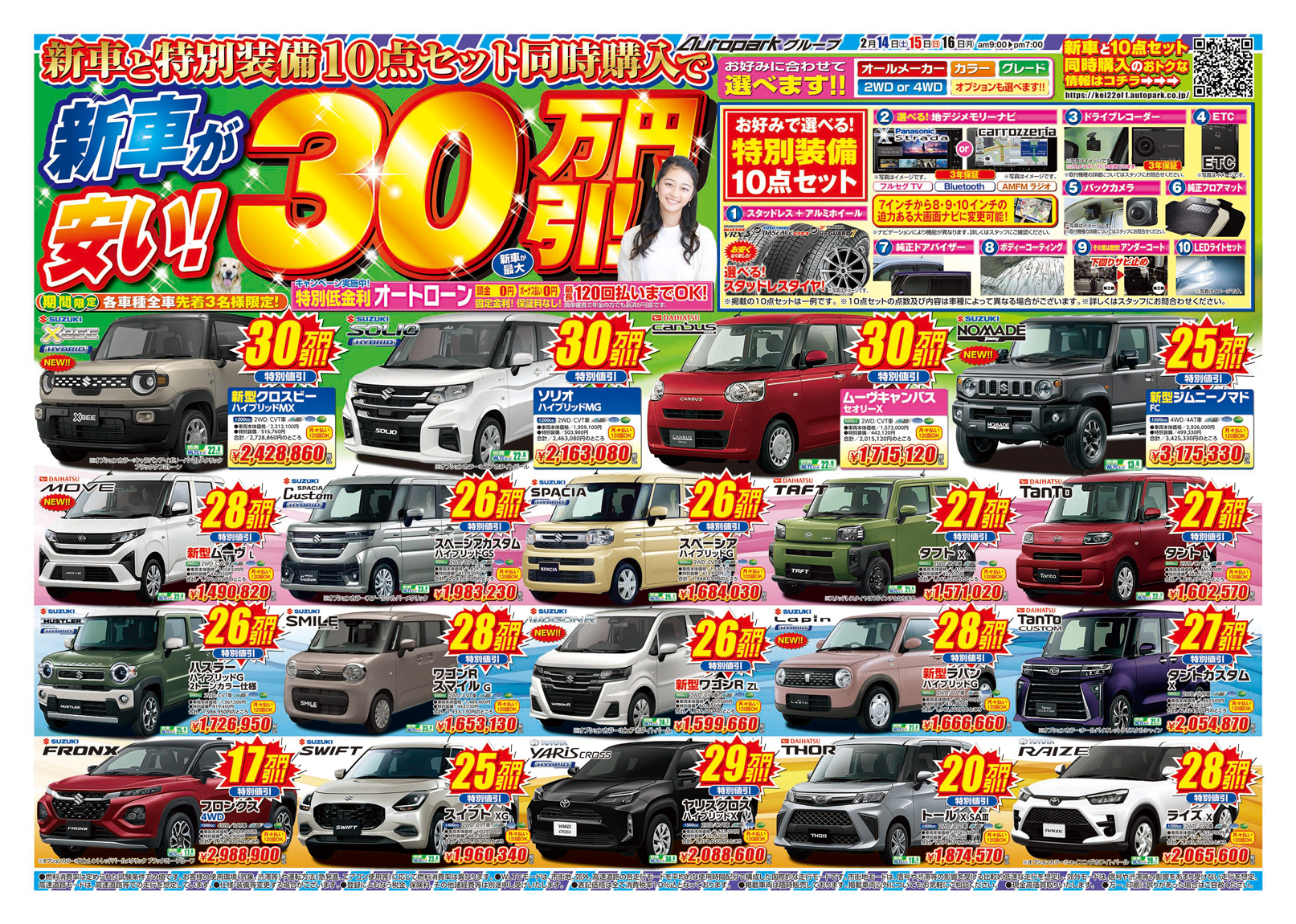 オートパーク 【オートパーク六日町チラシ】新車が安い!30万円引! 掲載期間:2026年2月14日〜2026年2月16日 中越 車・カー用品 画像をクリックして拡大 prev next セール・新店情報を見逃さない! ガタチラをホーム画面に追加して、 最新情報をすぐチェック▶追加方法はかんたん♪ 関連 新車がとってもお買い得ね!