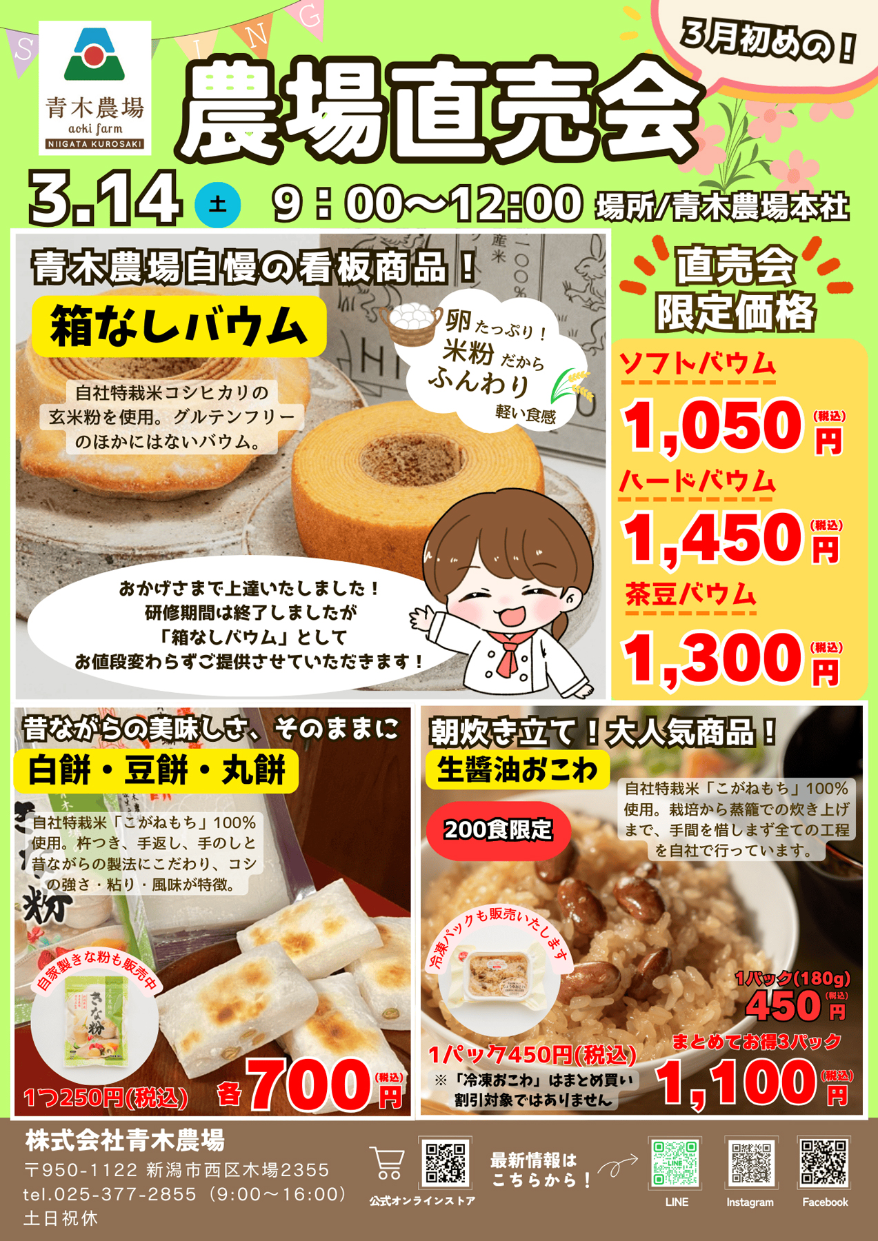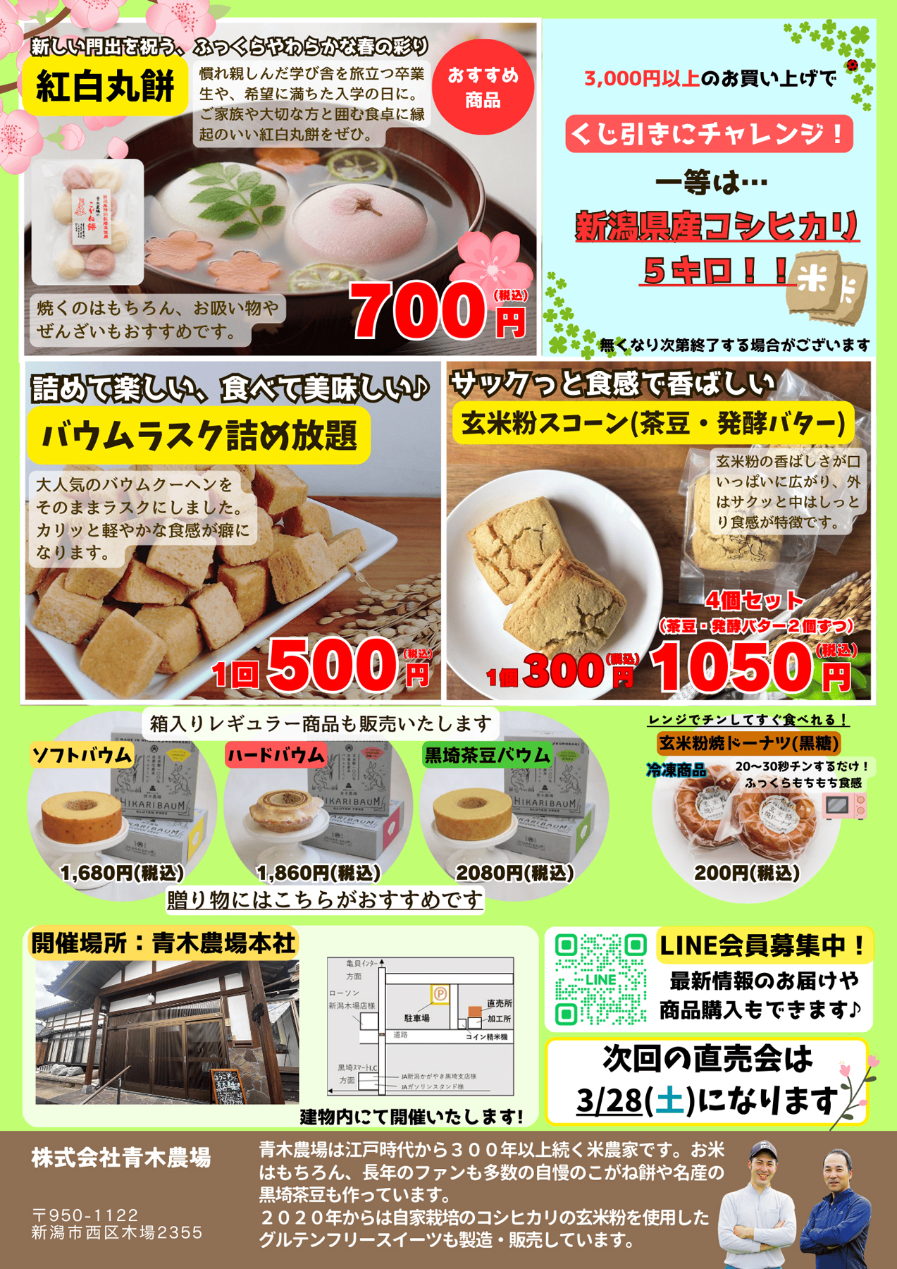青木農場 【青木農場チラシ】3月農場直売会 掲載期間:2026年3月6日〜2026年3月14日 新潟市 生活サービス 画像をクリックして拡大 prev next セール・新店情報を見逃さない! ガタチラをホーム画面に追加して、 最新情報をすぐチェック▶追加方法はかんたん♪ 関連 バウムクーヘンが箱なしでお買い得ね! スコーンもおいしそう♪