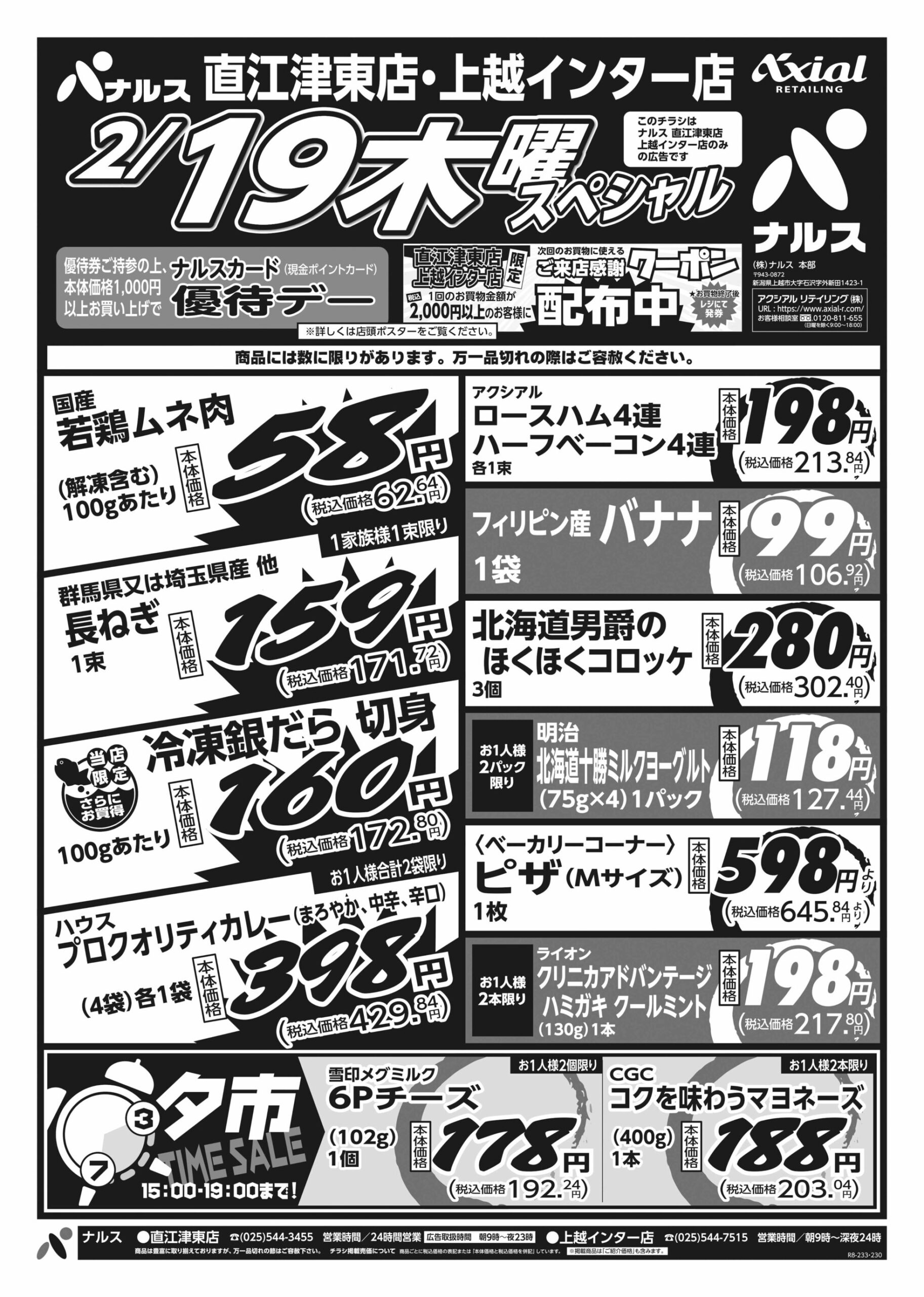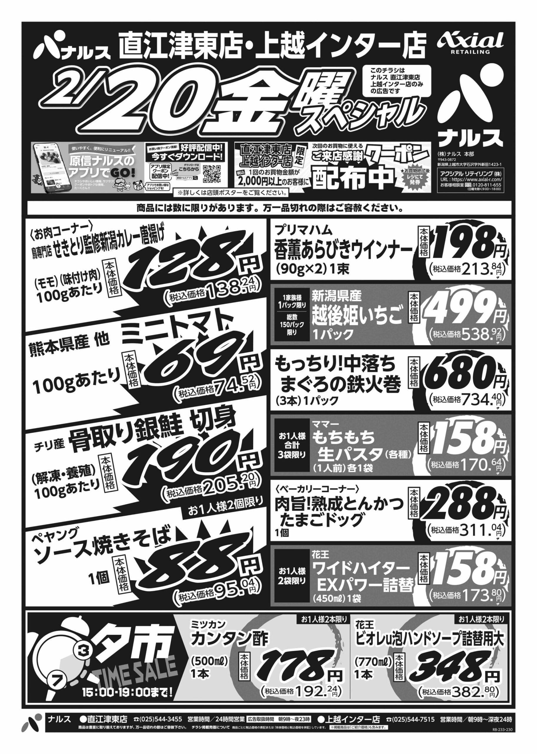 原信ナルス 【原信ナルス直江津東店&上越インター店チラシ】木曜スペシャル/金曜スペシャル 掲載期間:2026年2月19日〜2026年2月20日 上越 スーパー原信ナルス 画像をクリックして拡大 prev next 対象:直江津東店・上越インター店 セール・新店情報を見逃さない! ガタチラをホーム画面に追加して、 最新情報をすぐチェック▶追加方法はかんたん♪ 関連 金曜日はせきとり監修新潟カレー唐揚げがお買い得ですって!