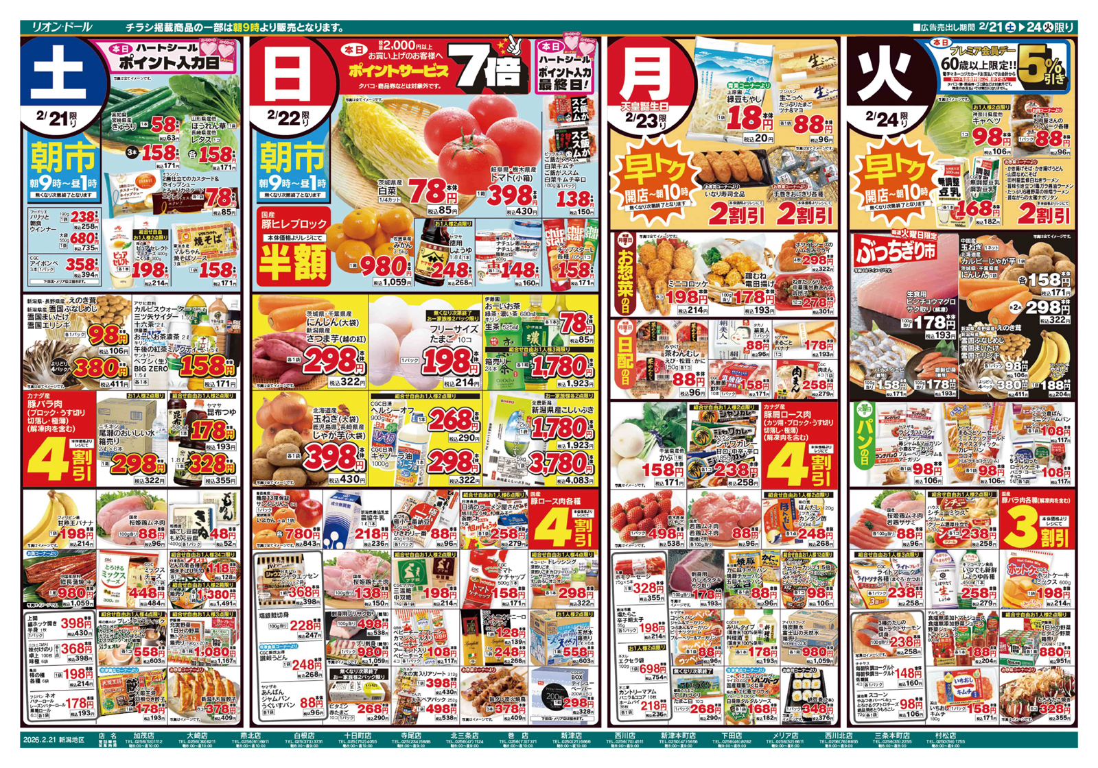 (株)リオン・ドールコーポレーション 【リオン・ドールチラシ】春待ちメニュー 掲載期間:2026年2月21日〜2026年2月24日 中越新潟市下越 スーパーリオン・ドール 画像をクリックして拡大 prev next 「リオン・ドール」のホームページはこちらから セール・新店情報を見逃さない! ガタチラをホーム画面に追加して、 最新情報をすぐチェック▶追加方法はかんたん♪ 関連 春野菜のせいろ蒸し、おいしそう! 今晩の夕食メニューにしましょう♪