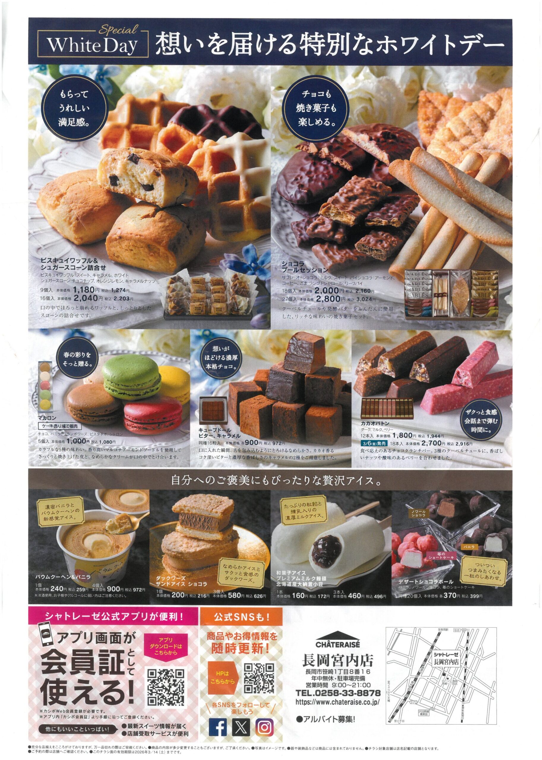 シャトレーゼ長岡宮内店 【シャトレーゼ長岡宮内店チラシ】ひなまつり/ホワイトデー 掲載期間:2026年2月28日〜2026年3月3日 中越 グルメ 画像をクリックして拡大 prev next セール・新店情報を見逃さない! ガタチラをホーム画面に追加して、 最新情報をすぐチェック▶追加方法はかんたん♪ 関連 卵や小麦を使っていないケーキで、アレルギーの子も一緒に食べられるわね!