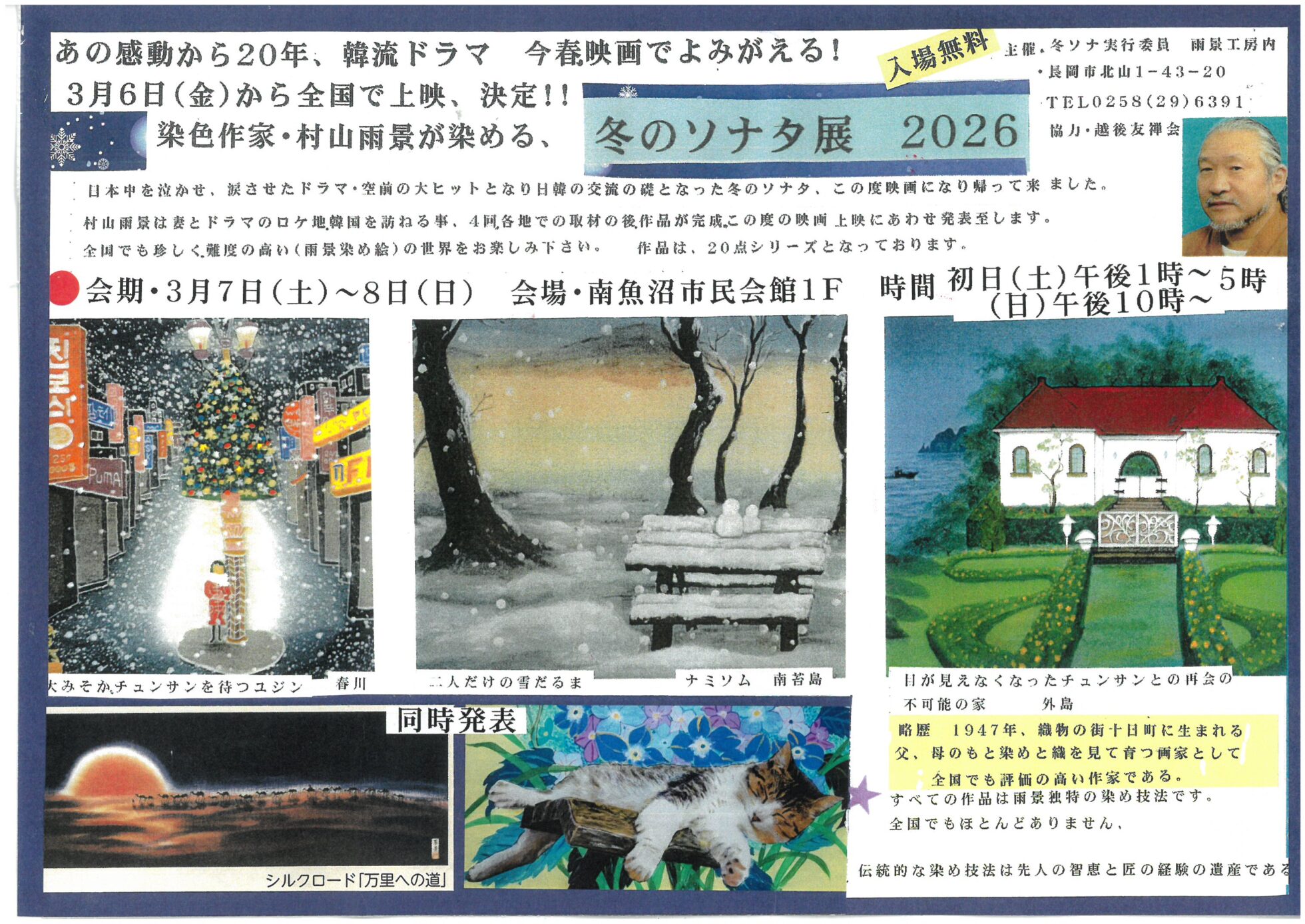 村山雨景 【村山雨景チラシ】冬のソナタ展 2026 in 南魚沼市民会館 掲載期間:2026年3月6日〜2026年3月8日 中越 イベント 画像をクリックして拡大 prev next セール・新店情報を見逃さない! ガタチラをホーム画面に追加して、 最新情報をすぐチェック▶追加方法はかんたん♪ 関連 これを見ただけであの曲が頭の中に流れるわ♪ 映画も、展覧会も楽しみ!