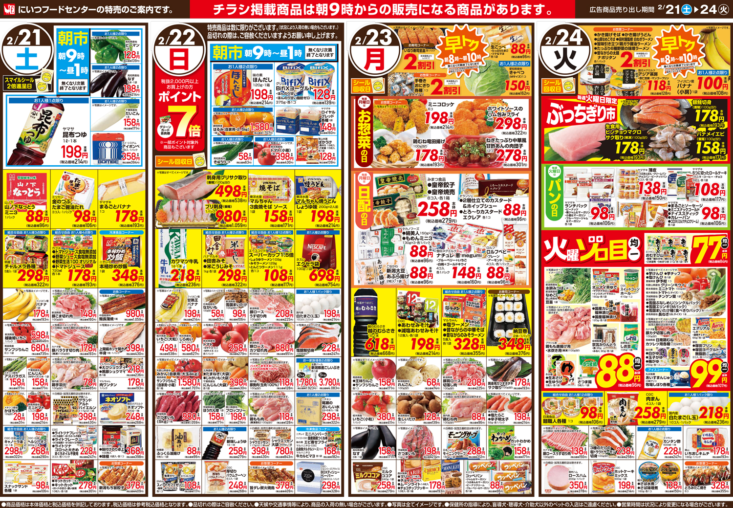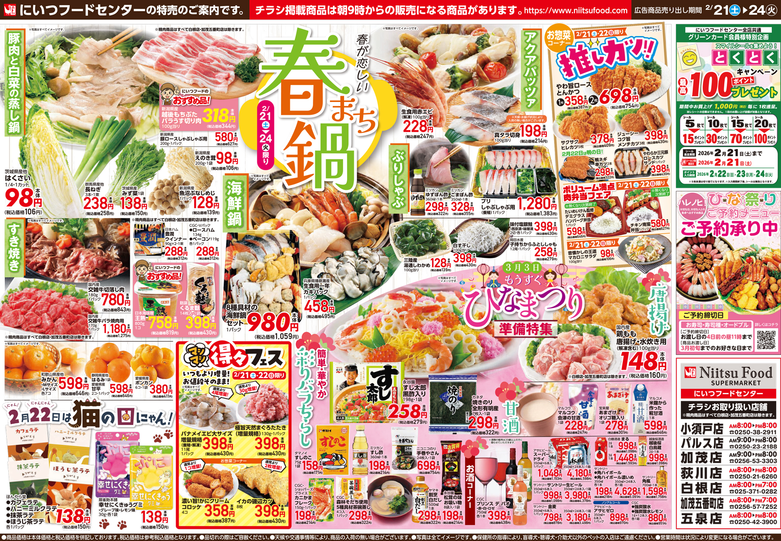 にいつフードセンター 【にいつフードセンターチラシ】春が恋しい 春まち鍋 掲載期間:2026年2月21日〜2026年2月24日 中越新潟市下越 スーパーにいつフードセンター 画像をクリックして拡大 prev next セール・新店情報を見逃さない! ガタチラをホーム画面に追加して、 最新情報をすぐチェック▶追加方法はかんたん♪ 関連 ぶりしゃぶ食べたいわ~♪