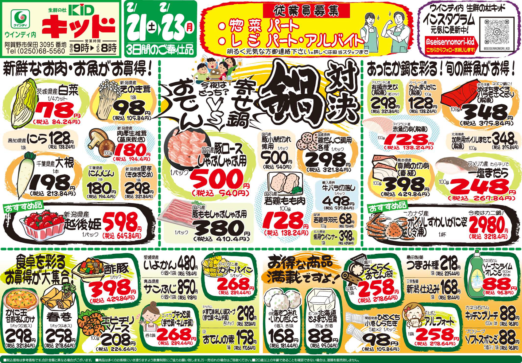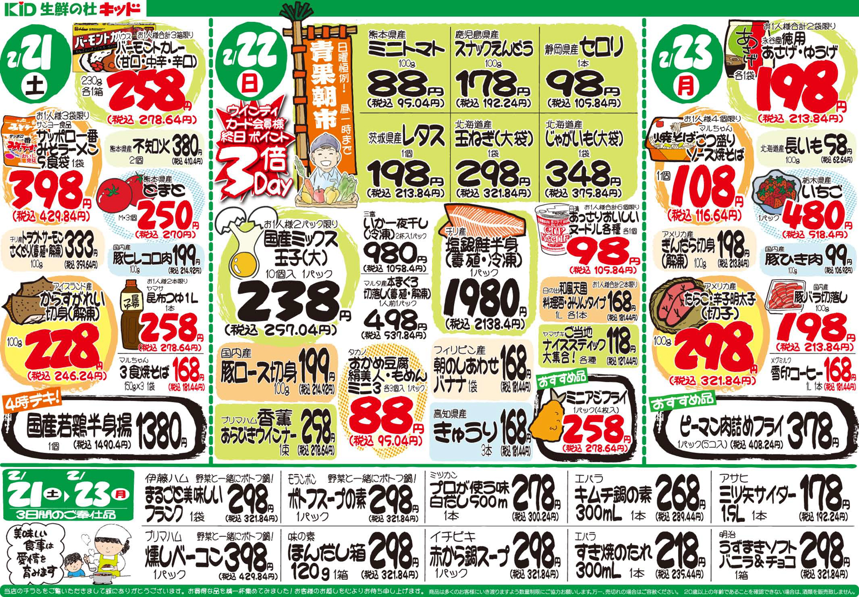 キッド 【生鮮の杜キッドチラシ】今夜はどっち? おでんVS寄せ鍋 鍋対決 掲載期間:2026年2月21日〜2026年2月23日 下越 スーパー 画像をクリックして拡大 prev next セール・新店情報を見逃さない! ガタチラをホーム画面に追加して、 最新情報をすぐチェック▶追加方法はかんたん♪ 関連 私はおでんが食べたいわ~♪