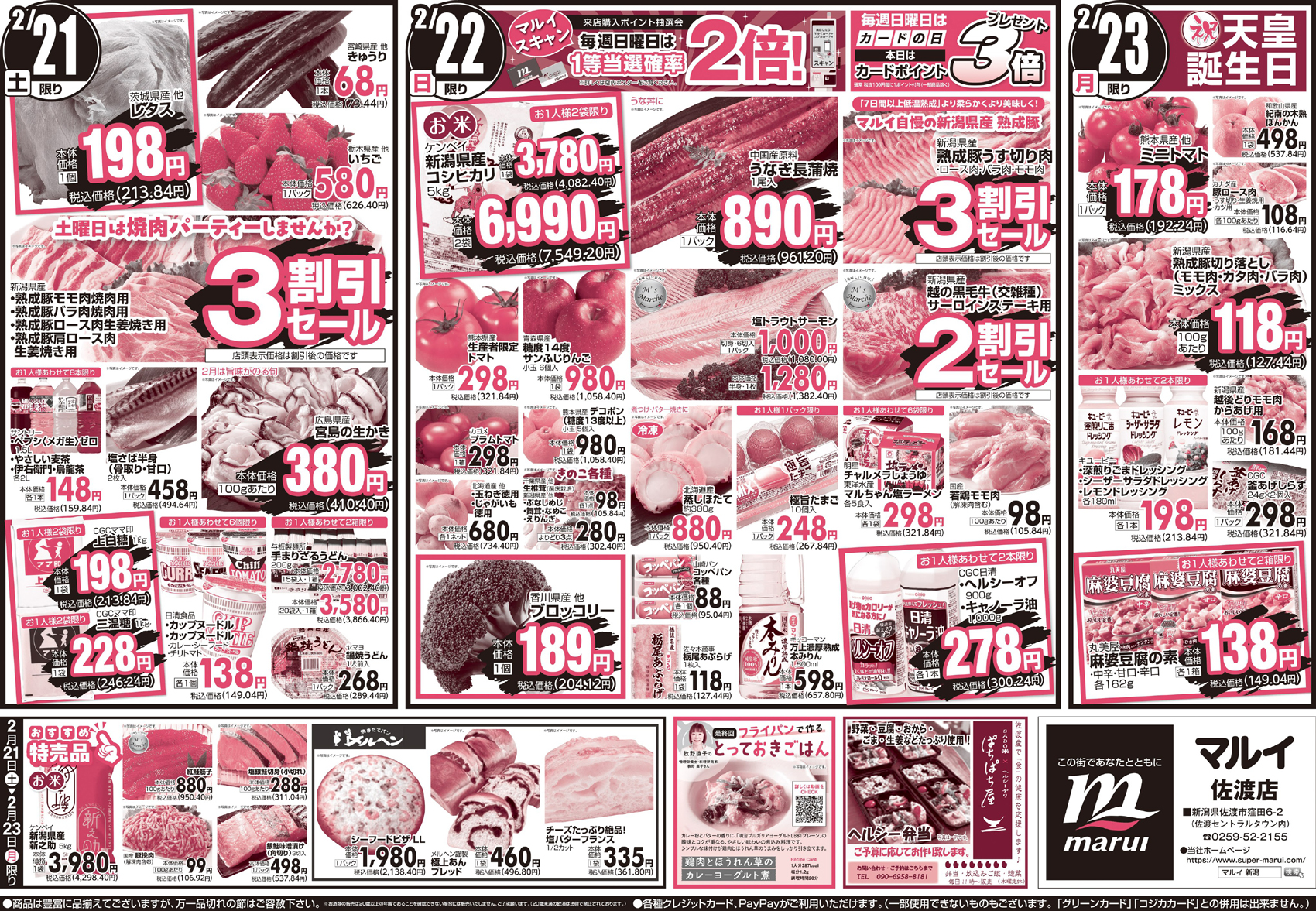 株式会社マルイ 【マルイ佐渡店チラシ】3連休初春のご馳走 掲載期間:2026年2月20日〜2026年2月23日 佐渡 スーパーマルイ 画像をクリックして拡大 prev next セール・新店情報を見逃さない! ガタチラをホーム画面に追加して、 最新情報をすぐチェック▶追加方法はかんたん♪ 関連 お寿司食べたいな~♪
