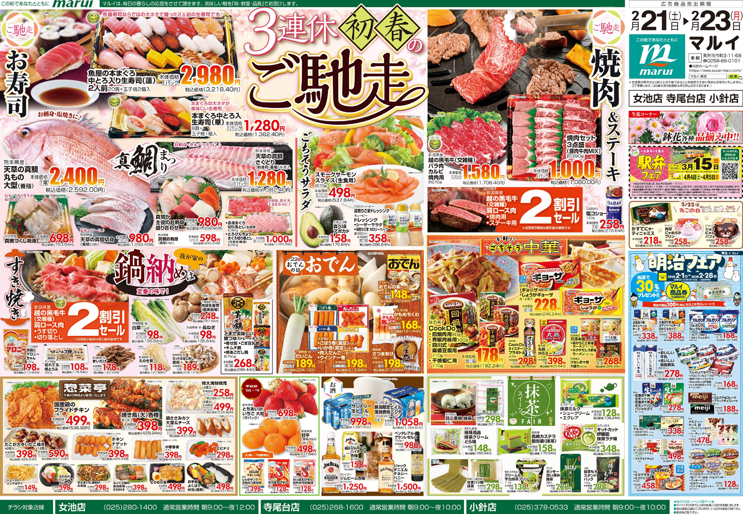 株式会社マルイ 【マルイチラシ】3連休初春のご馳走 掲載期間:2026年2月21日〜2026年2月23日 中越新潟市下越 スーパーマルイ 目次 各店 女池店・寺尾台店・小針店 中之島店・長岡新組店・長岡学校町店・与板店・寺泊店・栃尾店・長岡駅前店 各店 画像をクリックして拡大 prev next 女池店・寺尾台店・小針店 画像をクリックして拡大 prev next 中之島店・長岡新組店・長岡学校町店・与板店・寺泊店・栃尾店・長岡駅前店 画像をクリックして拡大 prev next セール・新店情報を見逃さない! ガタチラをホーム画面に追加して、 最新情報をすぐチェック▶追加方法はかんたん♪ 関連 真鯛がとってもおいしそうだわ~♪