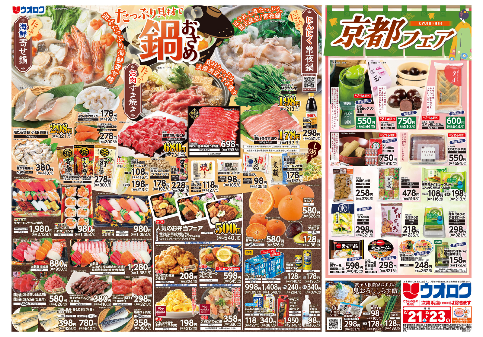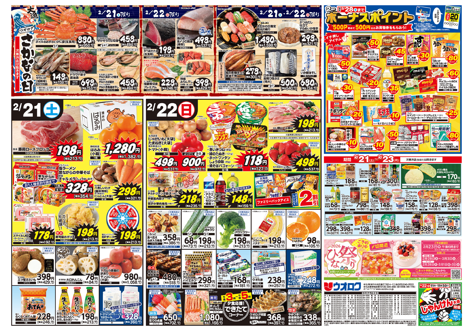 ウオロク 【ウオロクチラシ】たっぷり具材で鍋おさめ 掲載期間:2026年2月21日〜2026年2月23日 上越中越新潟市下越 スーパーウオロク 画像をクリックして拡大 prev next 対象:全店 セール・新店情報を見逃さない! ガタチラをホーム画面に追加して、 最新情報をすぐチェック▶追加方法はかんたん♪ 関連 「にんにく常夜鍋」作ってみようかしら~♪