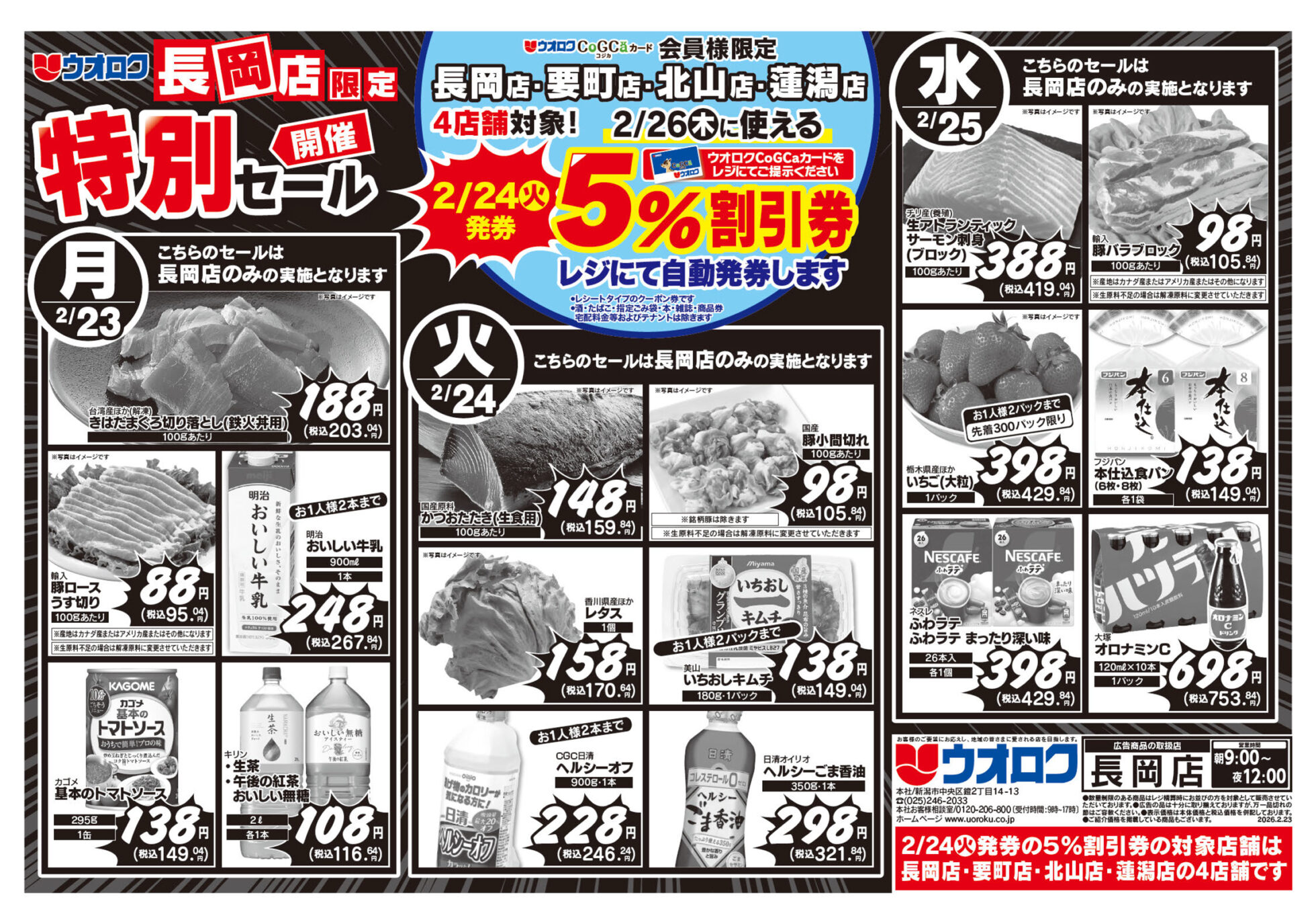 ウオロク 【ウオロク長岡店チラシ】長岡店限定 特別セール開催 掲載期間:2026年2月23日〜2026年2月27日 中越 スーパーウオロク 画像をクリックして拡大 prev next セール・新店情報を見逃さない! ガタチラをホーム画面に追加して、 最新情報をすぐチェック▶追加方法はかんたん♪ 関連 鉄火丼で晩ご飯は決まりね♪