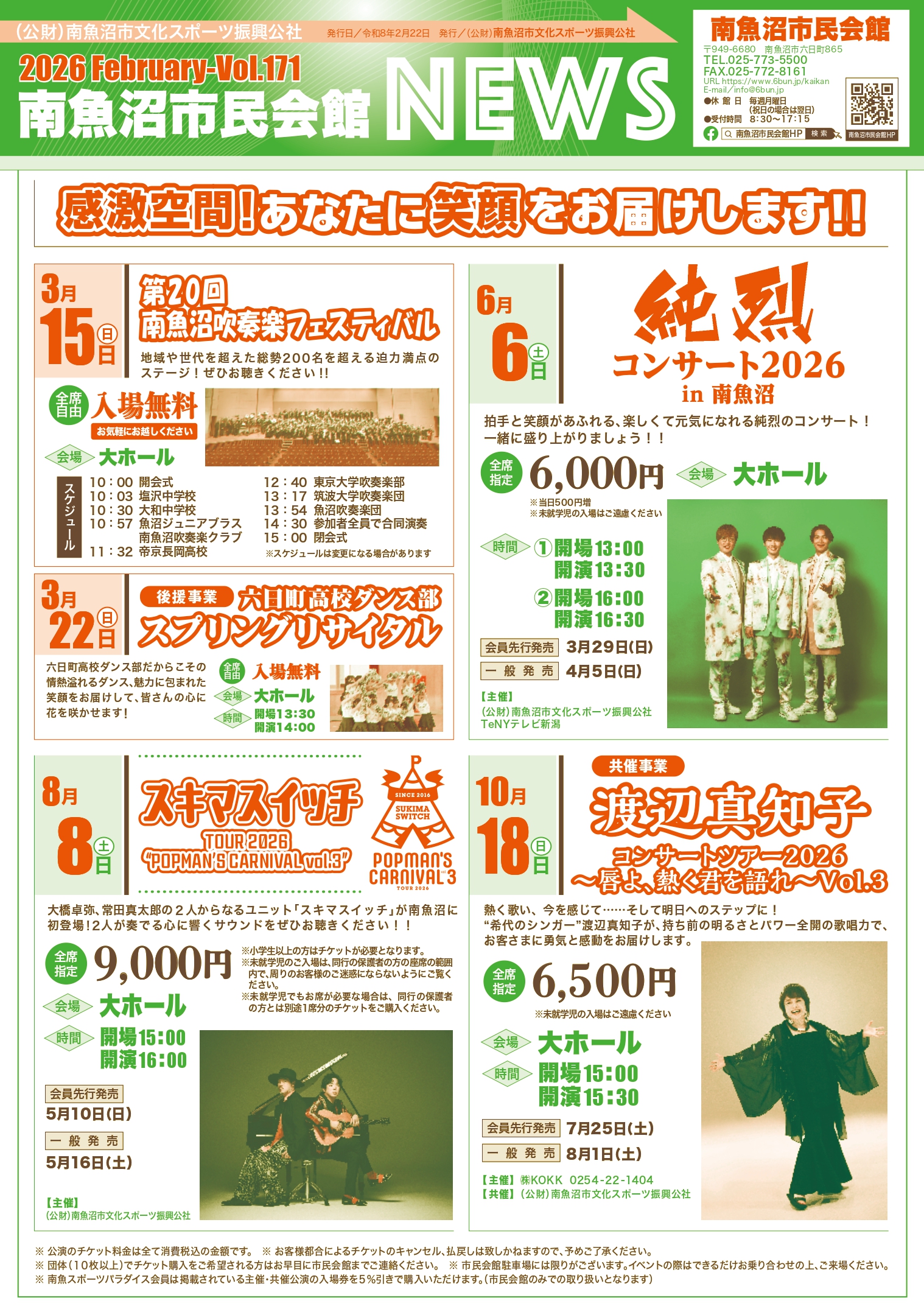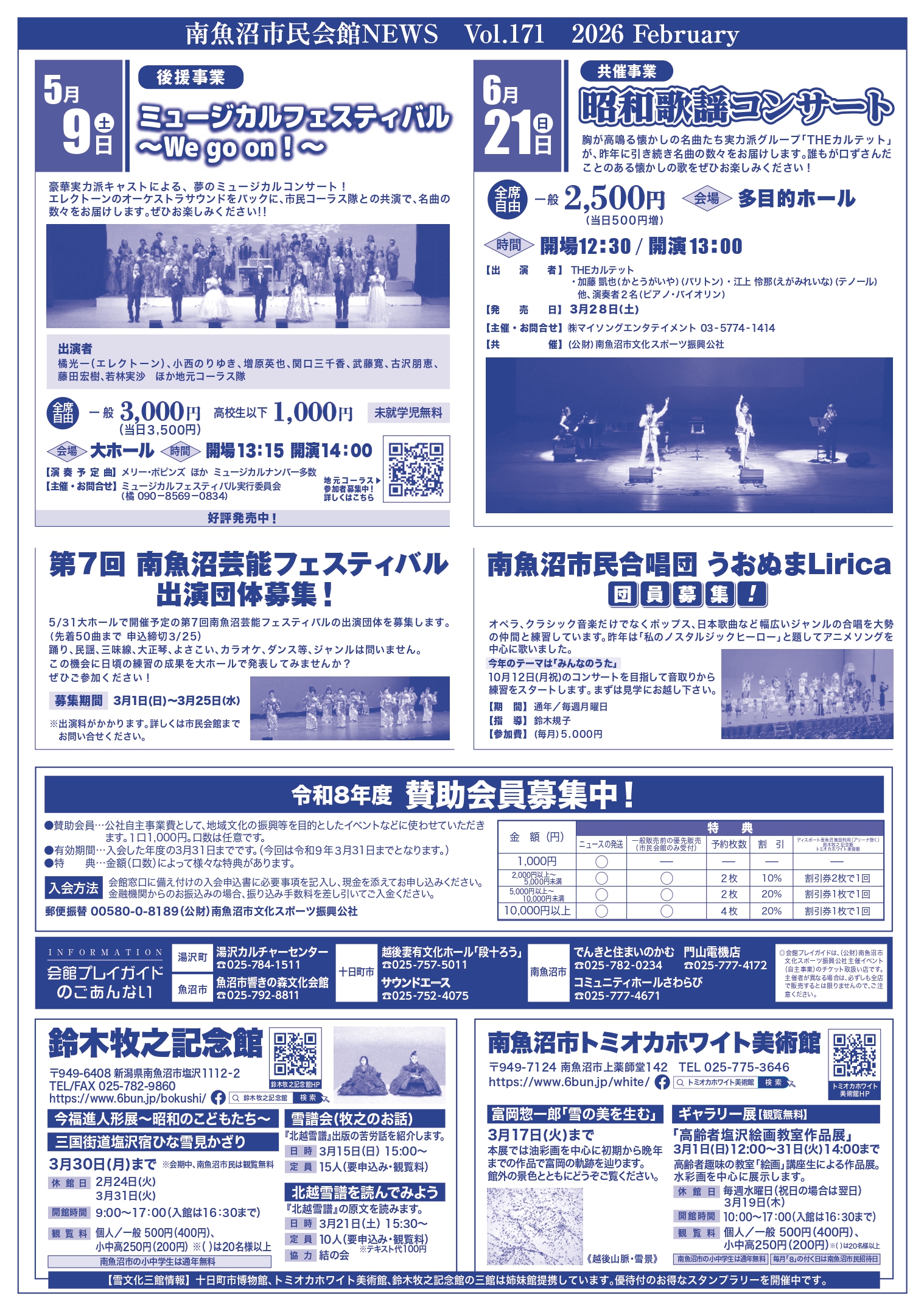 南魚沼市民会館 【南魚沼市民会館チラシ】会館NEWS 171号 掲載期間:2026年2月23日〜2026年3月31日 中越 イベント 画像をクリックして拡大 prev next セール・新店情報を見逃さない! ガタチラをホーム画面に追加して、 最新情報をすぐチェック▶追加方法はかんたん♪ 関連 豪華なイベントが盛り沢山だわ♪