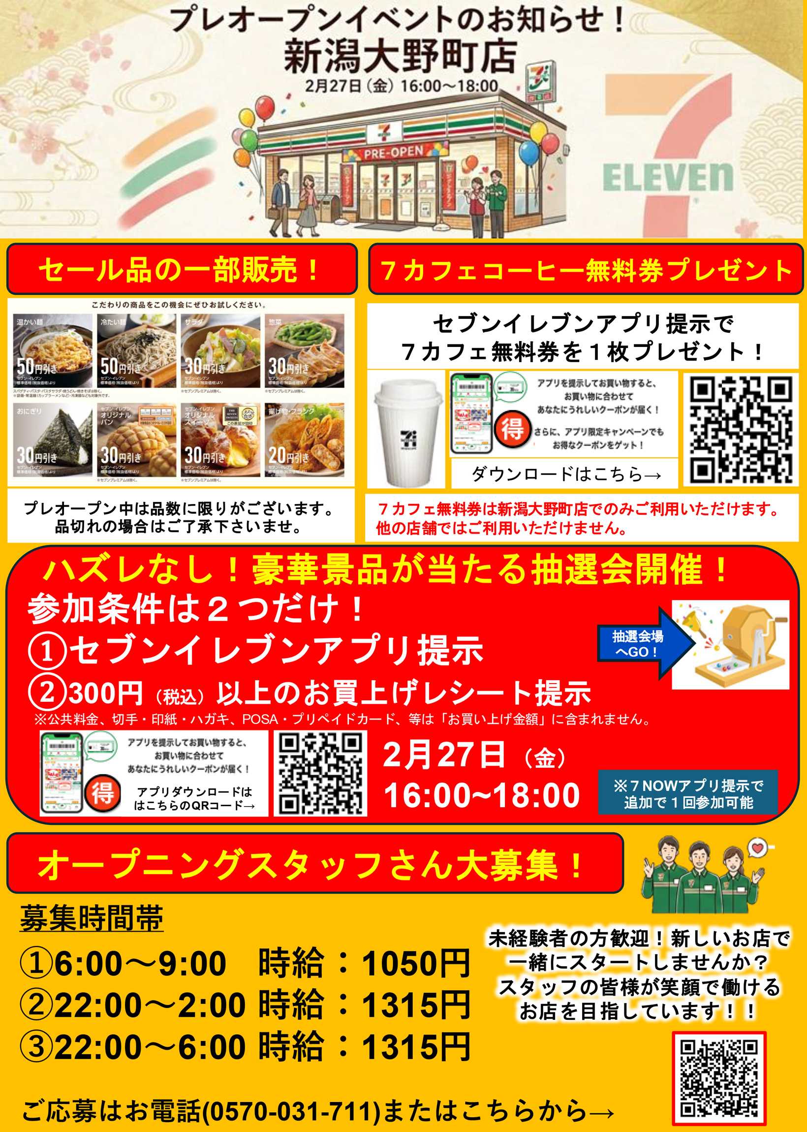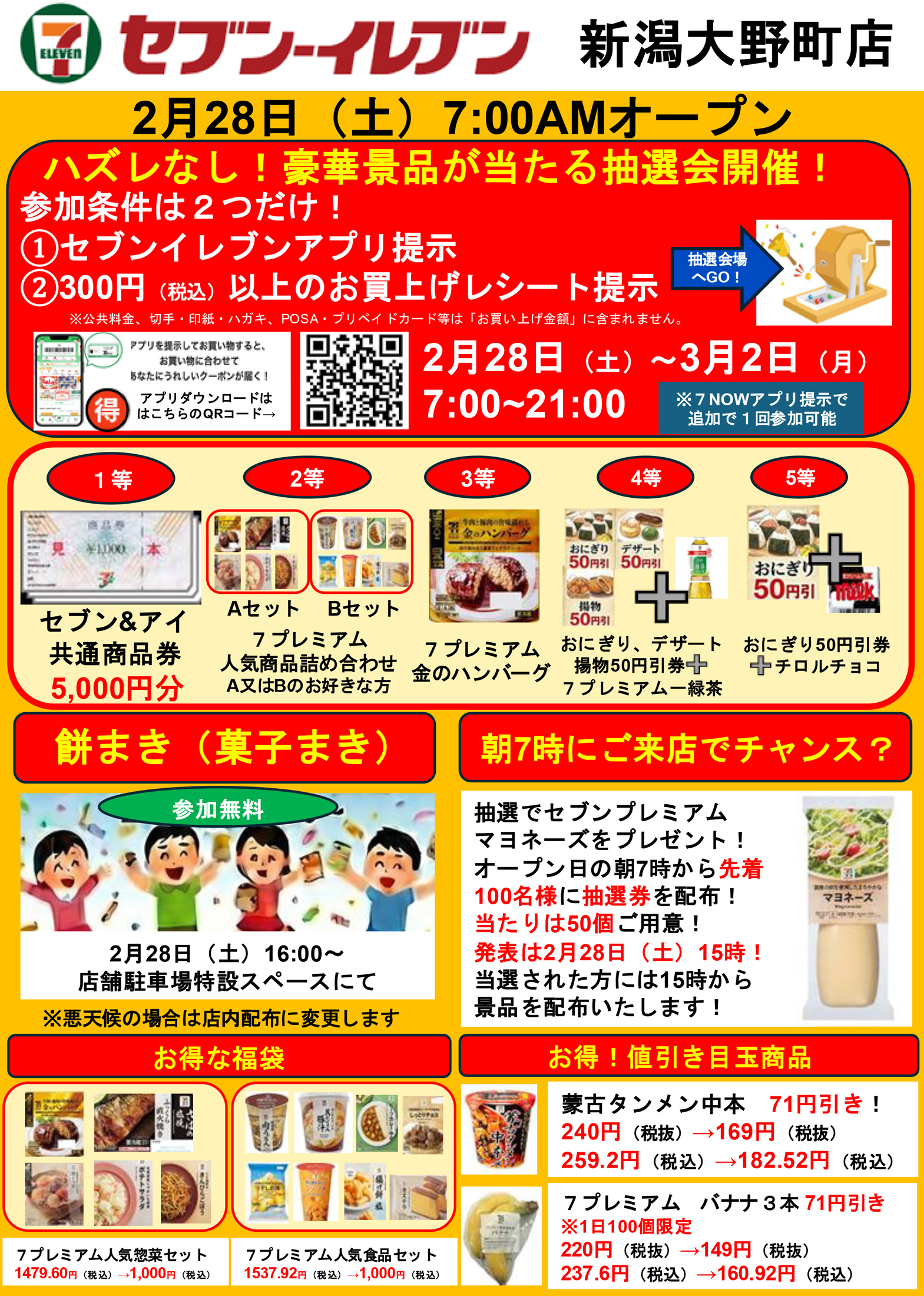 セブンイレブン大野町店 【セブンイレブン大野町店チラシ】豪華景品が当たる抽選会開催 掲載期間:2026年2月28日〜2026年3月2日 新潟市 生活サービス 画像をクリックして拡大 prev next セール・新店情報を見逃さない! ガタチラをホーム画面に追加して、 最新情報をすぐチェック▶追加方法はかんたん♪ 関連 餅まきに参加したいわ!