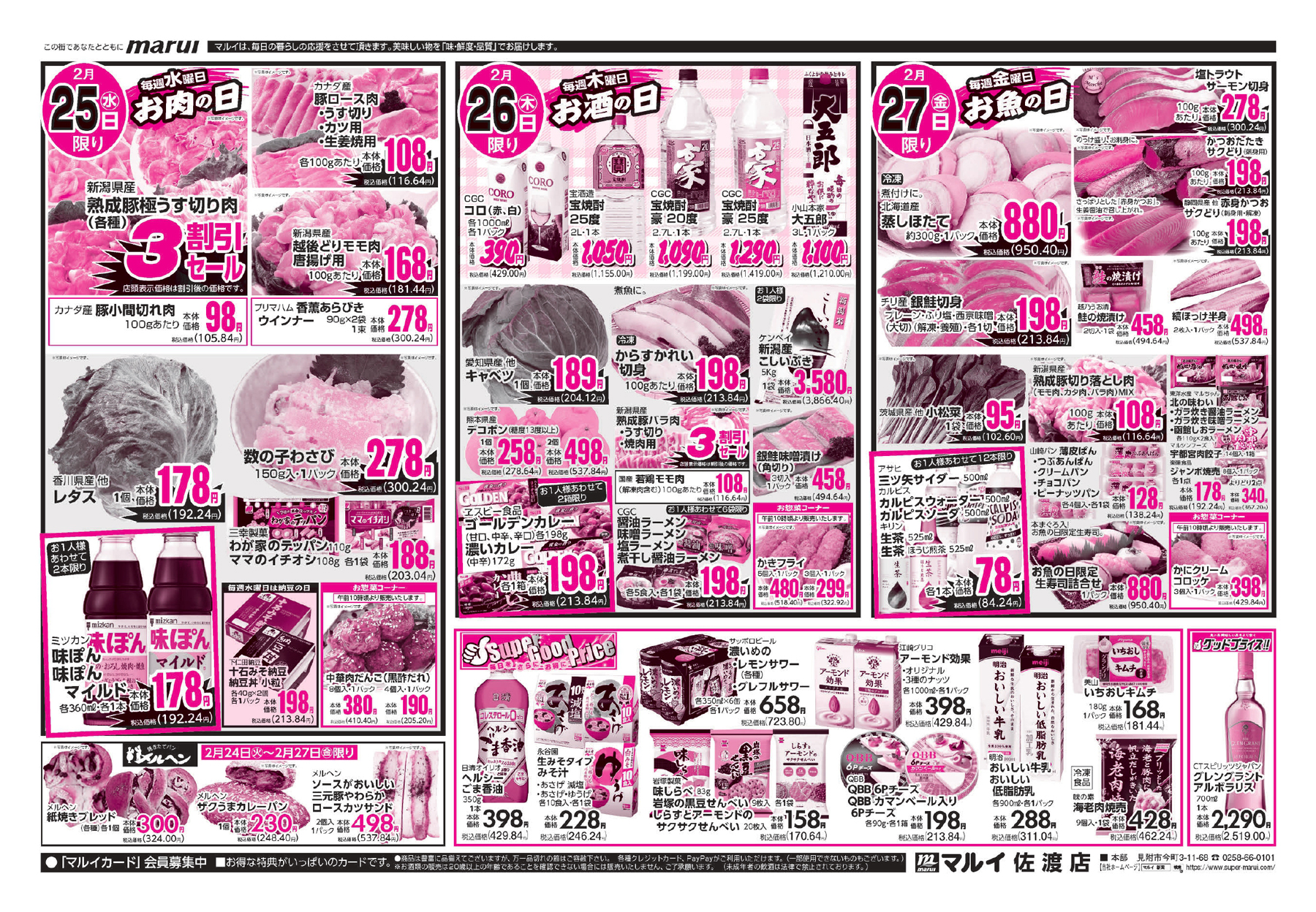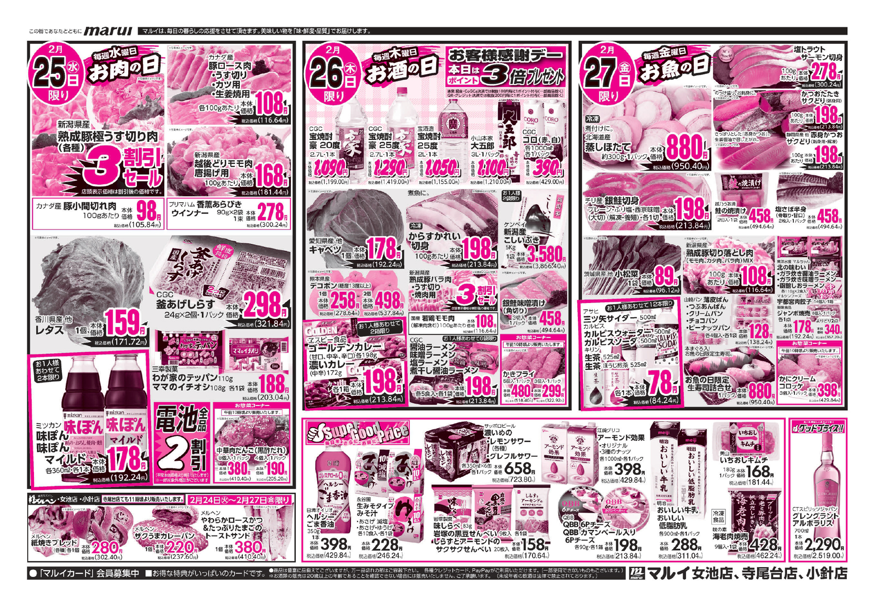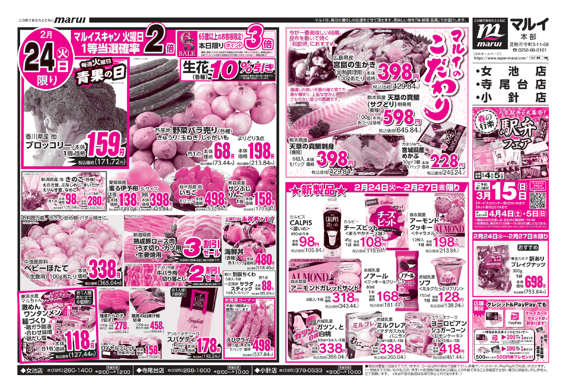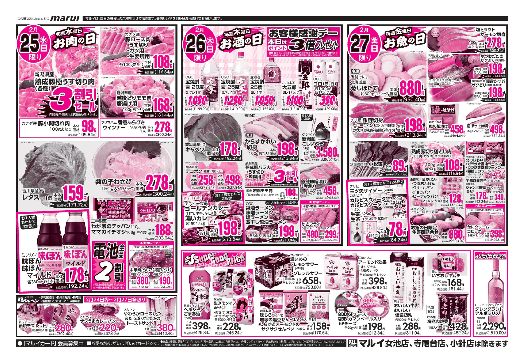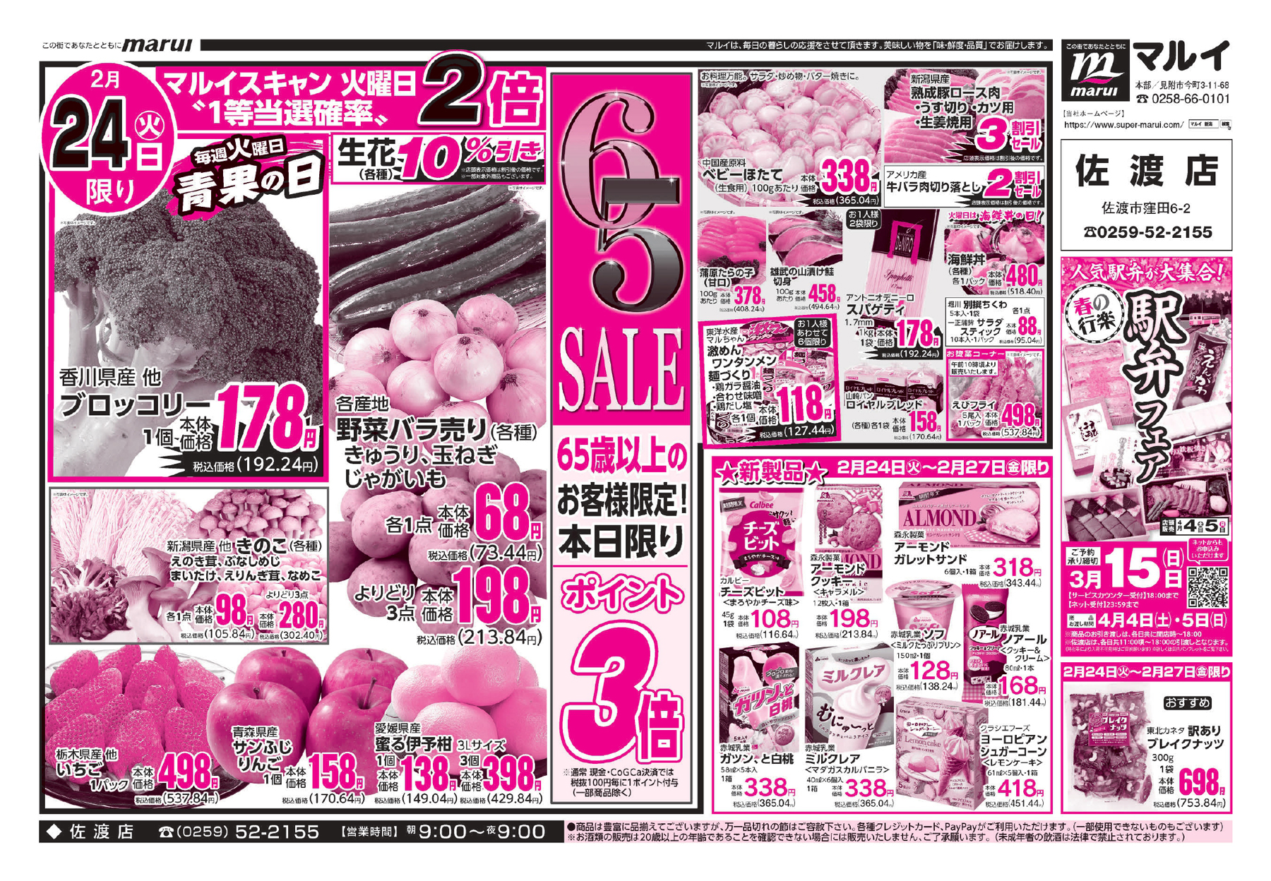 株式会社マルイ 【マルイチラシ】65SALE 掲載期間:2026年2月23日〜2026年2月27日 中越新潟市下越佐渡 スーパーマルイ 目次 各店 女池店・寺尾台店・小針店 佐渡店 各店 画像をクリックして拡大 prev next 女池店・寺尾台店・小針店 画像をクリックして拡大 prev next 佐渡店 画像をクリックして拡大 prev next セール・新店情報を見逃さない! ガタチラをホーム画面に追加して、 最新情報をすぐチェック▶追加方法はかんたん♪ 関連 ポイ活するわよ~♪