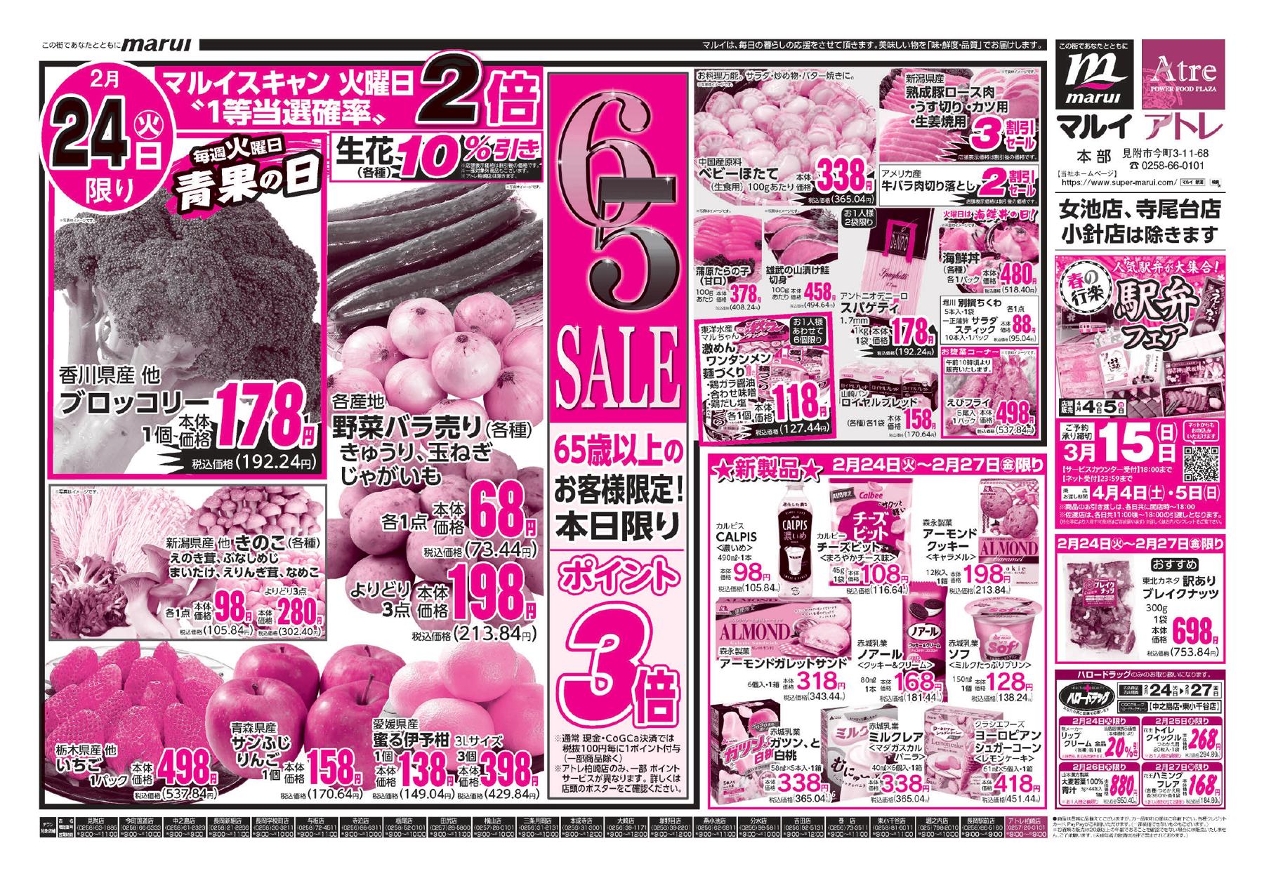 株式会社マルイ 【アトレ柏崎店チラシ】65SALE 掲載期間:2026年2月23日〜2026年2月27日 中越 スーパーマルイ 画像をクリックして拡大 prev next セール・新店情報を見逃さない! ガタチラをホーム画面に追加して、 最新情報をすぐチェック▶追加方法はかんたん♪ 関連 新製品のアイスが気になるわね♪