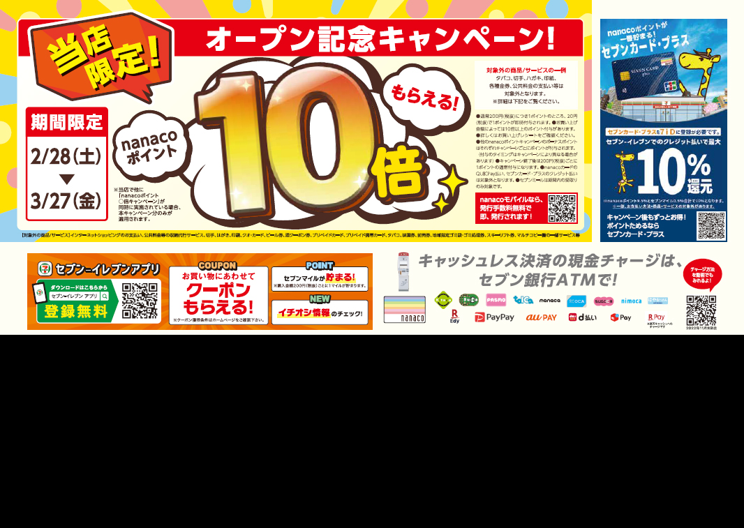 セブンイレブン大野町店 【セブンイレブン大野町店チラシ】OPEN 2026.2.28 掲載期間:2026年2月28日〜2026年3月27日 新潟市 生活サービス 画像をクリックして拡大 prev next セール・新店情報を見逃さない! ガタチラをホーム画面に追加して、 最新情報をすぐチェック▶追加方法はかんたん♪ 関連 オープンセールに行かなきゃ♪