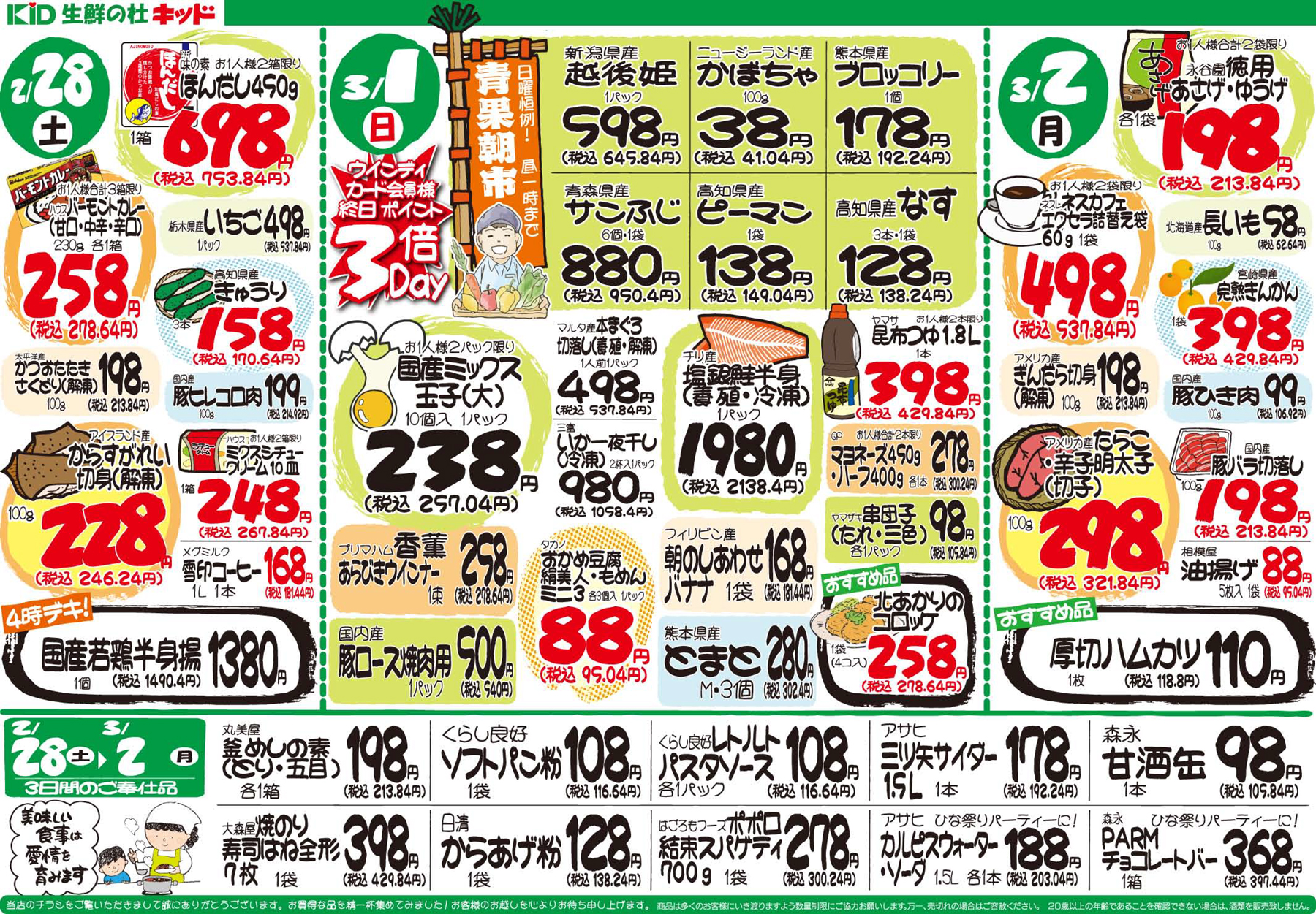 キッド 【生鮮の杜キッドチラシ】お家でひなまつり 掲載期間:2026年2月28日〜2026年3月2日 下越 スーパー 画像をクリックして拡大 prev next セール・新店情報を見逃さない! ガタチラをホーム画面に追加して、 最新情報をすぐチェック▶追加方法はかんたん♪ 関連 ひなまつりに海鮮太巻きも良いわね~♪