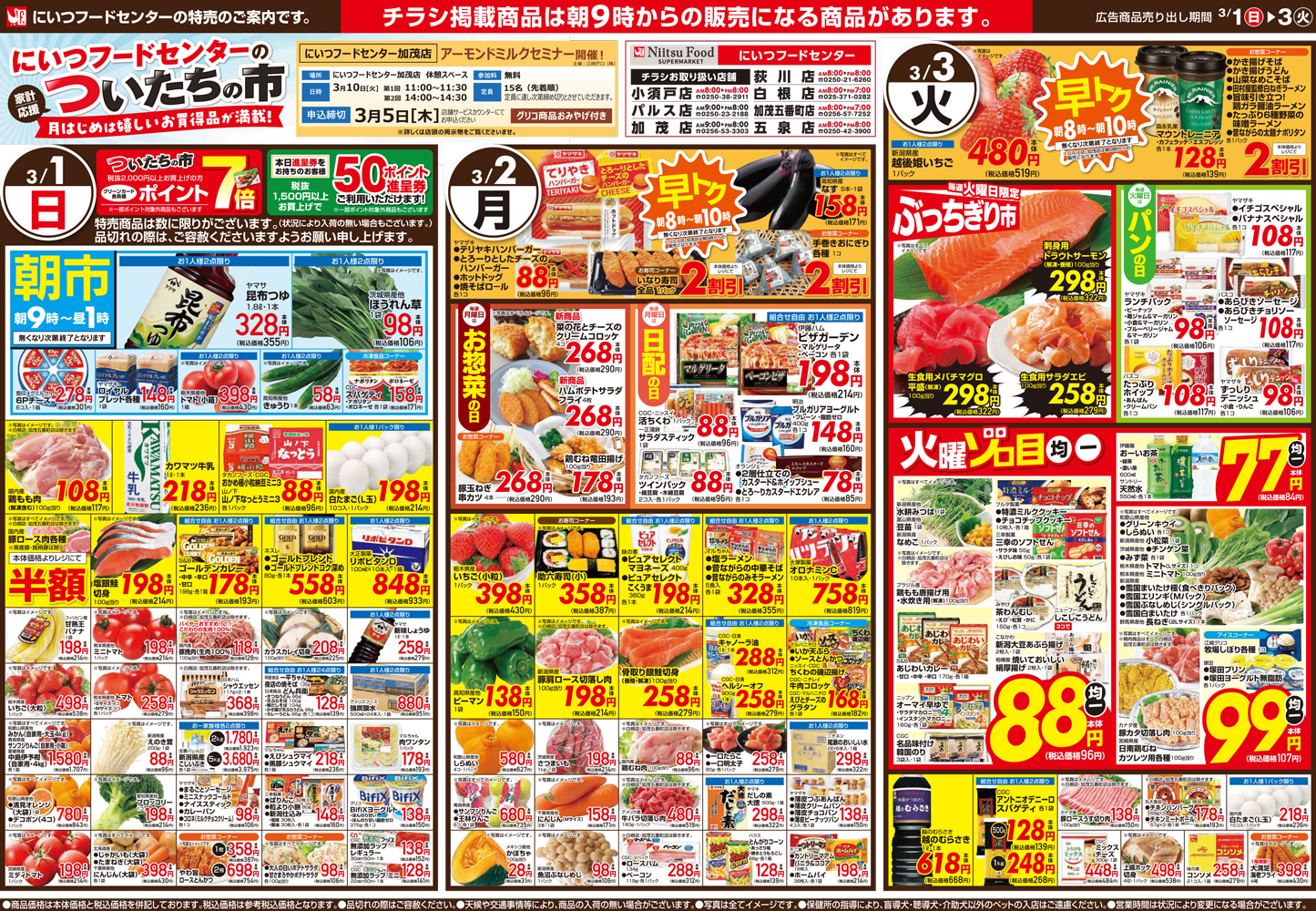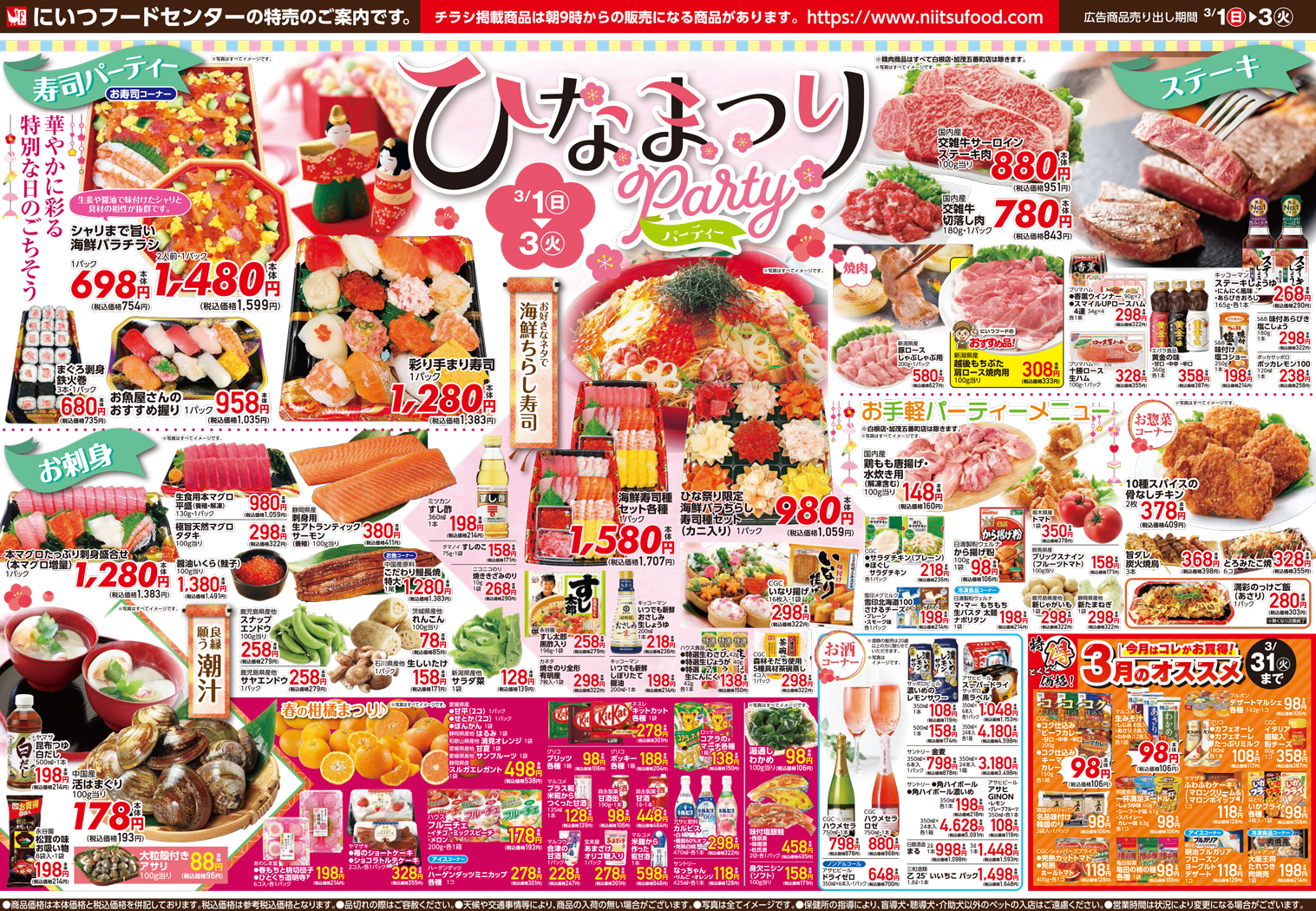 にいつフードセンター 【にいつフードセンターチラシ】ひなまつりパーティー 掲載期間:2026年3月1日〜2026年3月3日 中越新潟市下越 スーパーにいつフードセンター 画像をクリックして拡大 prev next セール・新店情報を見逃さない! ガタチラをホーム画面に追加して、 最新情報をすぐチェック▶追加方法はかんたん♪ 関連 彩り手まり寿司は可愛らしくておいしそうね! 寿司種セットでちらし寿司や手巻き寿司も楽しいわね♪