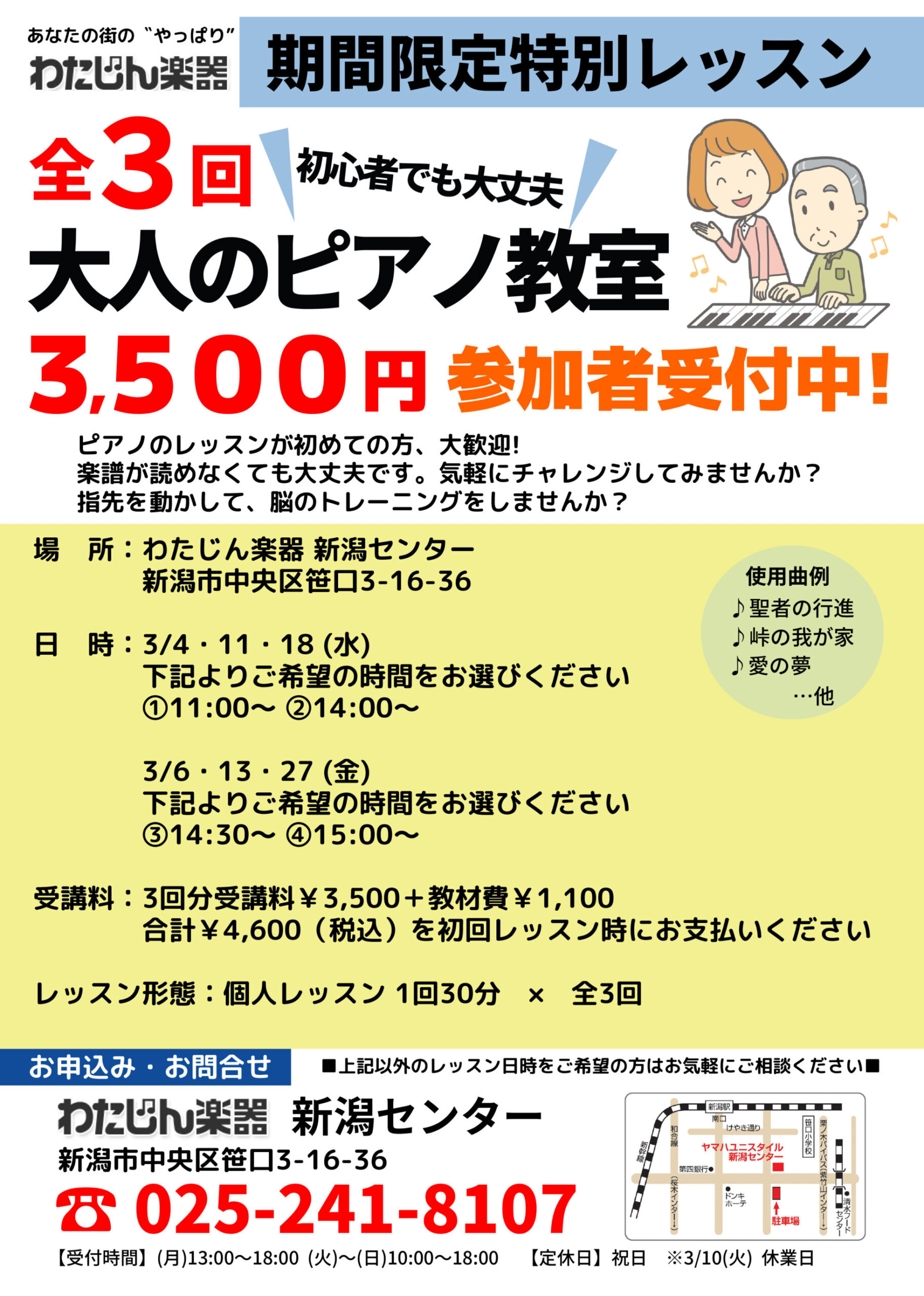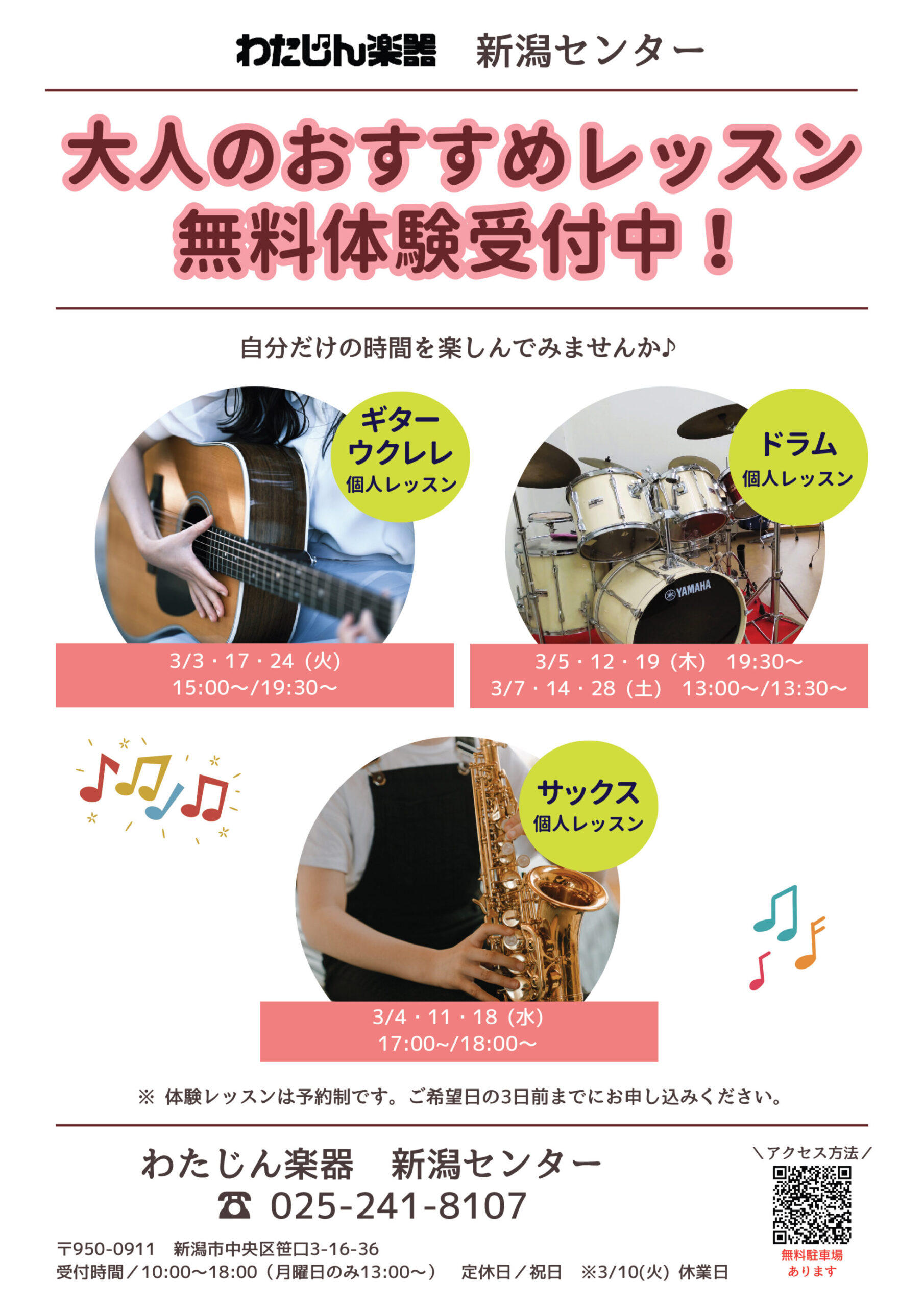 わたじん楽器新潟センター 【わたじん楽器新潟センターチラシ】大人のピアノ教室 掲載期間:2026年2月27日〜2026年3月27日 新潟市 生活サービス 画像をクリックして拡大 prev next セール・新店情報を見逃さない! ガタチラをホーム画面に追加して、 最新情報をすぐチェック▶追加方法はかんたん♪ 関連 ドラムかっこいいな~♪