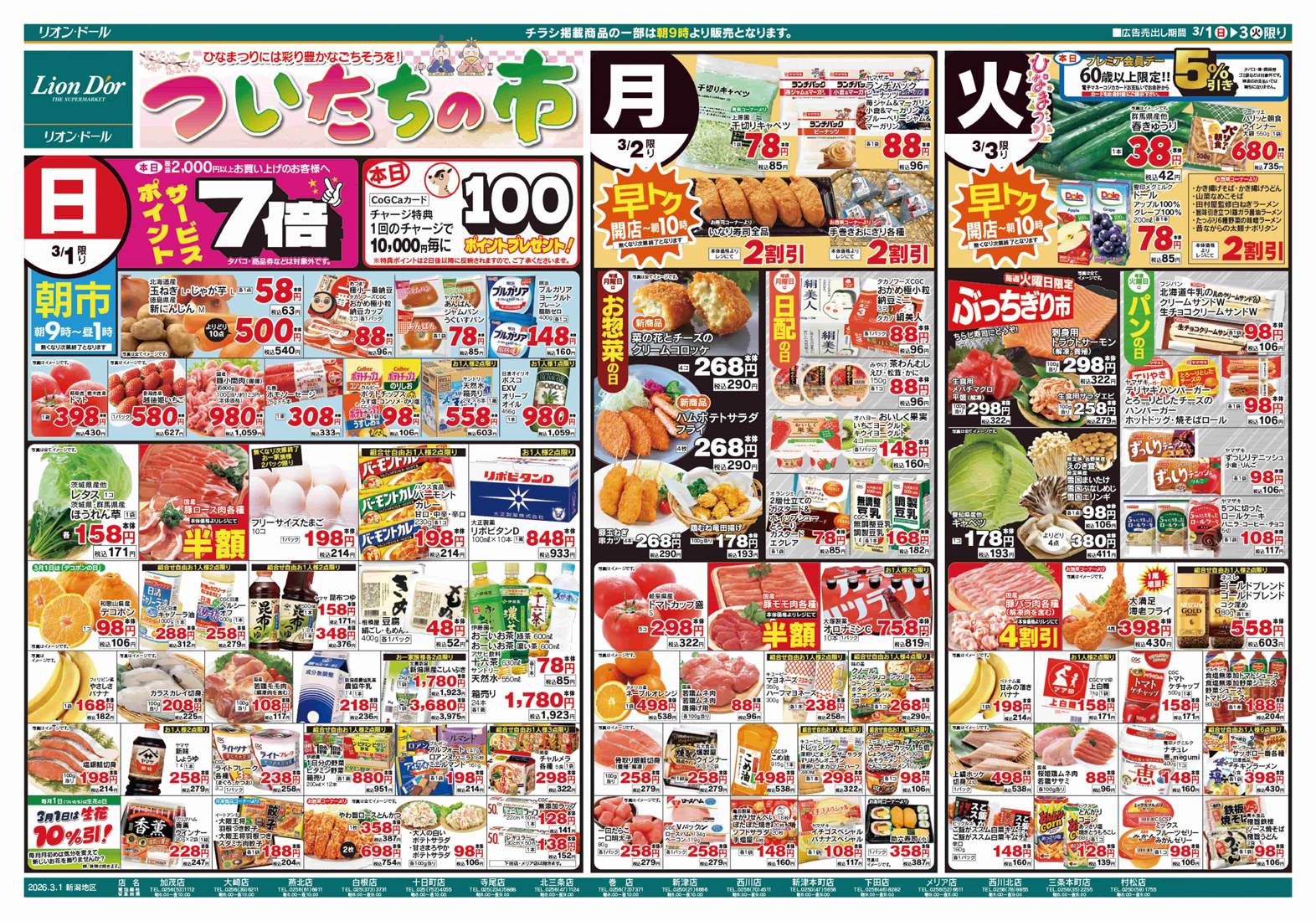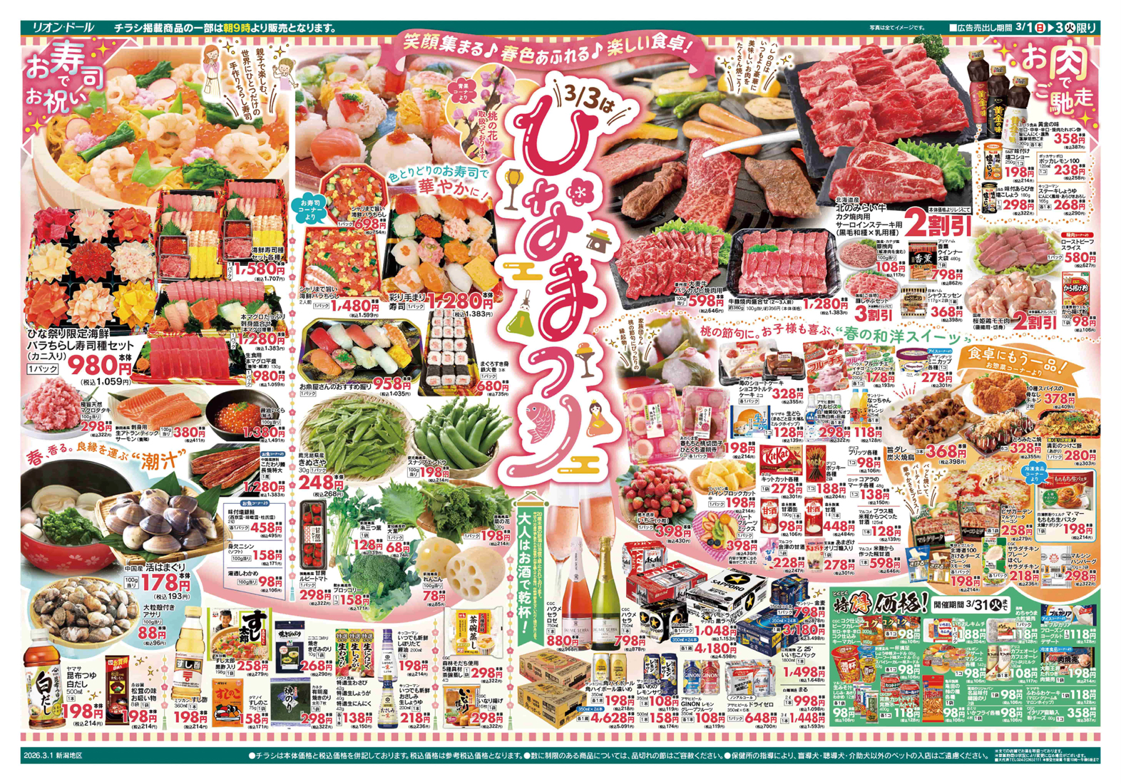 (株)リオン・ドールコーポレーション 【リオン・ドールチラシ】3/3は ひなまつり 掲載期間:2026年3月1日〜2026年3月3日 中越新潟市下越 スーパーリオン・ドール 画像をクリックして拡大 prev next 「リオン・ドール」のホームページはこちらから セール・新店情報を見逃さない! ガタチラをホーム画面に追加して、 最新情報をすぐチェック▶追加方法はかんたん♪ 関連 彩り手まり寿司は可愛らしくておいしそうね! 寿司種セットでちらし寿司や手巻き寿司も楽しいわね♪