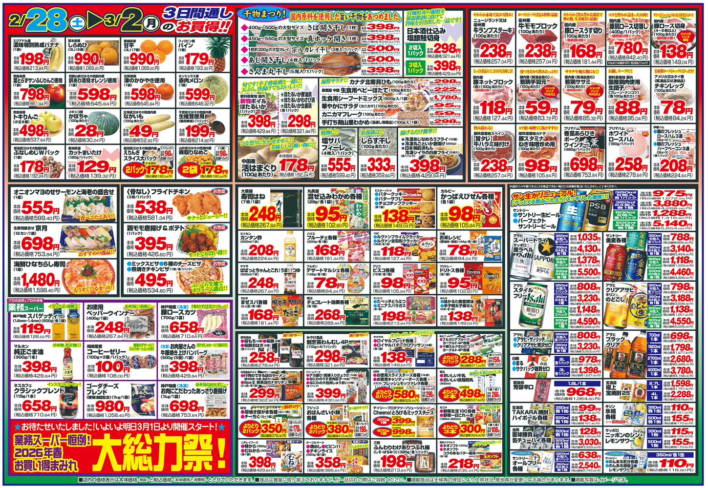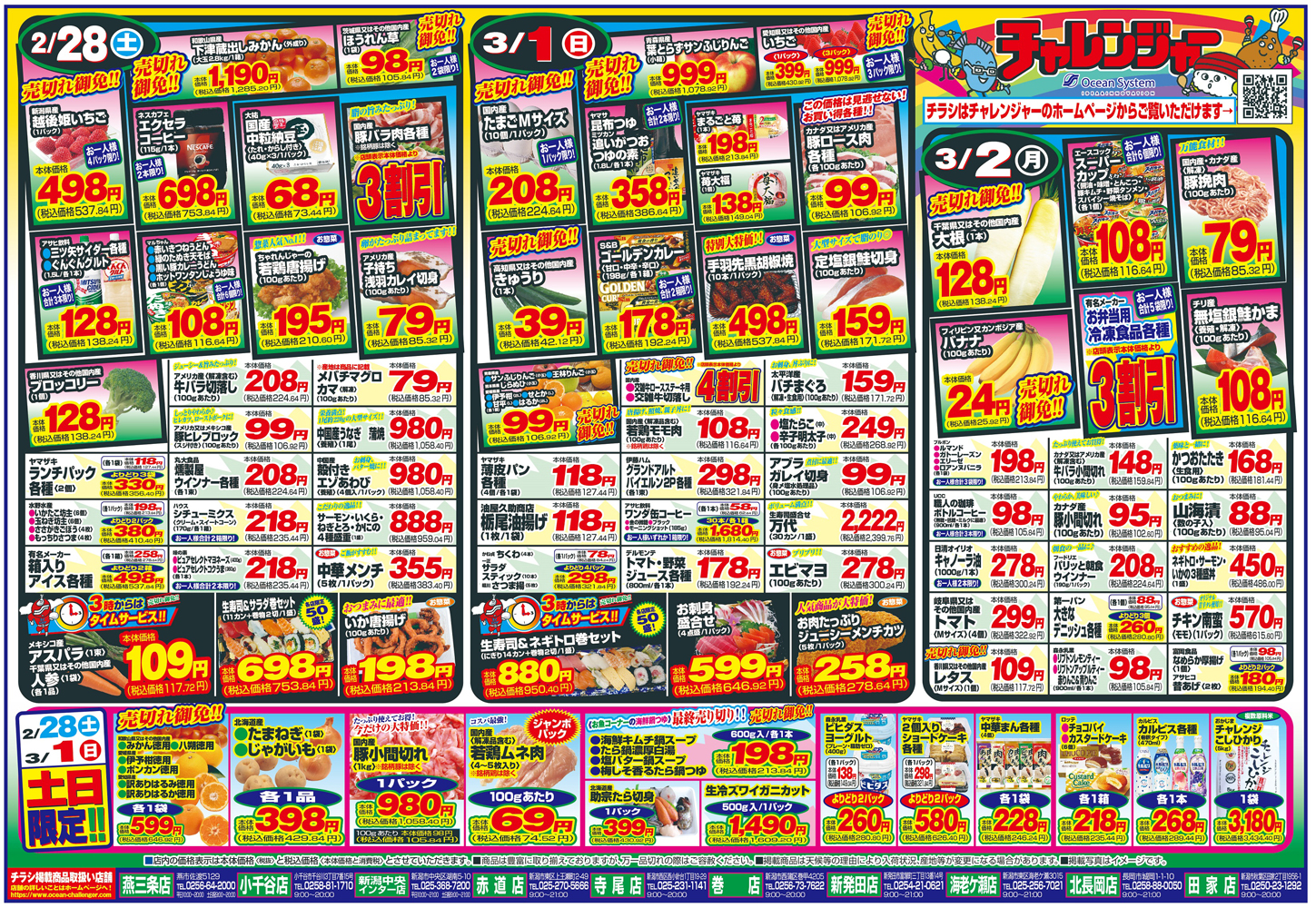 チャレンジャー 【チャレンジャーチラシ】3日間通しのお買得! 掲載期間:2026年2月28日〜2026年3月2日 中越新潟市下越 スーパーチャレンジャー 画像をクリックして拡大 prev next 対象店舗:燕三条店、中央インター店、新発田店、赤道店、寺尾店、海老ケ瀬店、小千谷店、北長岡店、巻店、田家店 セール・新店情報を見逃さない! ガタチラをホーム画面に追加して、 最新情報をすぐチェック▶追加方法はかんたん♪ 関連 大総力祭でお買い得品がたくさんよ!