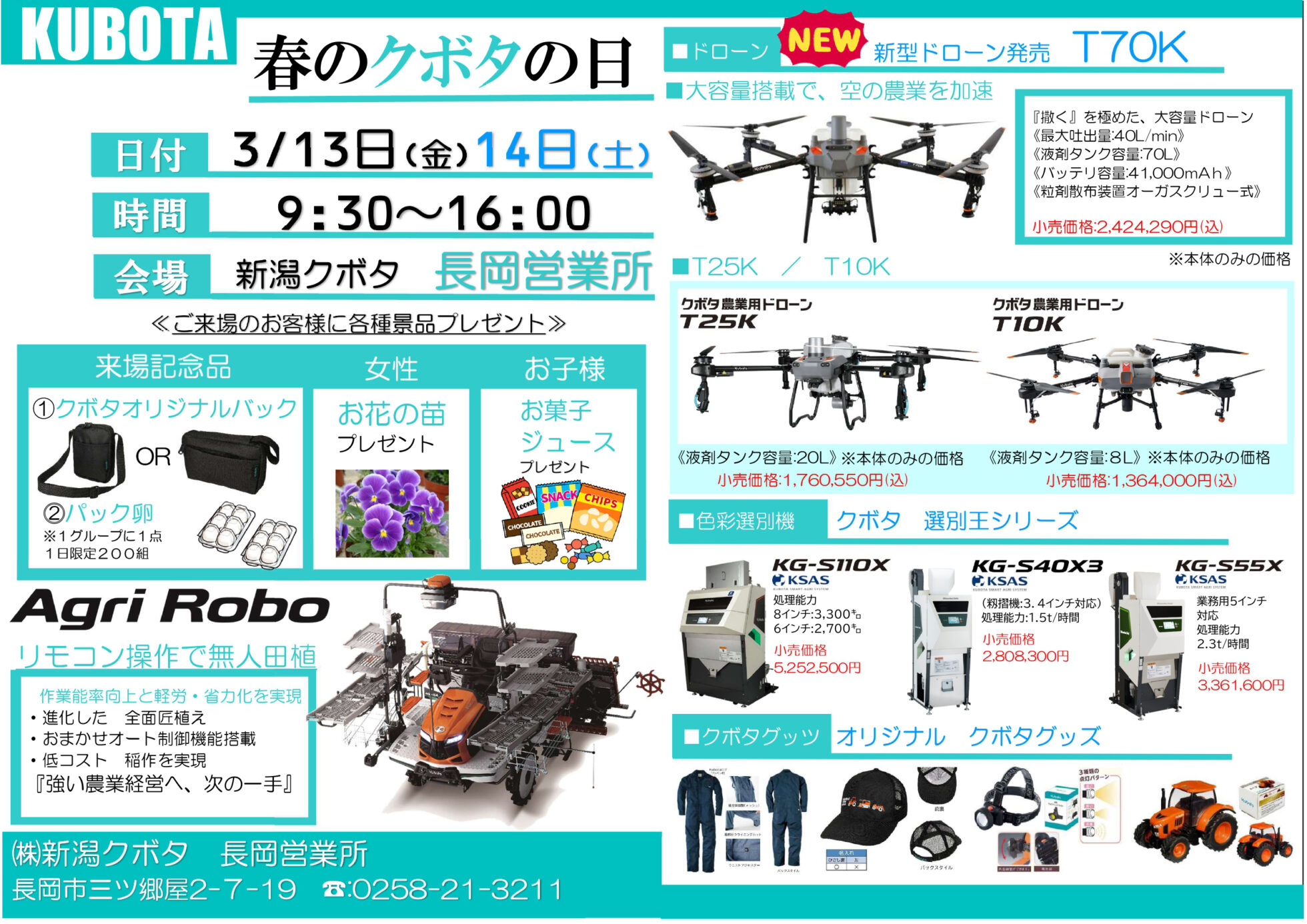 新潟クボタ長岡営業所 【新潟クボタ長岡営業所チラシ】春のクボタの日 景品プレゼント 掲載期間:2026年3月8日〜2026年3月14日 中越 生活サービス 画像をクリックして拡大 prev next セール・新店情報を見逃さない! ガタチラをホーム画面に追加して、 最新情報をすぐチェック▶追加方法はかんたん♪ 関連 新型ドローンは仕事が捗りそうね、憧れるわ~!
