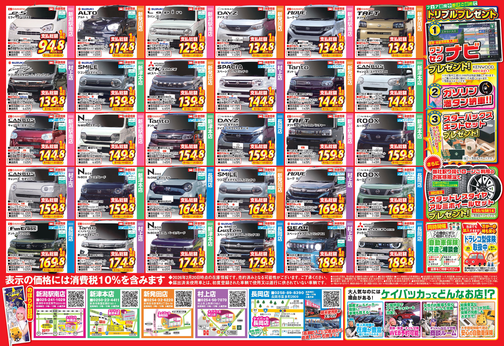 川内自動車 【ケイバッカチラシ】在庫一掃セール 掲載期間:2026年2月28日〜2026年3月2日 中越新潟市下越 車・カー用品 画像をクリックして拡大 prev next セール・新店情報を見逃さない! ガタチラをホーム画面に追加して、 最新情報をすぐチェック▶追加方法はかんたん♪ 関連 掘り出し物が見つかるかしら! 新社会人ローンで安心して購入できるわね♪