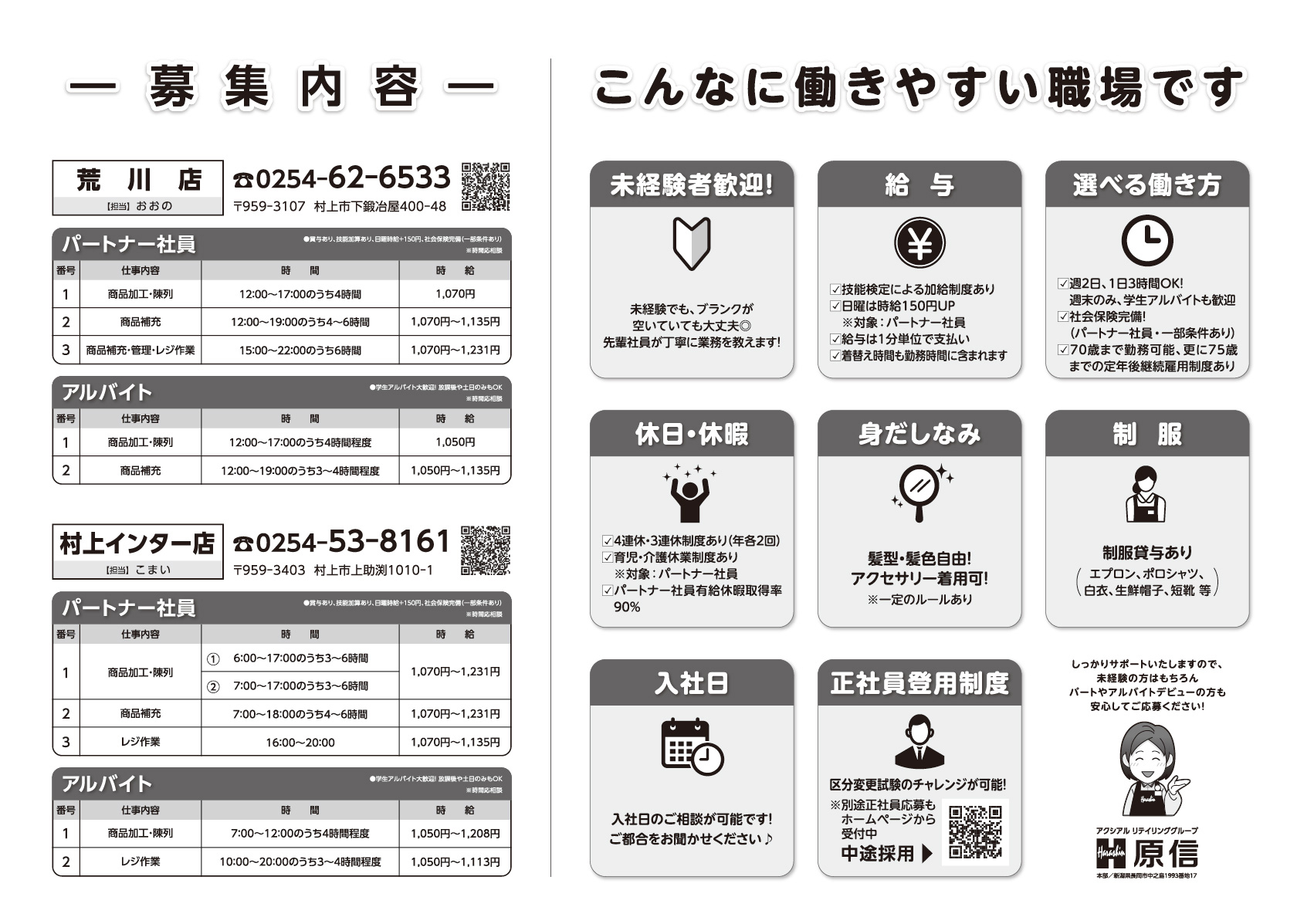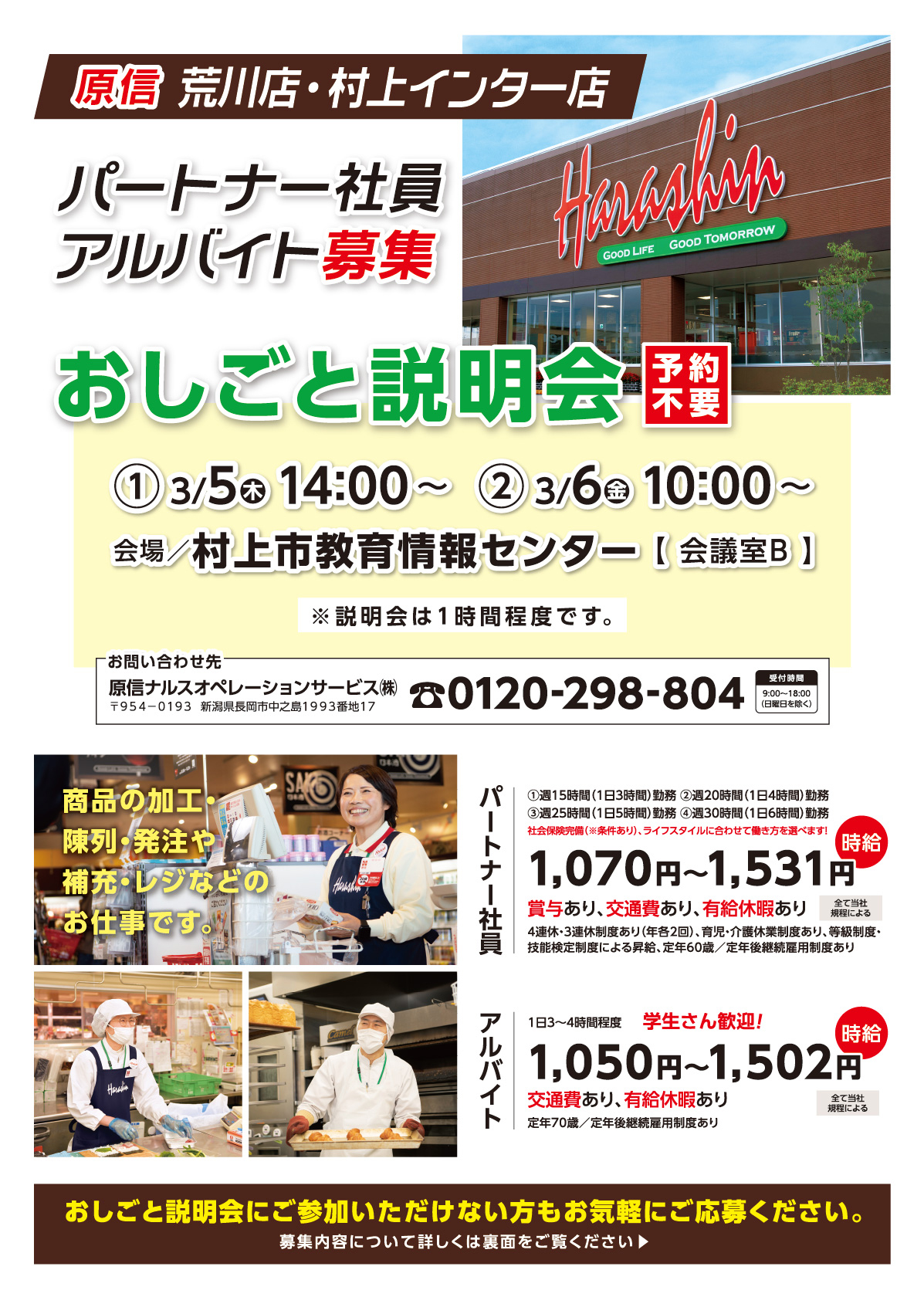 原信ナルス 【原信ナルス荒川店・村上インター店チラシ】パートナー社員・アルバイト 募集<おしごと説明会> 掲載期間:2026年2月28日〜2026年3月6日 下越 スーパー原信ナルス求人 画像をクリックして拡大 prev next 対象店舗:荒川店・村上インター店 セール・新店情報を見逃さない! ガタチラをホーム画面に追加して、 最新情報をすぐチェック▶追加方法はかんたん♪ 関連 とっても働きやすそうね! 私も応募してみようかしら?