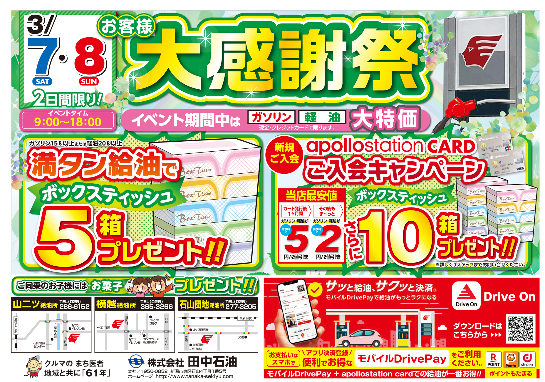 田中石油 【田中石油チラシ】大感謝祭 掲載期間:2026年3月2日〜2026年3月8日 新潟市 車・カー用品 画像をクリックして拡大 prev next セール・新店情報を見逃さない! ガタチラをホーム画面に追加して、 最新情報をすぐチェック▶追加方法はかんたん♪ 関連 満タン給油でボックスティッシュ5箱ももらえるんですって! タイヤもお買い得、この機会に買い替えましょう♪