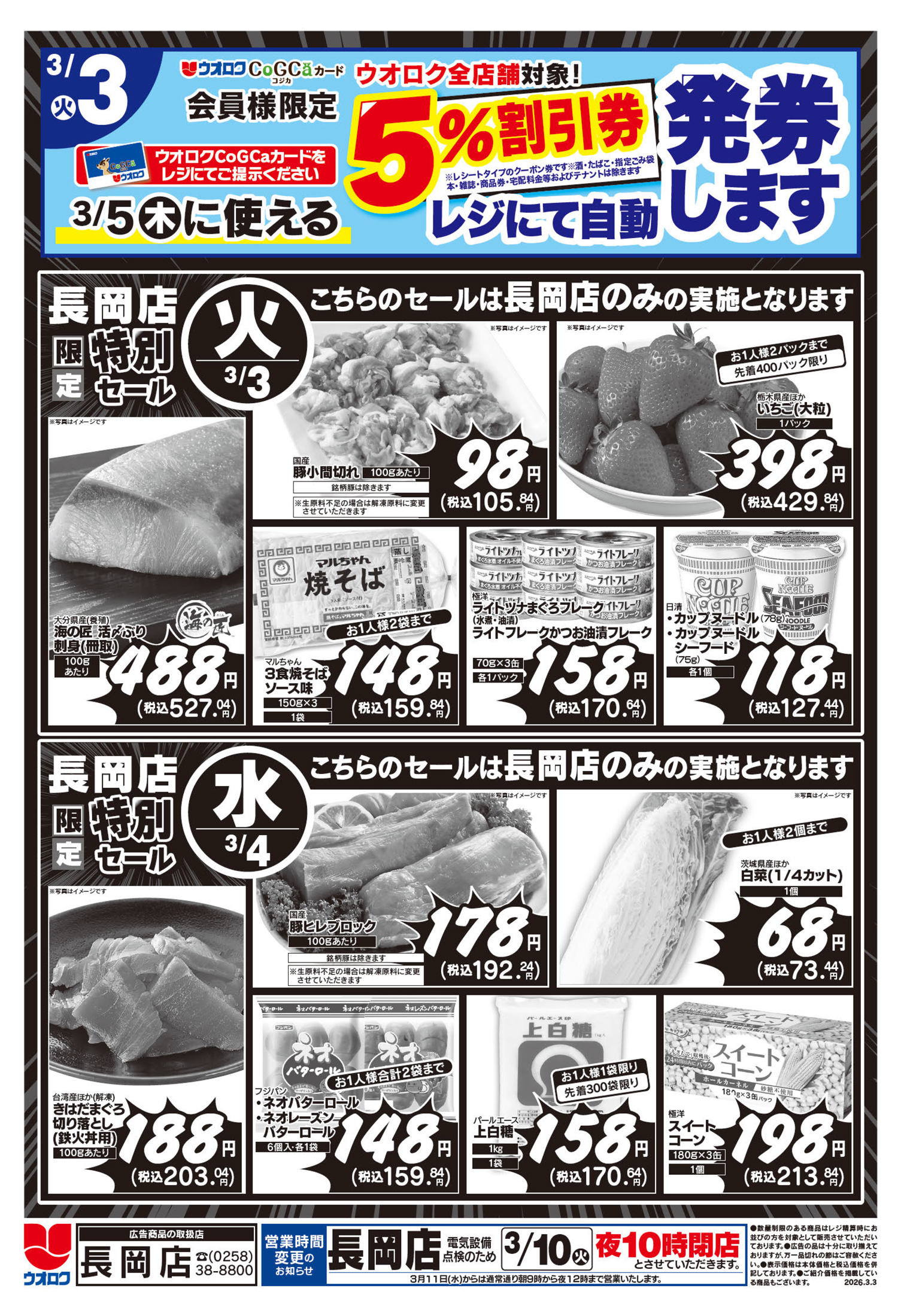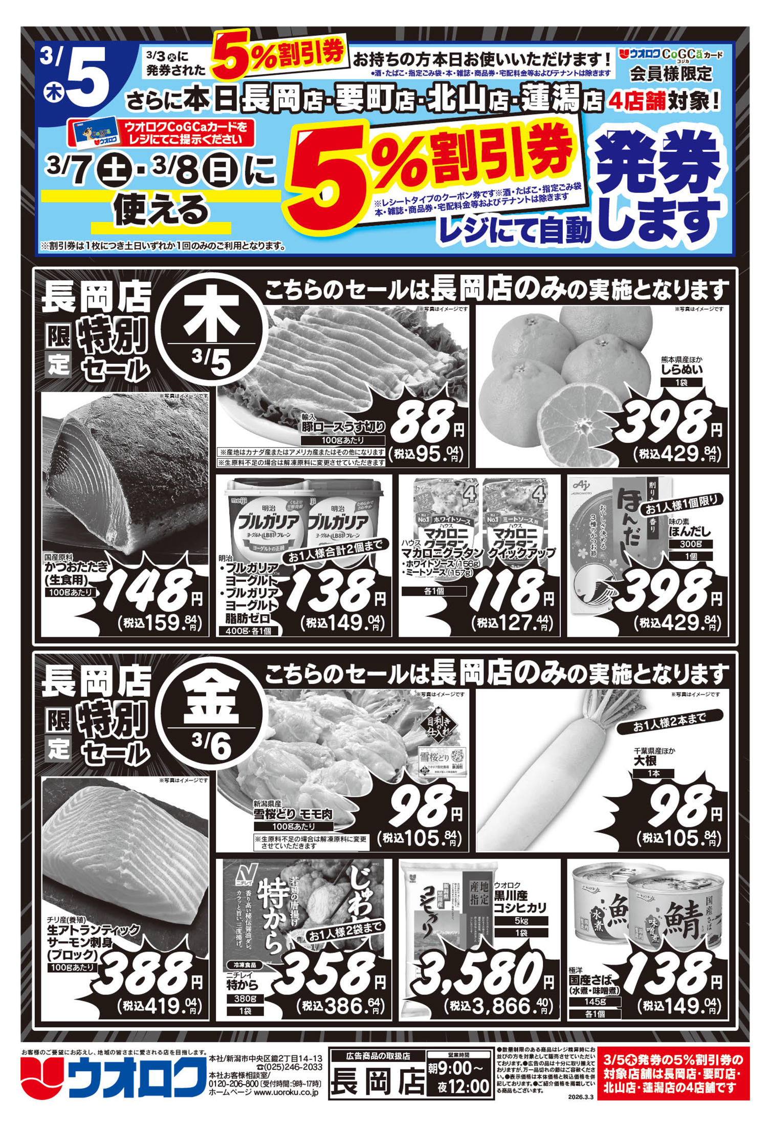 ウオロク長岡店 【ウオロク長岡店チラシ】5%割引券レジにて自動発券します 掲載期間:2026年3月3日〜2026年3月6日 中越 スーパーウオロク 画像をクリックして拡大 prev next 対象:長岡店 セール・新店情報を見逃さない! ガタチラをホーム画面に追加して、 最新情報をすぐチェック▶追加方法はかんたん♪ 関連 割引券がもらえるんですって! 嬉しいわ~