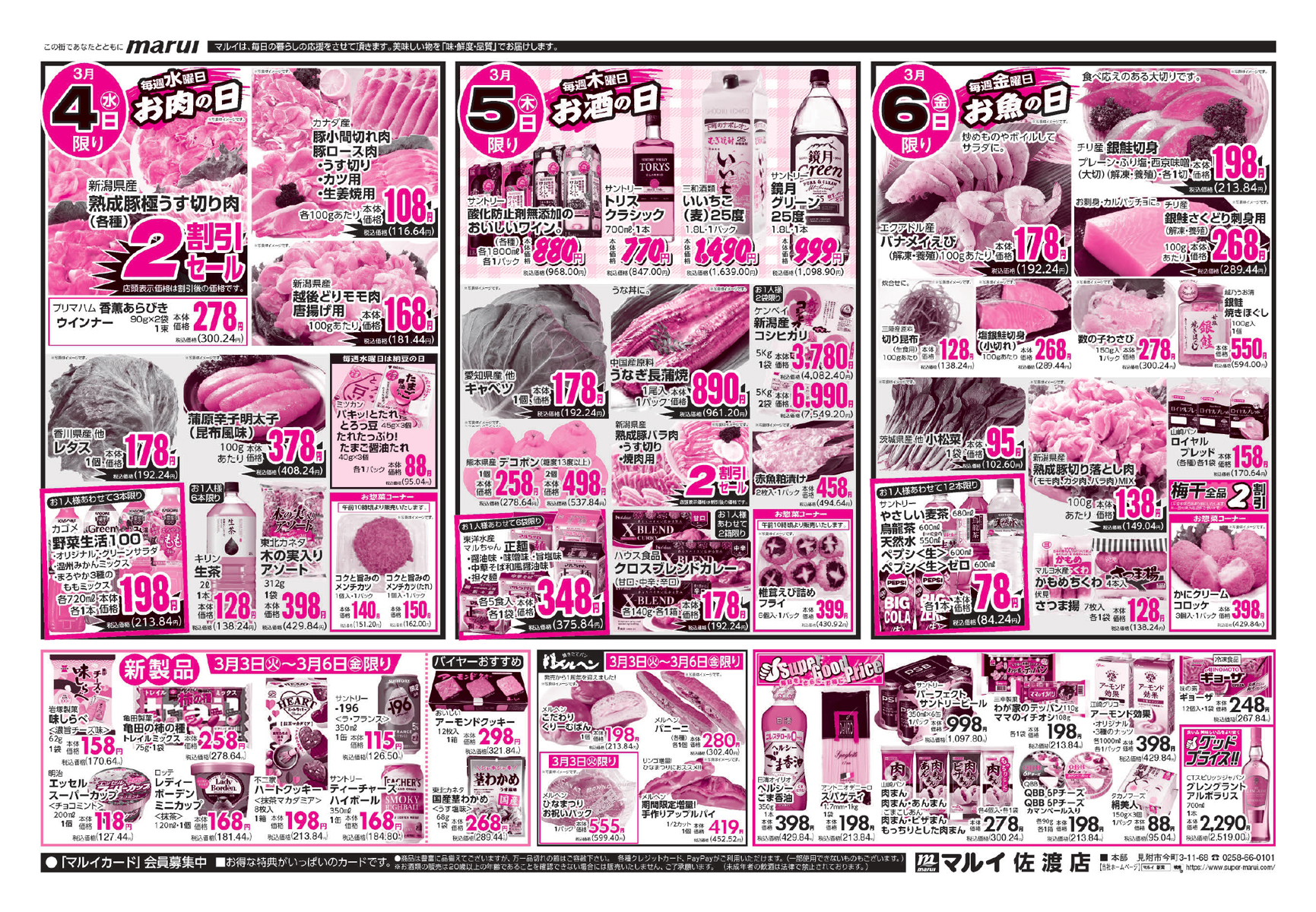 株式会社マルイ 【マルイ佐渡店チラシ】3月3日ひなまつり 掲載期間:2026年3月2日〜2026年3月6日 佐渡 スーパーマルイ 画像をクリックして拡大 prev next セール・新店情報を見逃さない! ガタチラをホーム画面に追加して、 最新情報をすぐチェック▶追加方法はかんたん♪ 関連 3日はポイント3倍ですって!