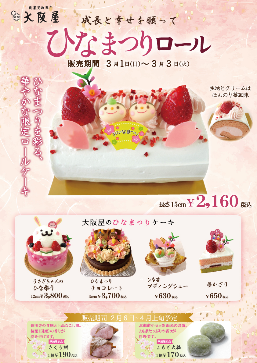 大阪屋 【大阪屋チラシ】ひな祭り限定ケーキ 掲載期間:2026年3月2日〜2026年3月3日 上越中越新潟市下越佐渡 グルメ 画像をクリックして拡大 prev next ※掲載品のデコレーションケーキ2品(うさぎのひな祭り・チョコレートデコ)はご予約にて終了している場合あります。 ※一部、取り扱いのない店舗もあります。 セール・新店情報を見逃さない! ガタチラをホーム画面に追加して、 最新情報をすぐチェック▶追加方法はかんたん♪ 関連 うさぎちゃんのケーキかわいいな~♪