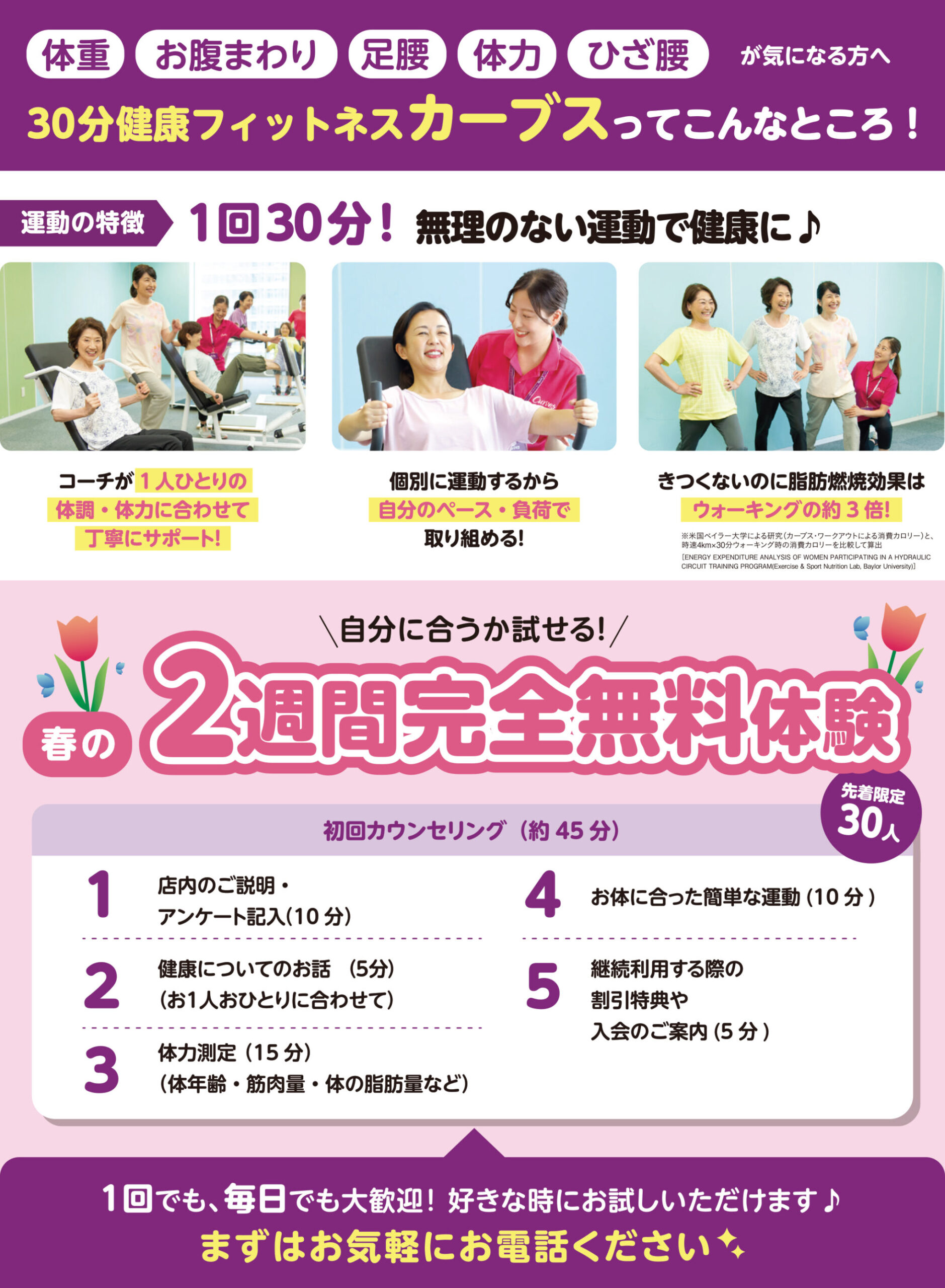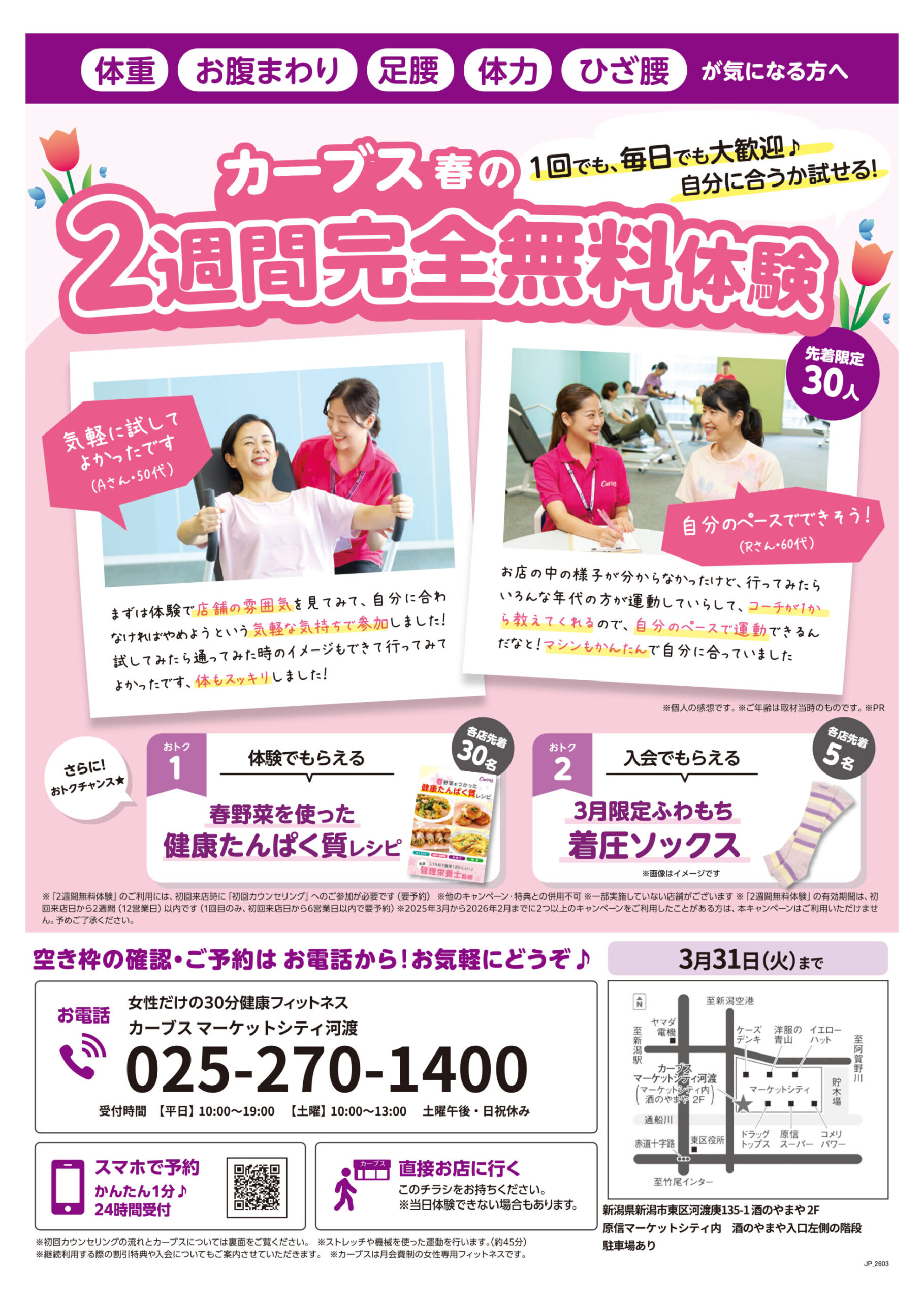 カーブスマーケットシティ河渡 【カーブスマーケットシティ河渡チラシ】2週間完全無料体験 掲載期間:2026年3月10日〜2026年3月31日 新潟市 スポーツジム 画像をクリックして拡大 prev next セール・新店情報を見逃さない! ガタチラをホーム画面に追加して、 最新情報をすぐチェック▶追加方法はかんたん♪ 関連 自分のペースで運動できるのが良いわね♪