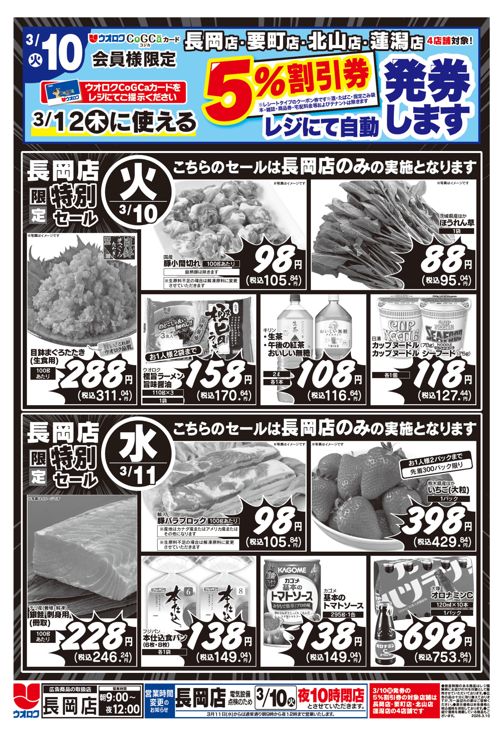 ウオロク 【ウオロク長岡店チラシ】限定特別セール 掲載期間:2026年3月10日〜2026年3月13日 中越 スーパーウオロク 画像をクリックして拡大 prev next 対象:長岡店のみ セール・新店情報を見逃さない! ガタチラをホーム画面に追加して、 最新情報をすぐチェック▶追加方法はかんたん♪ 関連 ほうれん草がとってもお安いわ♪
