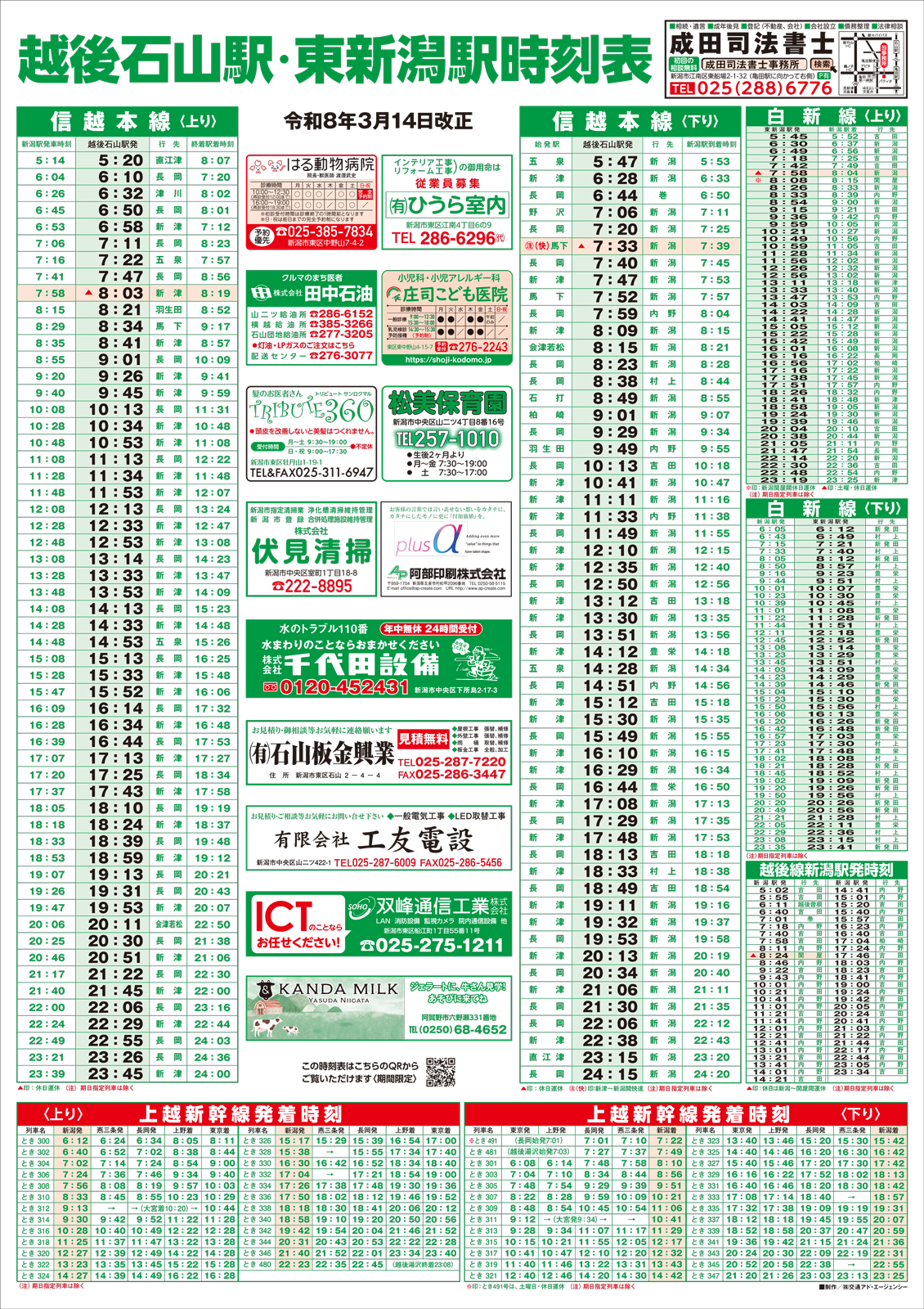 越後石山駅・東新潟駅時刻表 【越後石山駅・東新潟駅時刻表チラシ】石山地区 掲載期間:2026年3月13日〜2026年12月31日 新潟市下越 時刻表 画像をクリックして拡大 prev next セール・新店情報を見逃さない! ガタチラをホーム画面に追加して、 最新情報をすぐチェック▶追加方法はかんたん♪ 関連 乗り遅れないようにしっかりチェックよ!