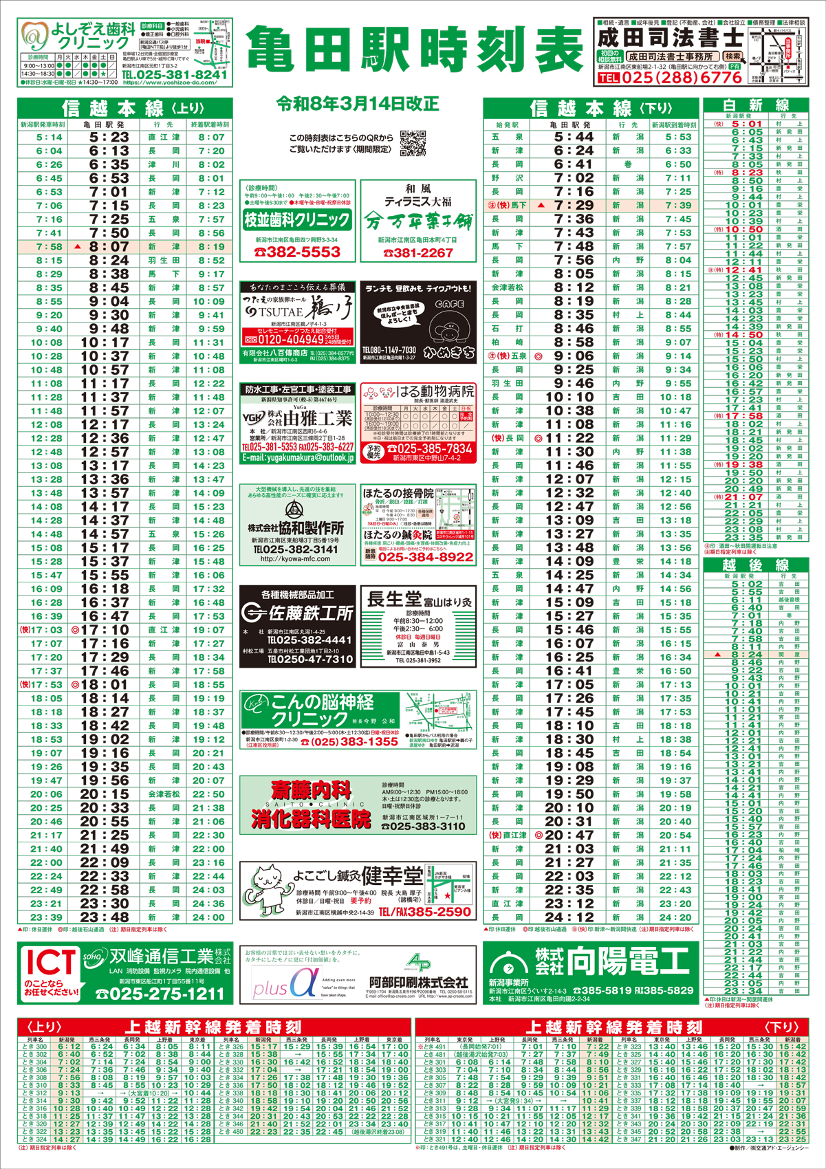 亀田駅時刻表 【亀田駅時刻表チラシ】亀田地区 掲載期間:2026年3月13日〜2026年12月31日 下越 時刻表 画像をクリックして拡大 prev next セール・新店情報を見逃さない! ガタチラをホーム画面に追加して、 最新情報をすぐチェック▶追加方法はかんたん♪ 関連 乗り遅れないようにしっかりチェックよ!