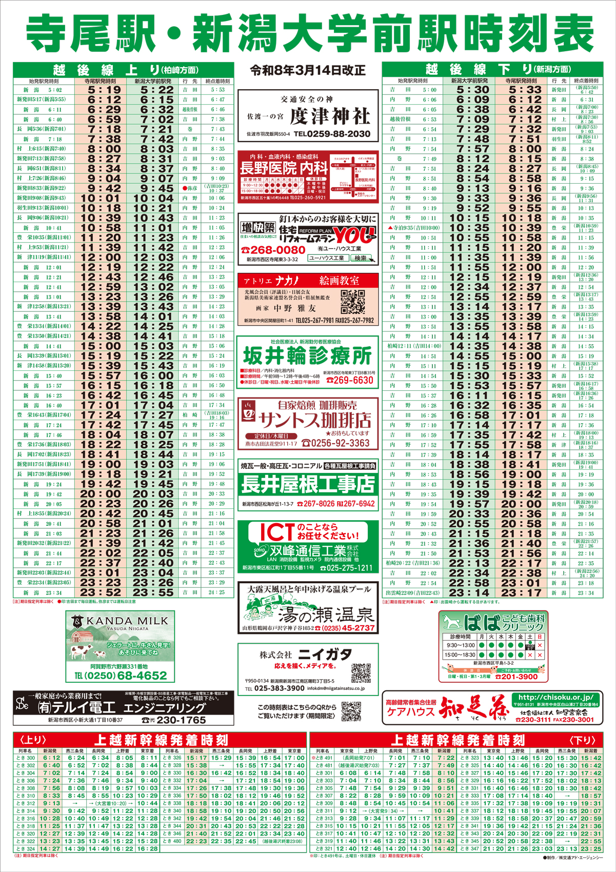 寺尾駅・新潟大学前駅時刻表 【寺尾駅・新潟大学前駅時刻表チラシ】内野地区 掲載期間:2026年3月14日〜2026年12月31日 新潟市 時刻表 画像をクリックして拡大 prev next セール・新店情報を見逃さない! ガタチラをホーム画面に追加して、 最新情報をすぐチェック▶追加方法はかんたん♪ 関連 乗り遅れないようにしっかりチェックよ!