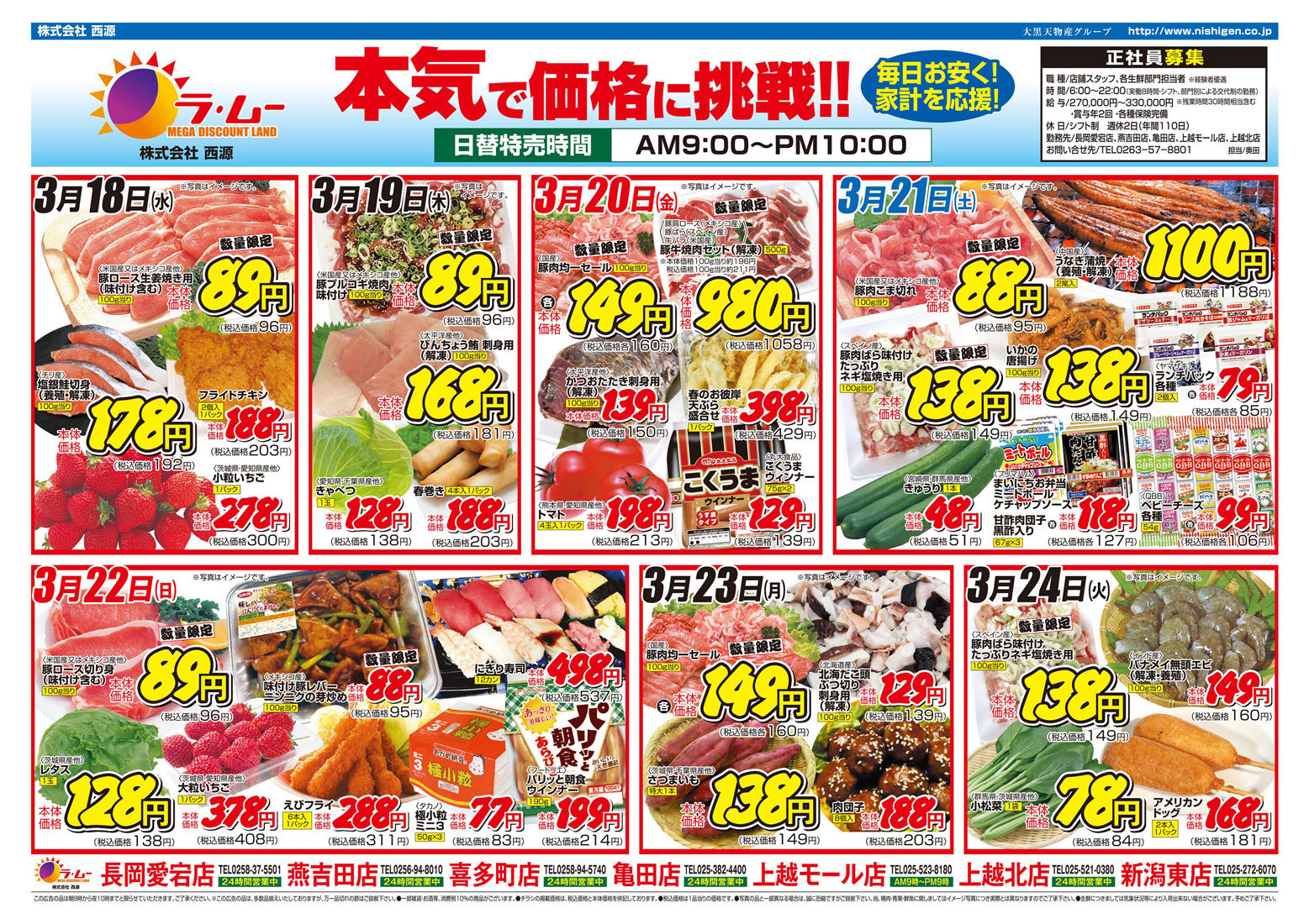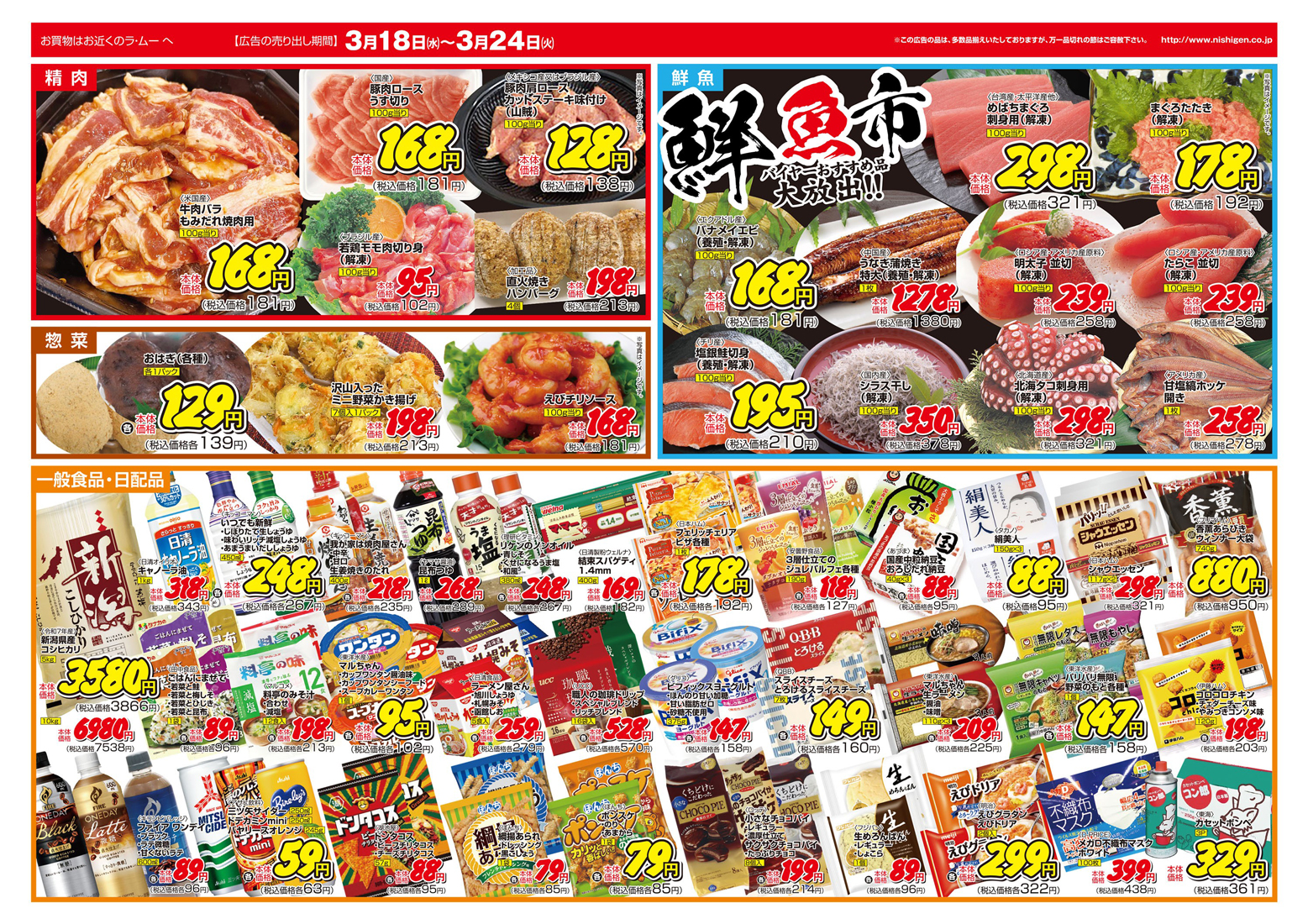 西源 【ラ・ムーチラシ】本気で価格に挑戦!! 掲載期間:2026年3月18日〜2026年3月24日 上越中越新潟市下越 スーパーラ・ムー 画像をクリックして拡大 prev next セール・新店情報を見逃さない! ガタチラをホーム画面に追加して、 最新情報をすぐチェック▶追加方法はかんたん♪ 関連 バイヤーが選んだ美味しいものをぜひいただいてみたいわ♪