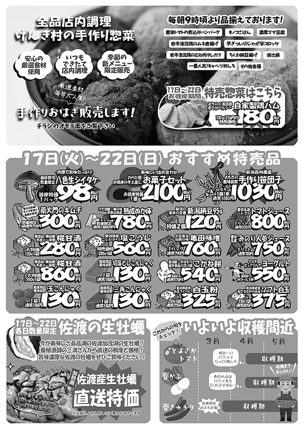 産直とよさかげんき村 【産直とよさかげんき村チラシ】春のお彼岸市 掲載期間:2026年3月17日〜2026年3月22日 新潟市 スーパー 画像をクリックして拡大 prev next セール・新店情報を見逃さない! ガタチラをホーム画面に追加して、 最新情報をすぐチェック▶追加方法はかんたん♪ 関連 厨房からできたての「おはぎ」を販売してくれるんですって! おいしそう♪