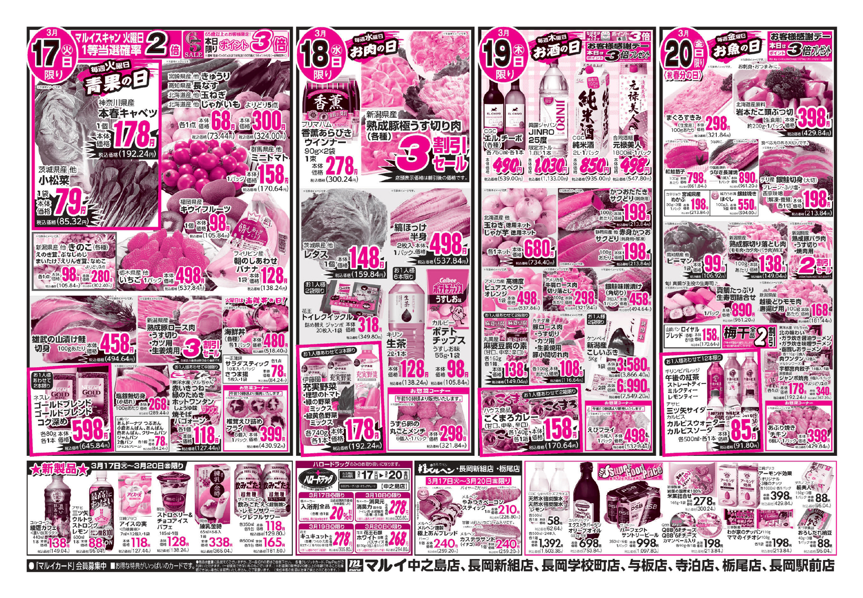 株式会社マルイ 【マルイチラシ】春彼岸 掲載期間:2026年3月17日〜2026年3月20日 中越新潟市下越 スーパーマルイ 目次 各店 女池店・寺尾台店・小針店 中之島店・長岡新組店・長岡学校町店・与板店・寺泊店・栃尾店・長岡駅前店 各店 画像をクリックして拡大 prev next 女池店・寺尾台店・小針店 画像をクリックして拡大 prev next 中之島店・長岡新組店・長岡学校町店・与板店・寺泊店・栃尾店・長岡駅前店 画像をクリックして拡大 prev next セール・新店情報を見逃さない! ガタチラをホーム画面に追加して、 最新情報をすぐチェック▶追加方法はかんたん♪ 関連 えび天がおいしそうだわ~♪