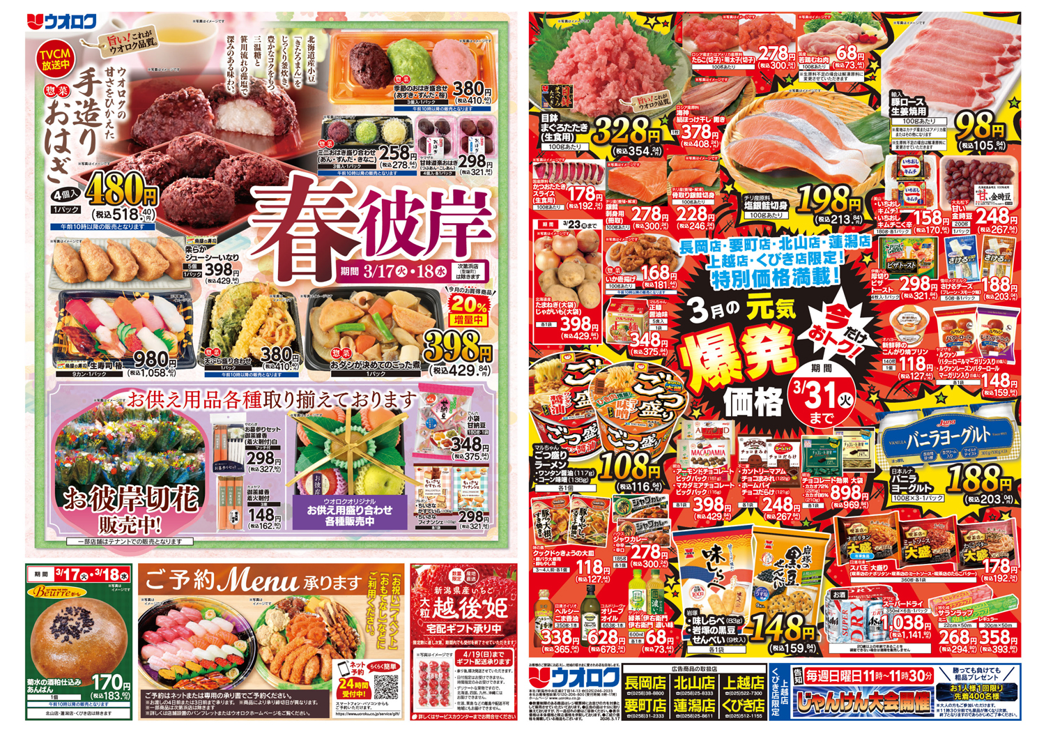 ウオロク 【ウオロク長岡店・要町店・北山店・蓮潟店・上越店・くびき店チラシ】店舗限定特別価格満載! 掲載期間:2026年3月17日〜2026年3月18日 上越中越 スーパーウオロク 画像をクリックして拡大 prev next セール・新店情報を見逃さない! ガタチラをホーム画面に追加して、 最新情報をすぐチェック▶追加方法はかんたん♪ 関連 お買得な時に買いに行かなくっちゃ♪