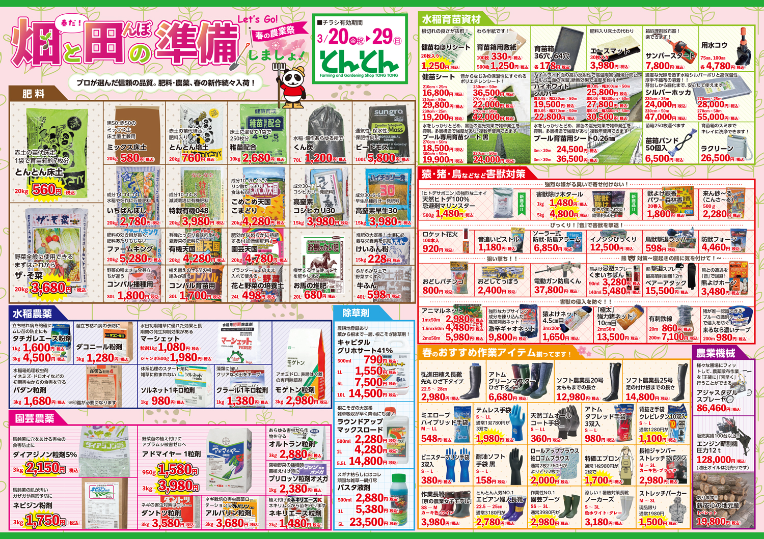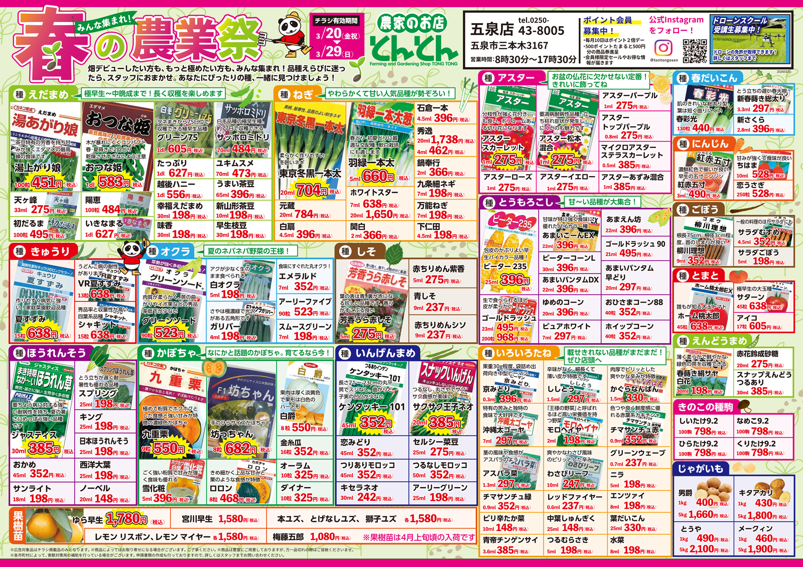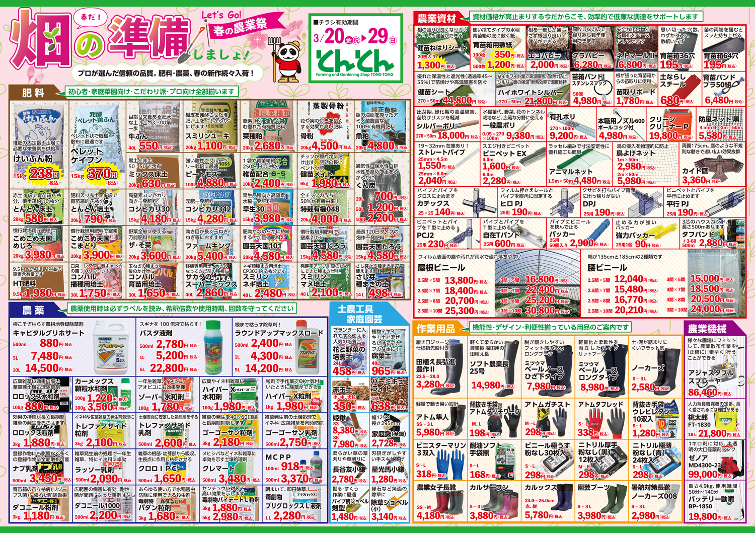 とんとん五泉店・神林店・佐渡店 【とんとん五泉店・神林店・佐渡店チラシ】春の農業祭 掲載期間:2026年3月20日〜2026年3月29日 下越佐渡 生活サービス 目次 五泉店 神林店 佐渡店 五泉店 画像をクリックして拡大 prev next 神林店 画像をクリックして拡大 prev next 佐渡店 画像をクリックして拡大 prev next セール・新店情報を見逃さない! ガタチラをホーム画面に追加して、 最新情報をすぐチェック▶追加方法はかんたん♪ 関連 畑デビューしたいならとんとんで相談ね♪