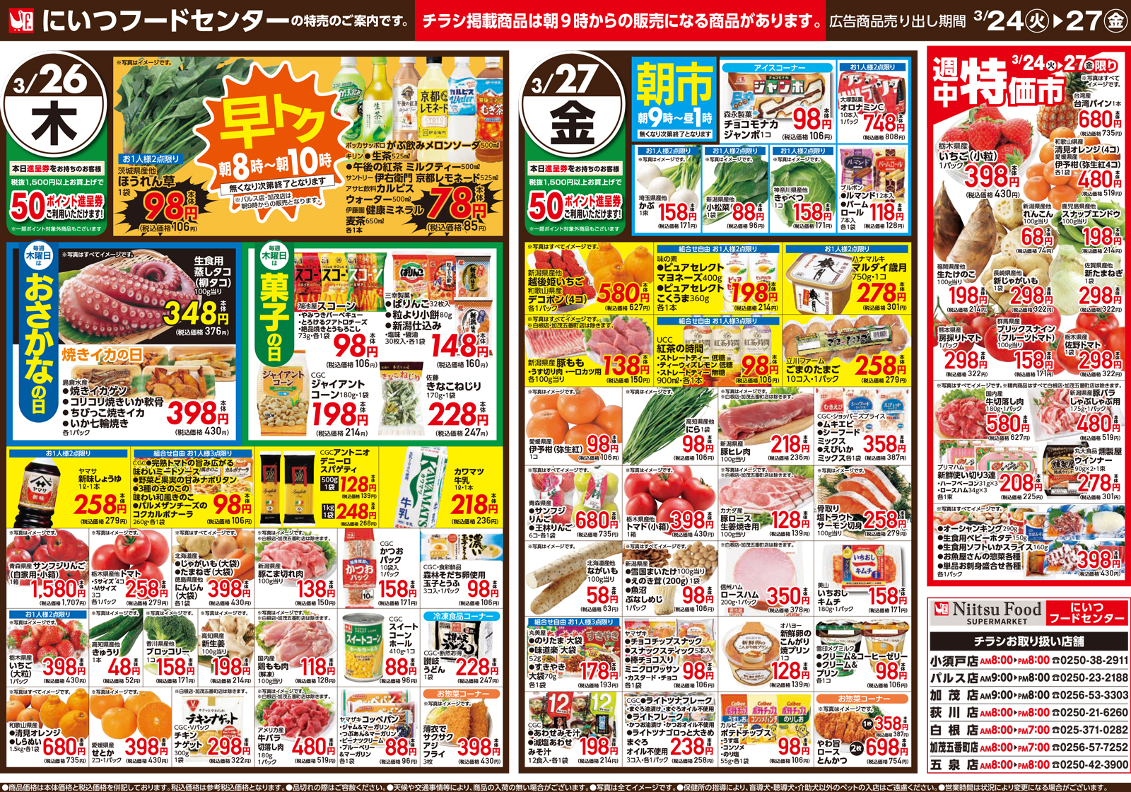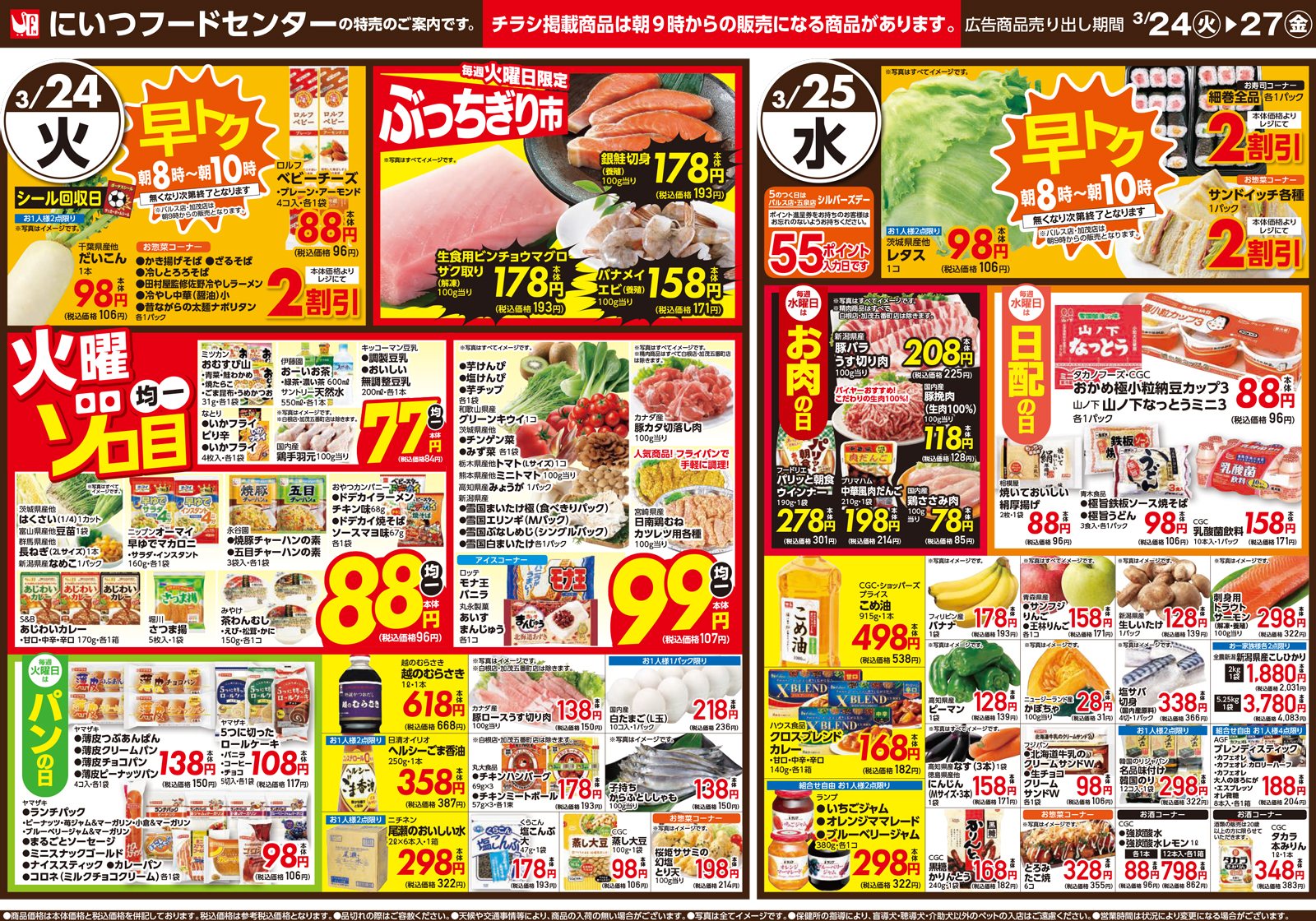 にいつフードセンター 【にいつフードセンターチラシ】火曜ゾロ目均一 掲載期間:2026年3月24日〜2026年3月27日 中越新潟市下越 スーパーにいつフードセンター 画像をクリックして拡大 prev next セール・新店情報を見逃さない! ガタチラをホーム画面に追加して、 最新情報をすぐチェック▶追加方法はかんたん♪ 関連 どれもお買得だわ~♪
