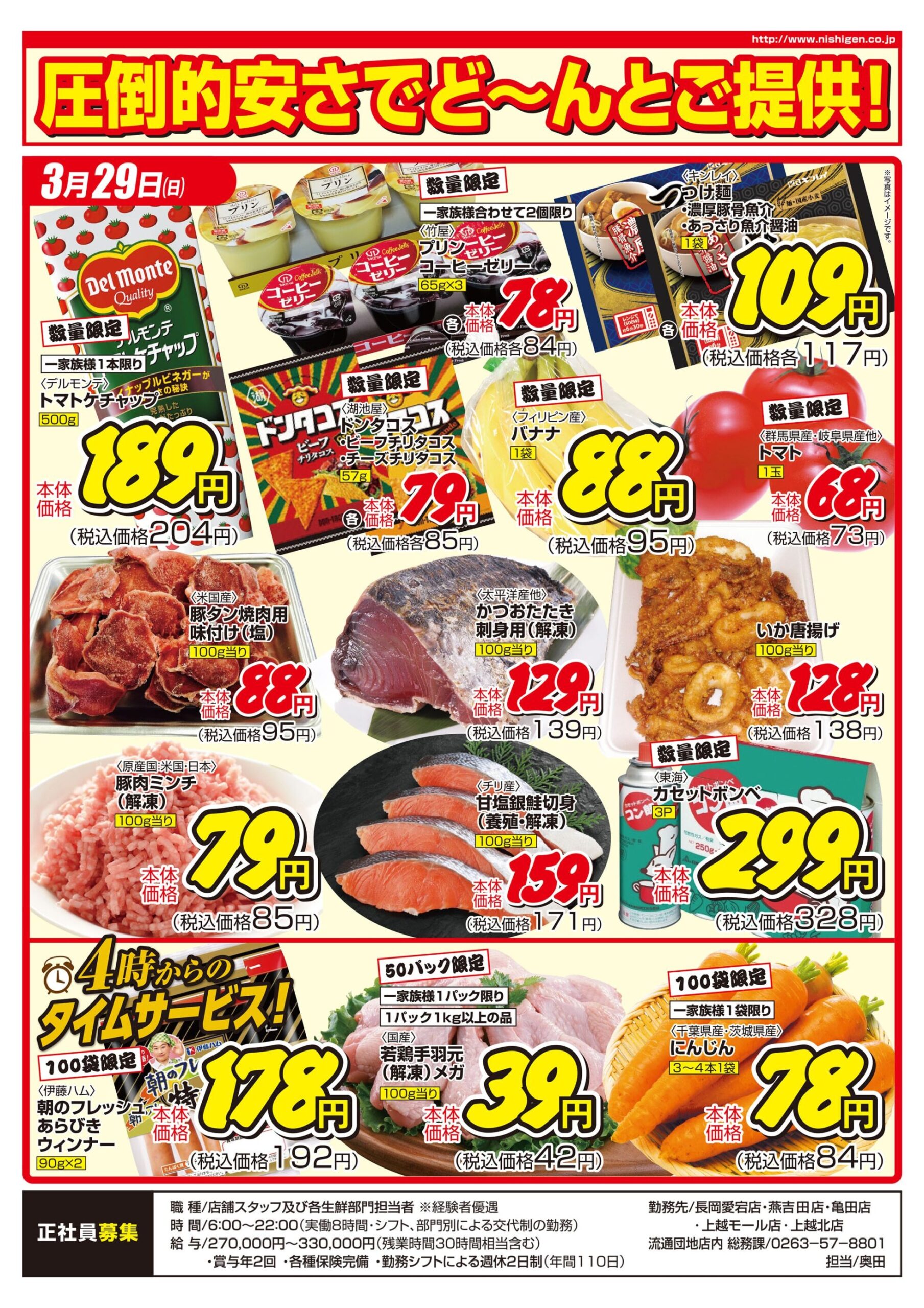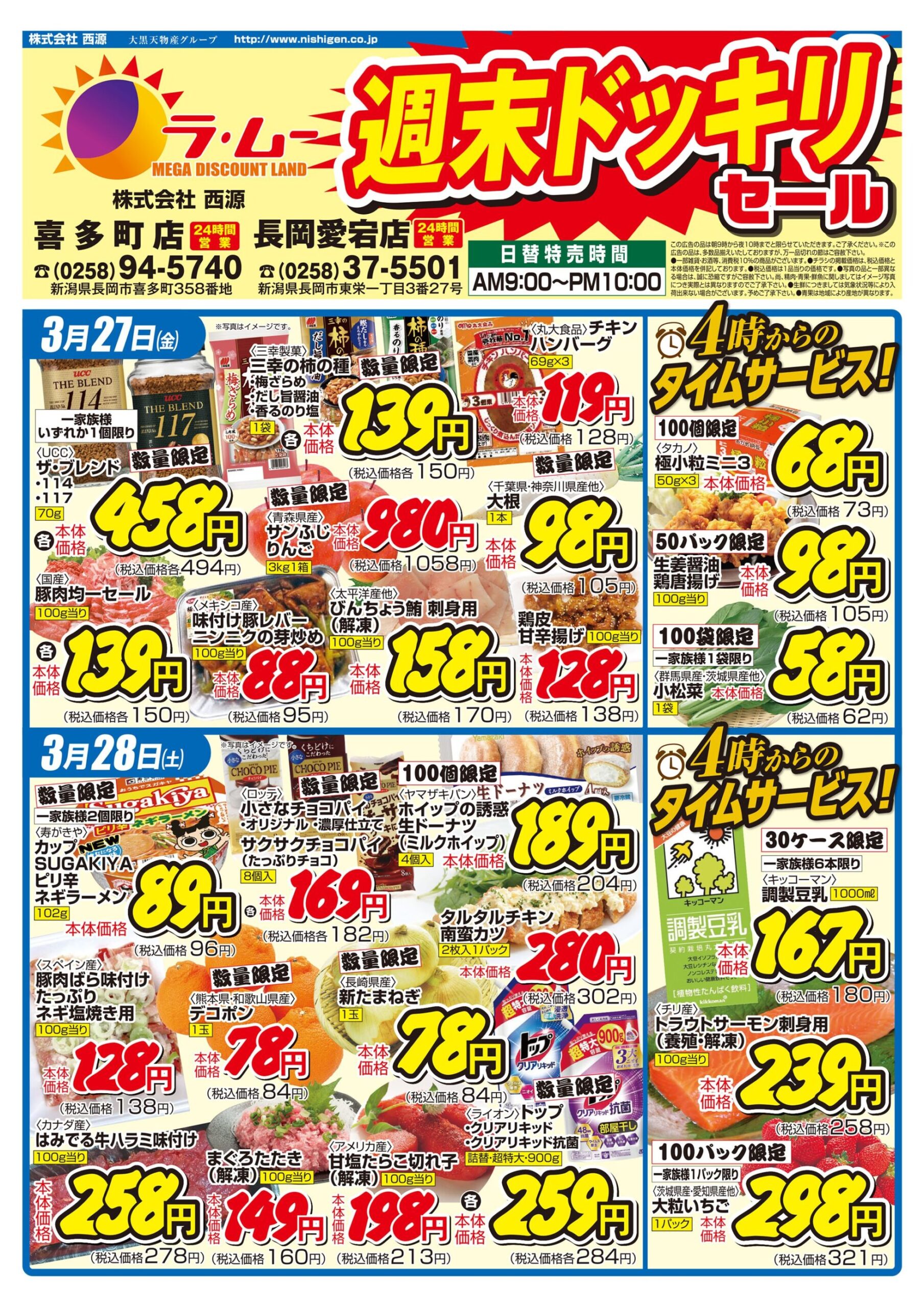 【ラ・ムー喜多町店・長岡愛宕店チラシ】週末ドッキリセール 掲載期間:2026年3月27日〜2026年3月29日 中越 スーパーラ・ムー 画像をクリックして拡大 prev next セール・新店情報を見逃さない! ガタチラをホーム画面に追加して、 最新情報をすぐチェック▶追加方法はかんたん♪ 関連 タイムセールに行かなきゃ♪