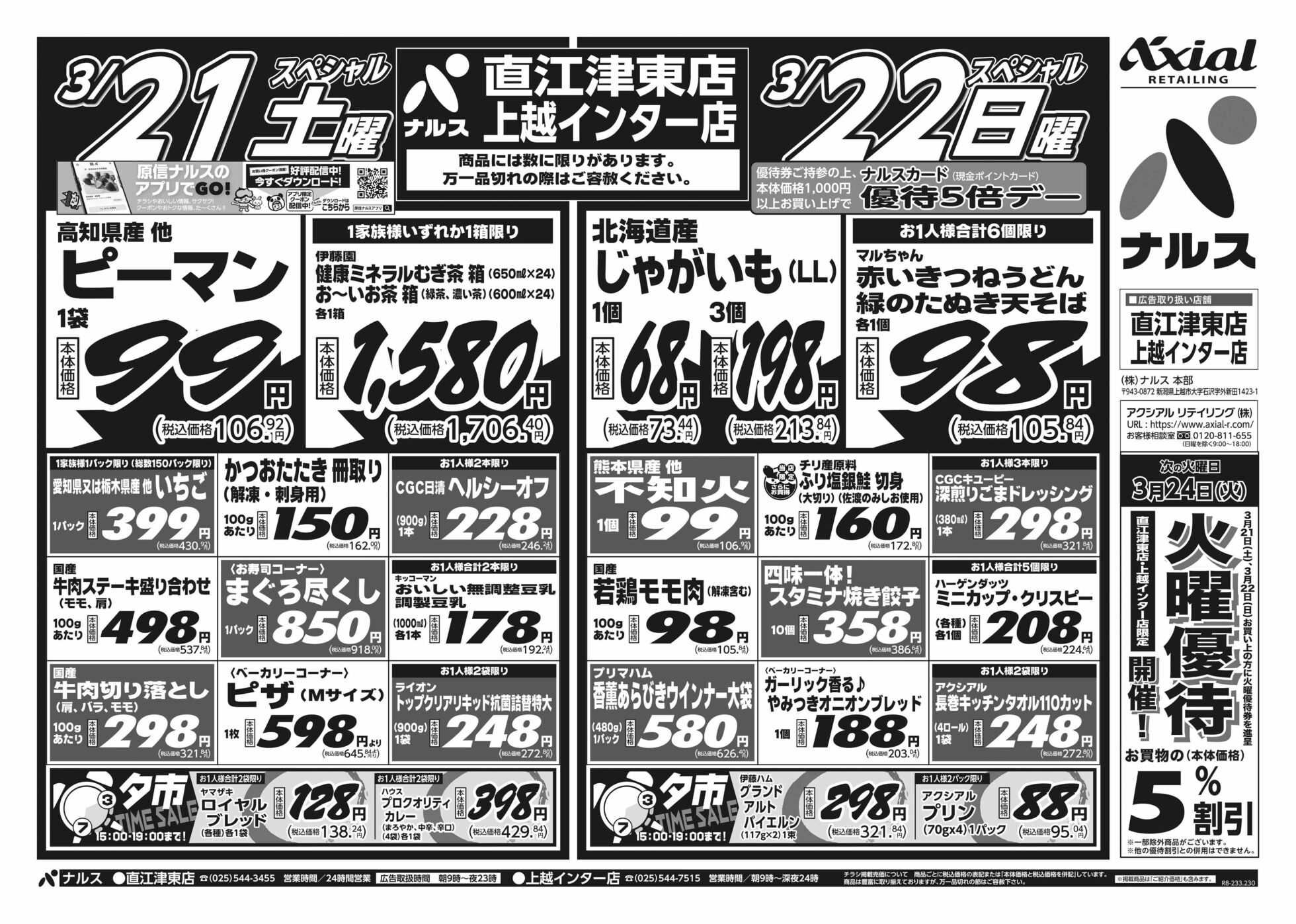 原信ナルス 【原信ナルス直江津東店・上越インター店チラシ】土曜スペシャル/日曜スペシャル/月曜スペシャル 掲載期間:2026年3月21日〜2026年3月23日 上越 スーパー原信ナルス 画像をクリックして拡大 prev next 対象:直江津東店・上越インター店 セール・新店情報を見逃さない! ガタチラをホーム画面に追加して、 最新情報をすぐチェック▶追加方法はかんたん♪ 関連 ピーマンで肉詰めでも作ろうかしら~♪