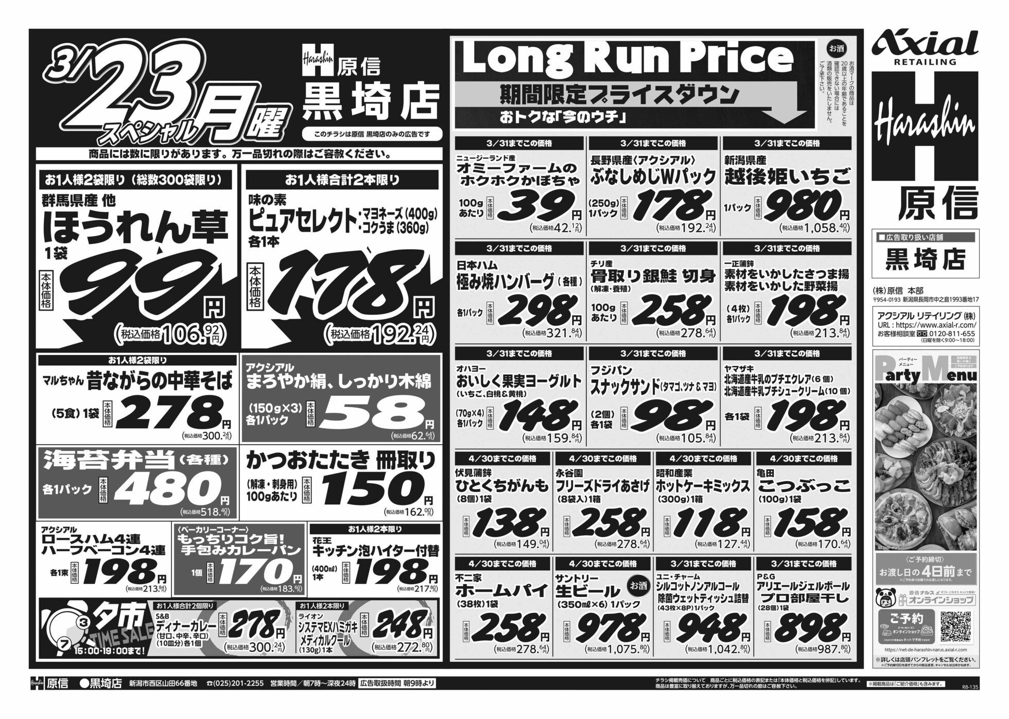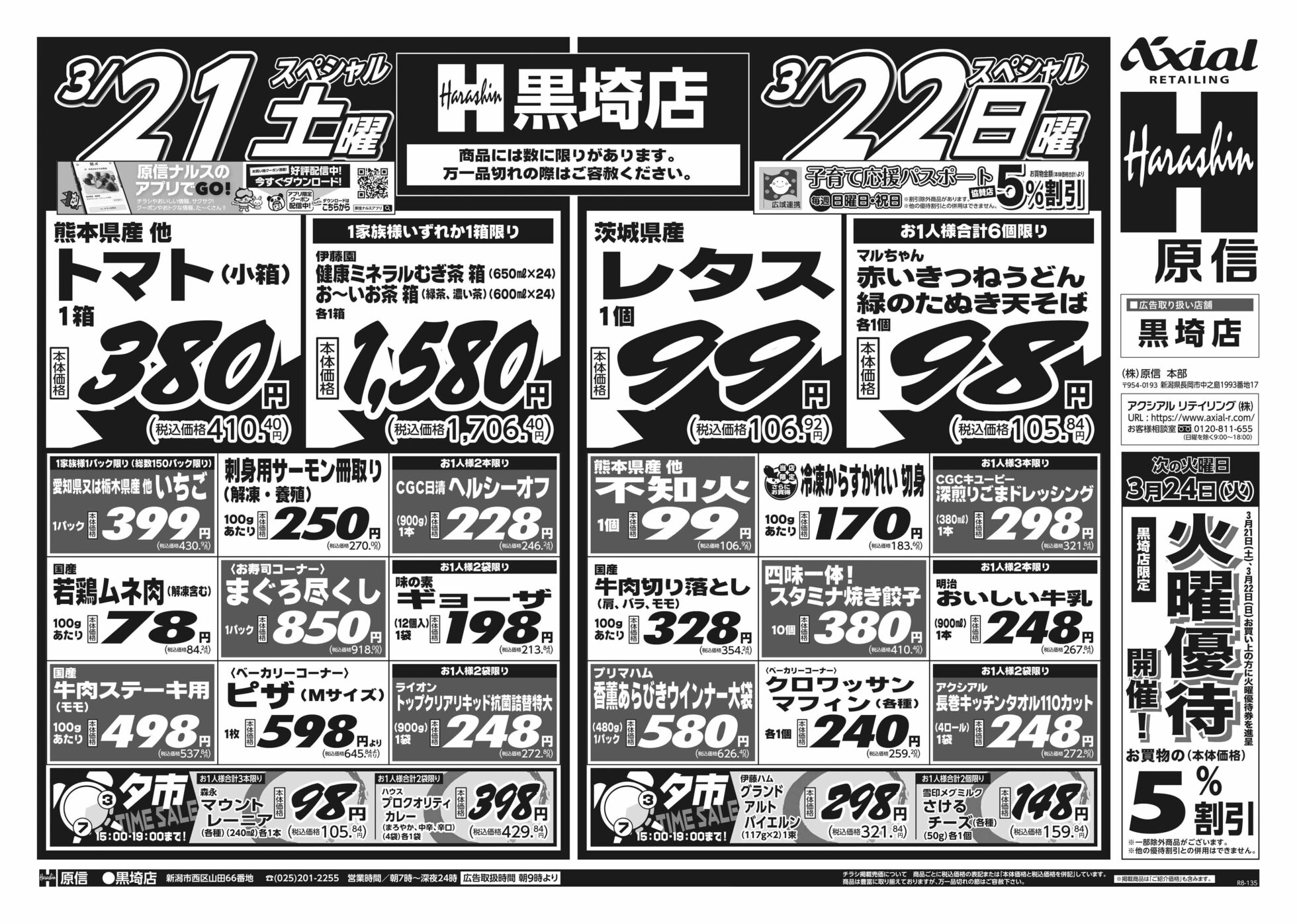 原信ナルス 【原信ナルス黒埼店チラシ】土曜スペシャル/日曜スペシャル/月曜スペシャル 掲載期間:2026年3月21日〜2026年3月23日 新潟市 スーパー原信ナルス 画像をクリックして拡大 prev next セール・新店情報を見逃さない! ガタチラをホーム画面に追加して、 最新情報をすぐチェック▶追加方法はかんたん♪ 関連 レタスがお買得ね♪