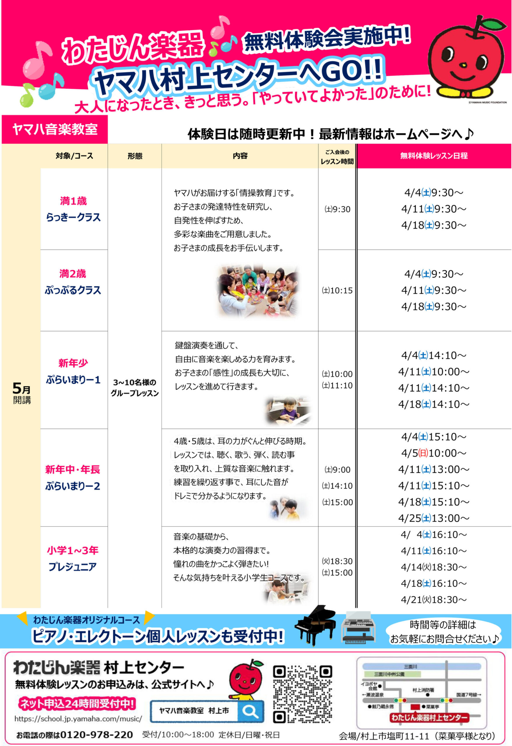 わたじん楽器村上センター 【わたじん楽器村上センターチラシ】春の体験レッスン 掲載期間:2026年3月22日〜2026年4月20日 下越 生活サービス 画像をクリックして拡大 prev next セール・新店情報を見逃さない! ガタチラをホーム画面に追加して、 最新情報をすぐチェック▶追加方法はかんたん♪ 関連 まずは体験レッスンね♪