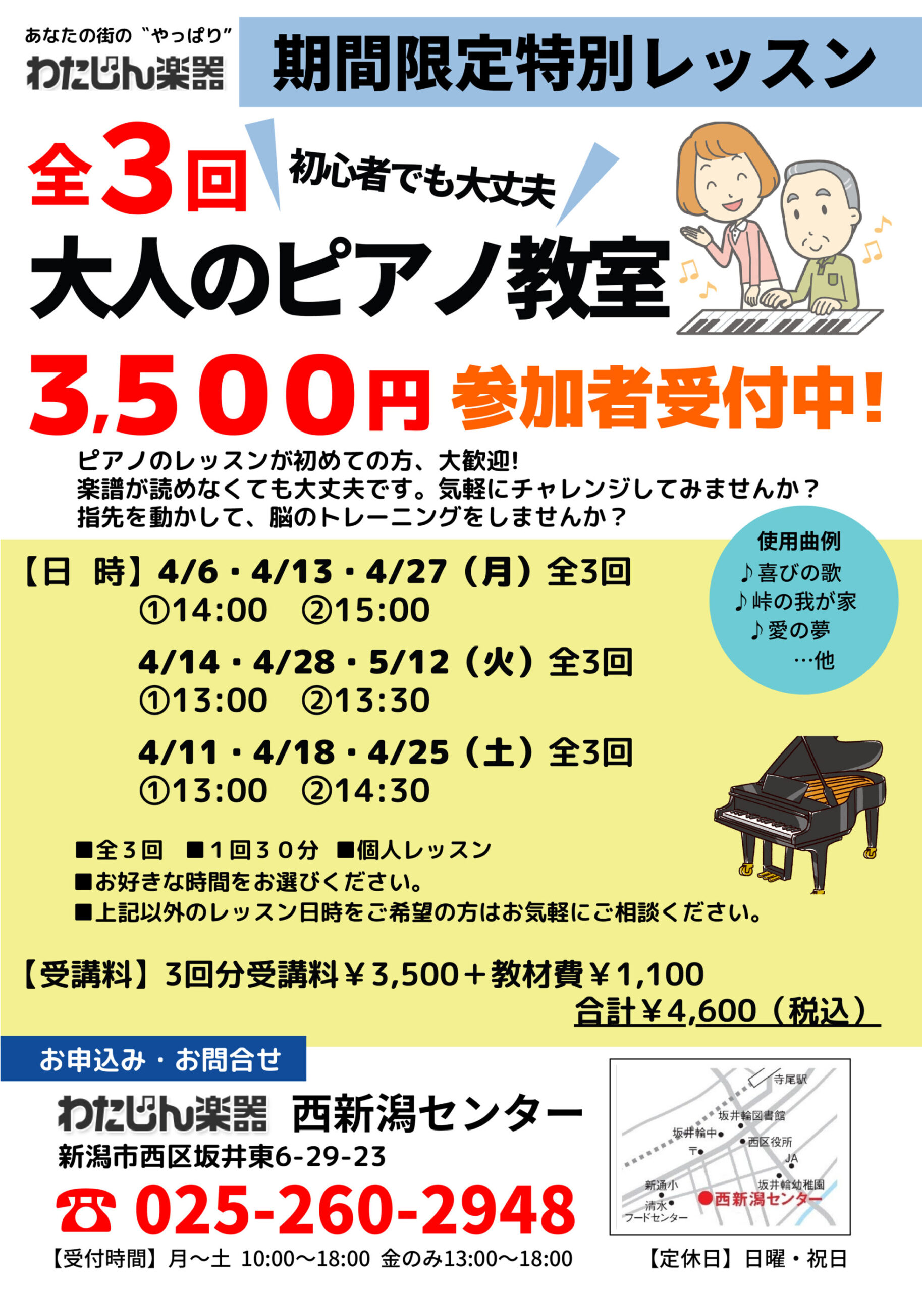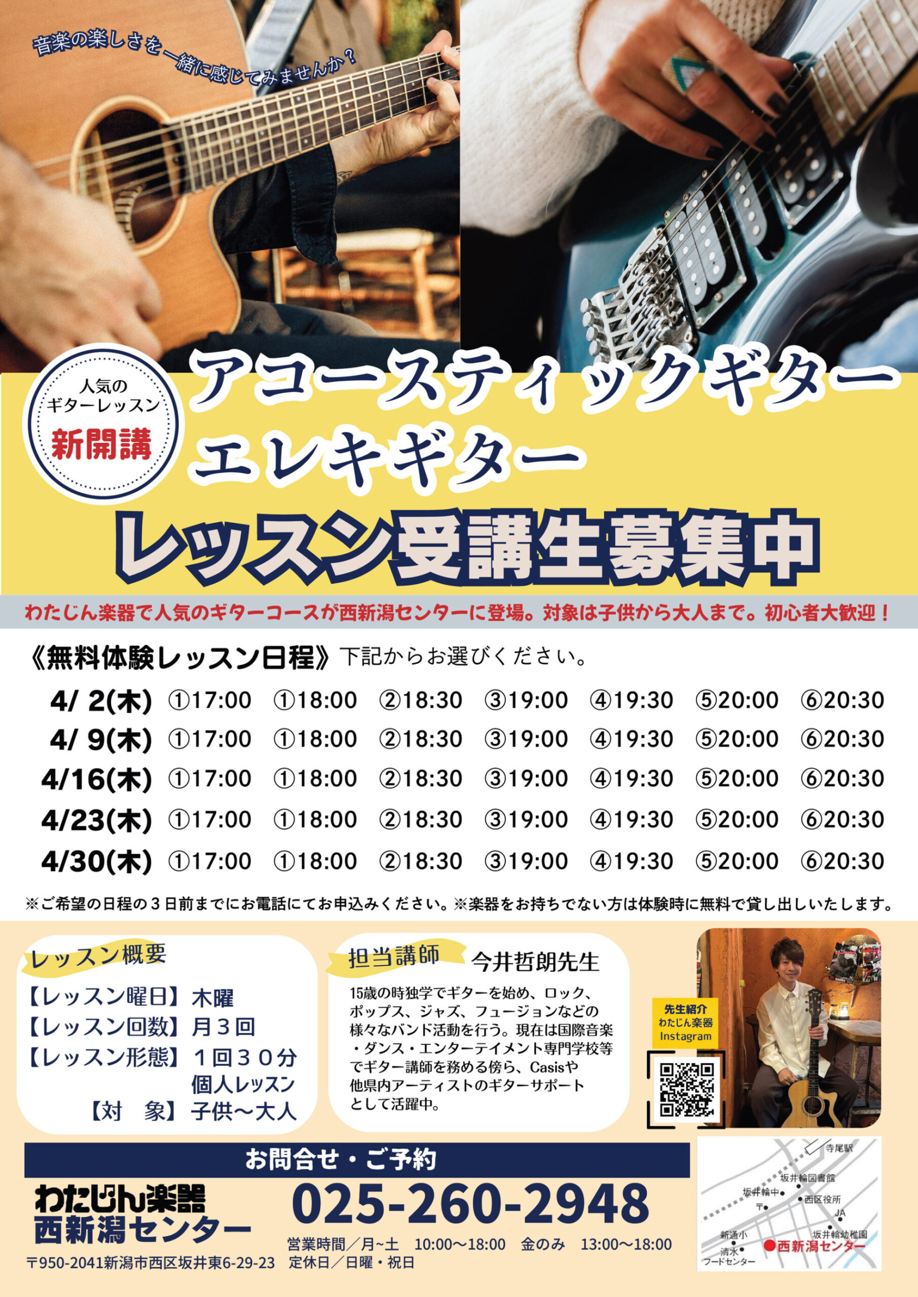 【わたじん楽器西新潟センターチラシ】ギターレッスン受講生募集中