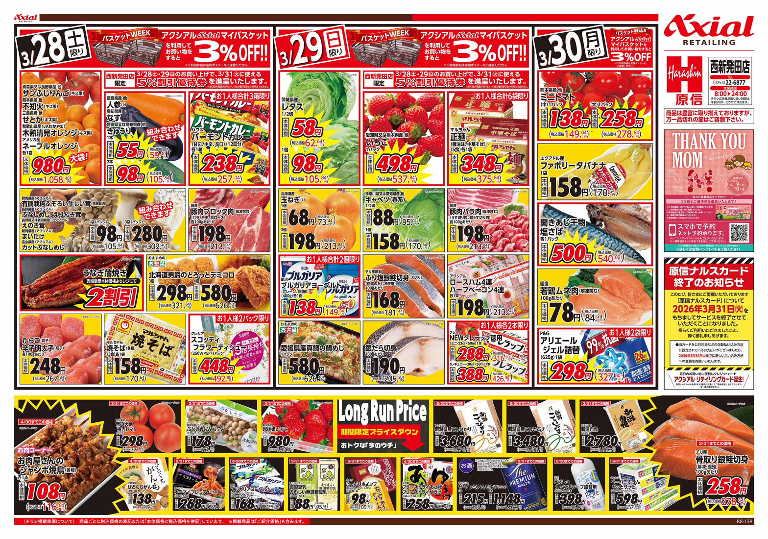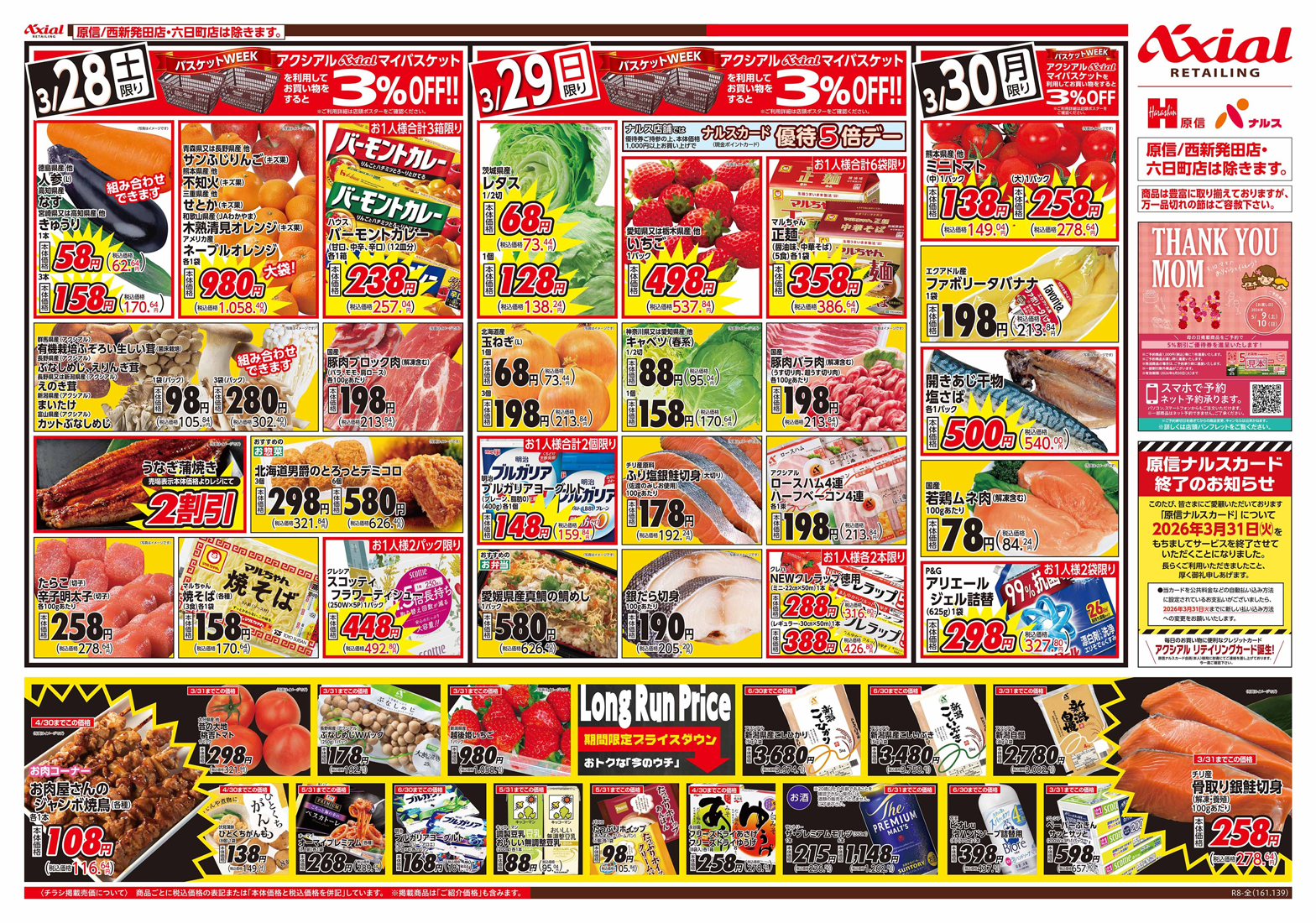 原信ナルス 【原信ナルスチラシ】はらナル ヒットパレード 掲載期間:2026年3月28日〜2026年3月30日 上越中越新潟市下越 スーパー原信ナルス 目次 全店 西新発田店 全店 画像をクリックして拡大 prev next 対象:全店(西新発田店・六日町店除く) 西新発田店 画像をクリックして拡大 prev next 対象:西新発田店のみ セール・新店情報を見逃さない! ガタチラをホーム画面に追加して、 最新情報をすぐチェック▶追加方法はかんたん♪ 関連 おいしそうなものがたくさん! どれを買うか迷っちゃうわ♪
