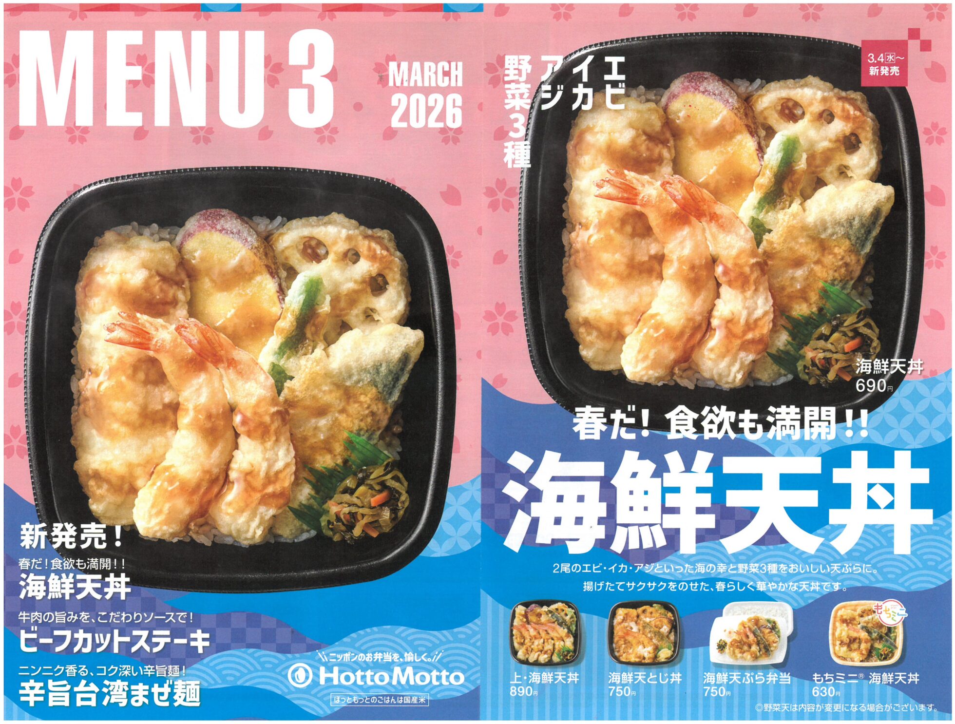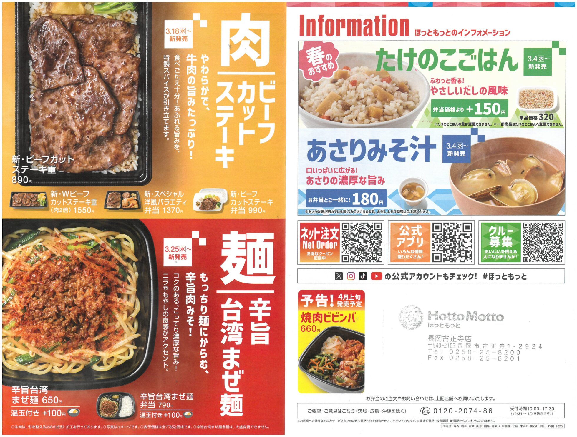ほっともっと長岡古正寺店 【ほっともっと長岡古正寺店チラシ】海鮮天丼/ビーフカットステーキ/辛旨台湾まぜ麺 掲載期間:2026年3月27日〜2026年3月31日 中越 グルメ 画像をクリックして拡大 prev next セール・新店情報を見逃さない! ガタチラをホーム画面に追加して、 最新情報をすぐチェック▶追加方法はかんたん♪ 関連 天丼おいしそう! 台湾まぜ麺も気になるわ~!