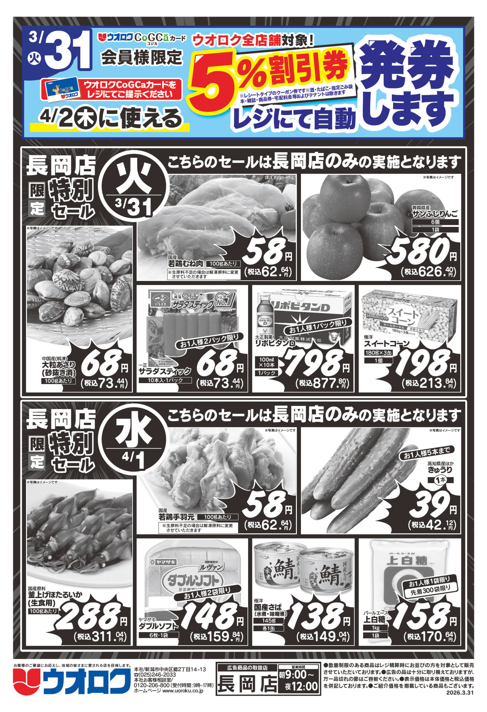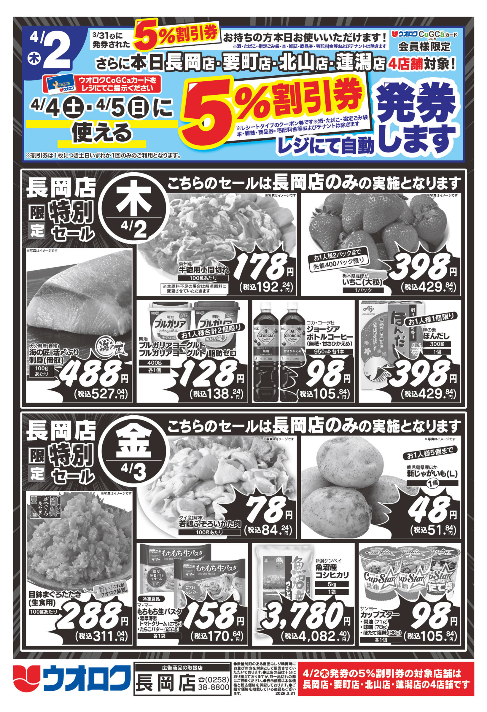 ウオロク 【ウオロク長岡店チラシ】特別セール 掲載期間:2026年3月31日〜2026年4月3日 中越 スーパーウオロク 画像をクリックして拡大 prev next セール・新店情報を見逃さない! ガタチラをホーム画面に追加して、 最新情報をすぐチェック▶追加方法はかんたん♪ 関連 会員になってお得に買い物しましょう♪