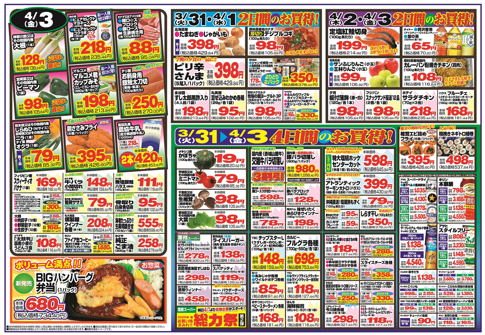 チャレンジャー 【チャレンジャーチラシ】4日間のお買得! 掲載期間:2026年3月31日〜2026年4月3日 中越新潟市下越 スーパーチャレンジャー 画像をクリックして拡大 prev next 対象店舗:燕三条店、中央インター店、新発田店、赤道店、寺尾店、海老ケ瀬店、小千谷店、北長岡店、巻店、田家店 セール・新店情報を見逃さない! ガタチラをホーム画面に追加して、 最新情報をすぐチェック▶追加方法はかんたん♪ 関連 新発売のBIGハンバーグ弁当は、ぜひいただきたいわね!